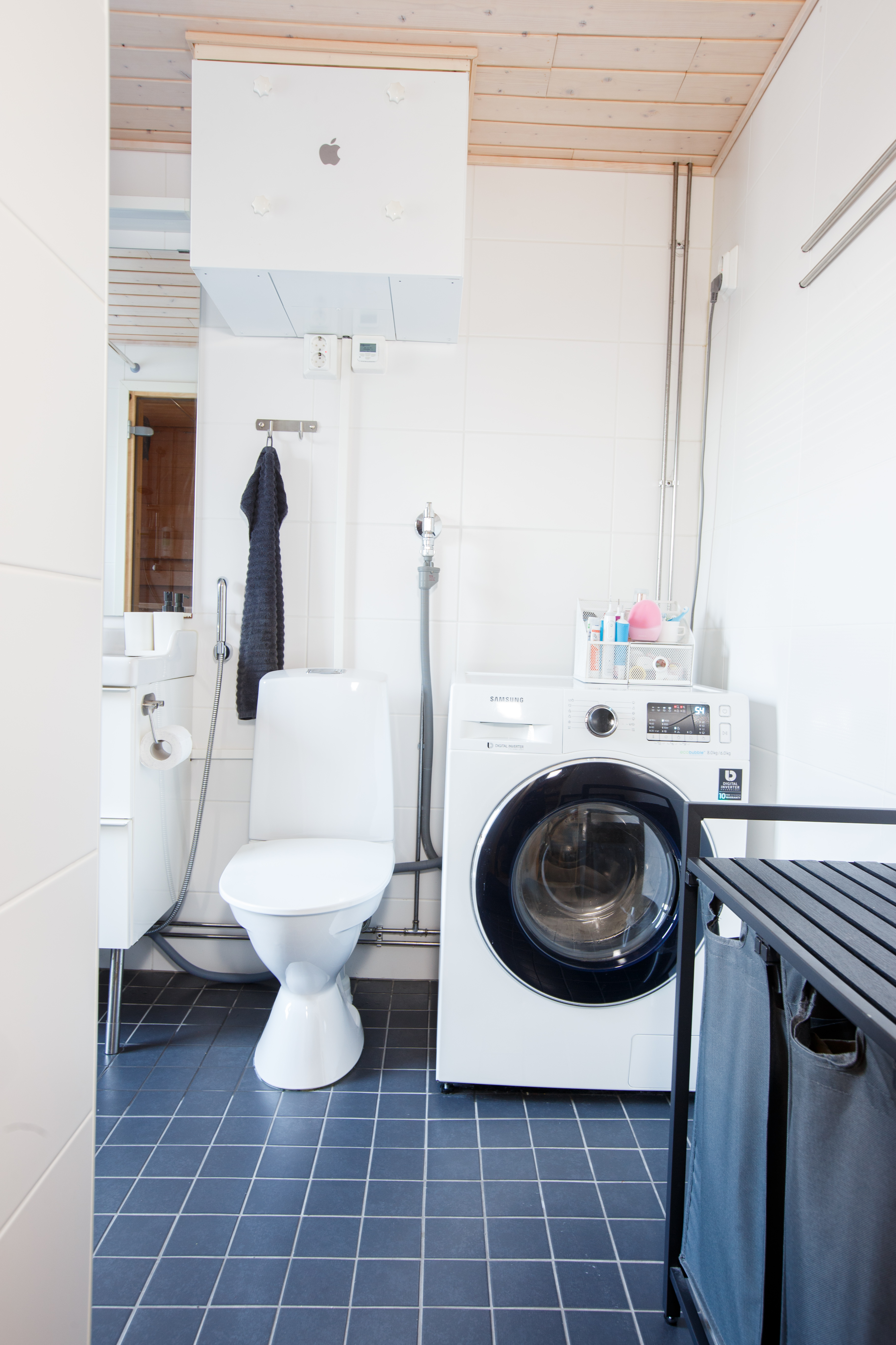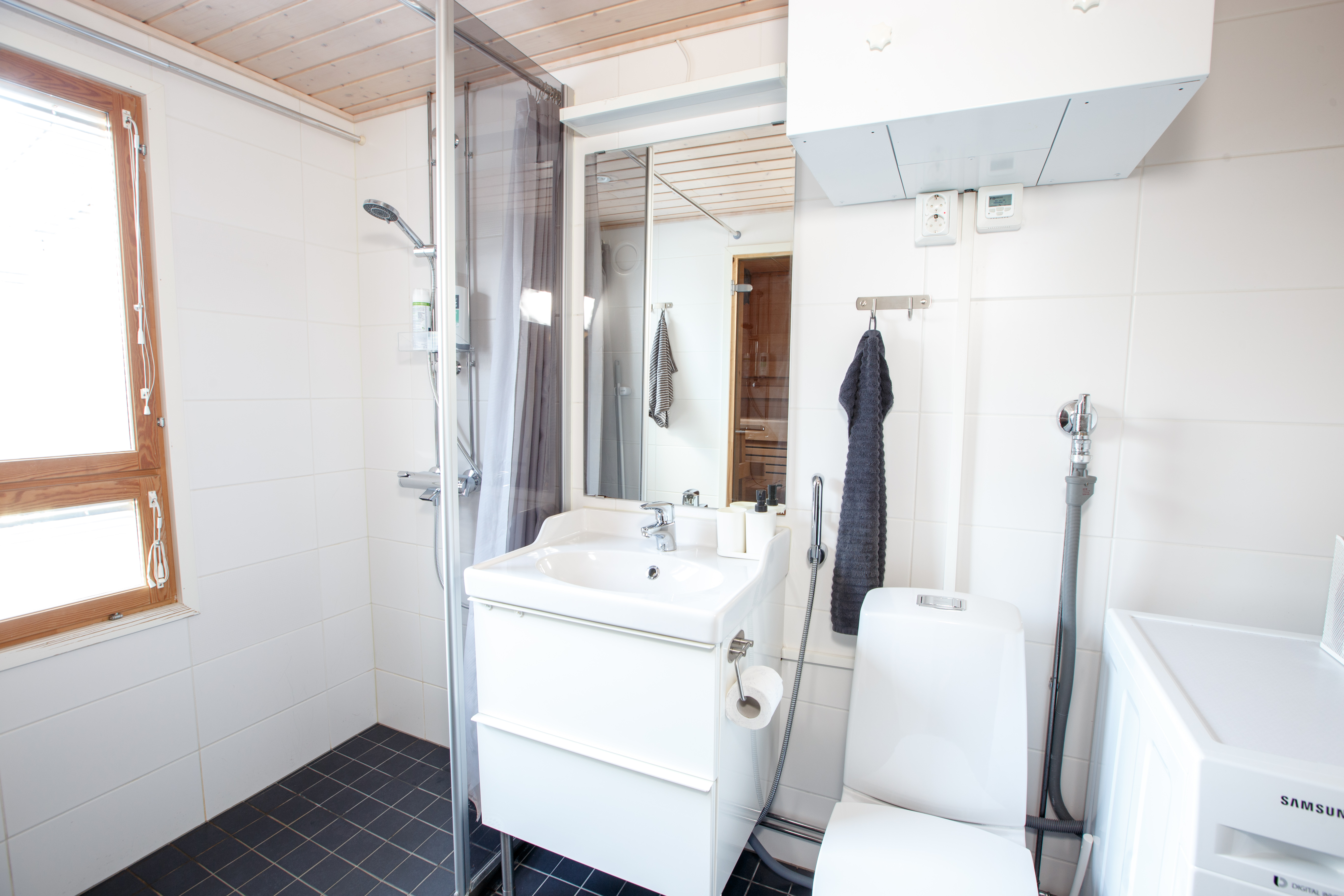 | Kylpyhuoneen kuvaus | Suihku, pesuallas, allaskaappi, peili, pesukoneliitäntä, wc-istuin, bidee-suihku ja lattialämmitys, seinät (kaakeli), lattiat (laatta) |