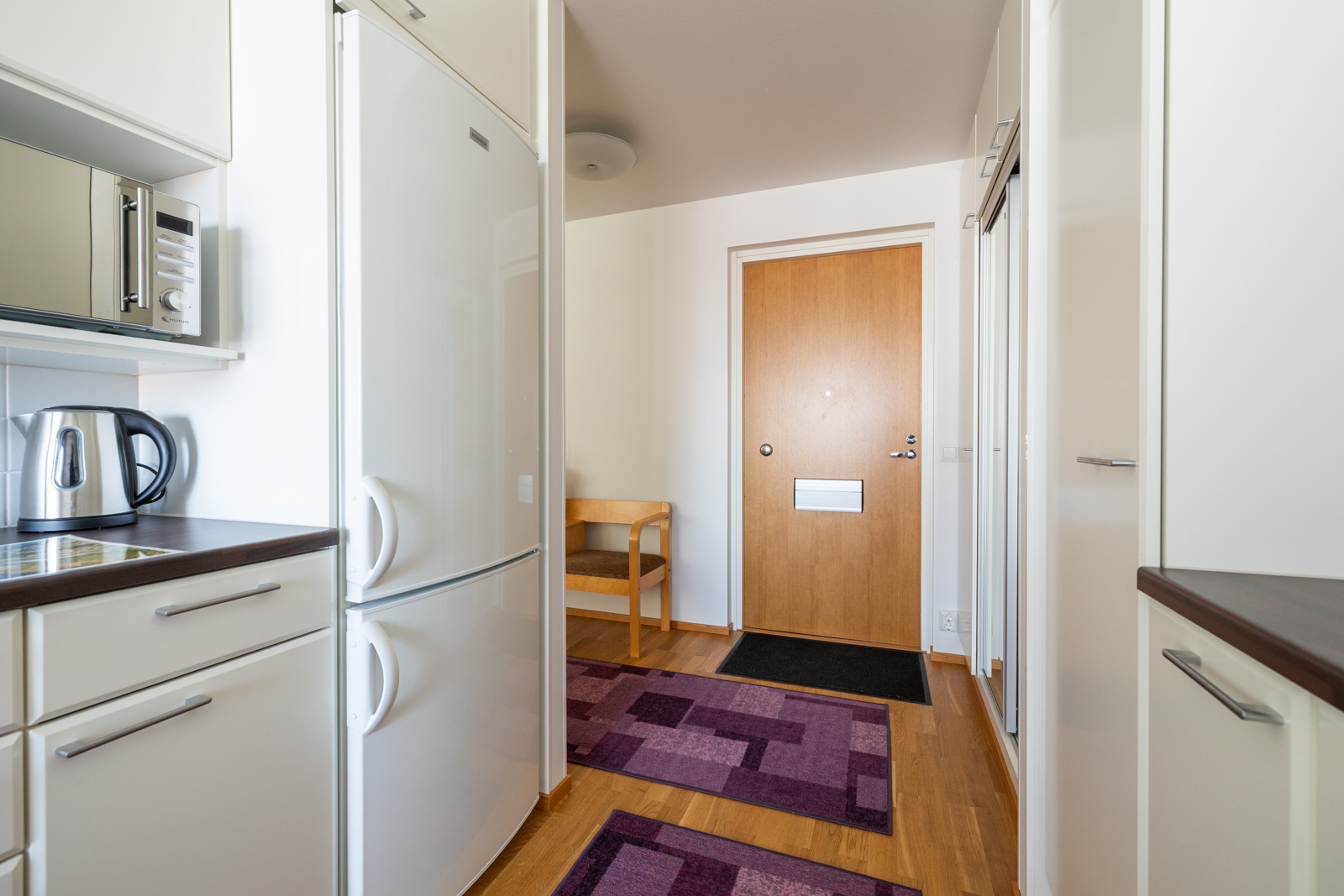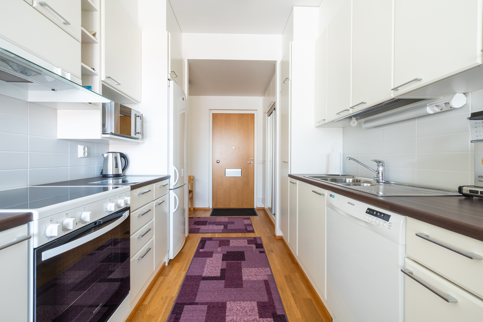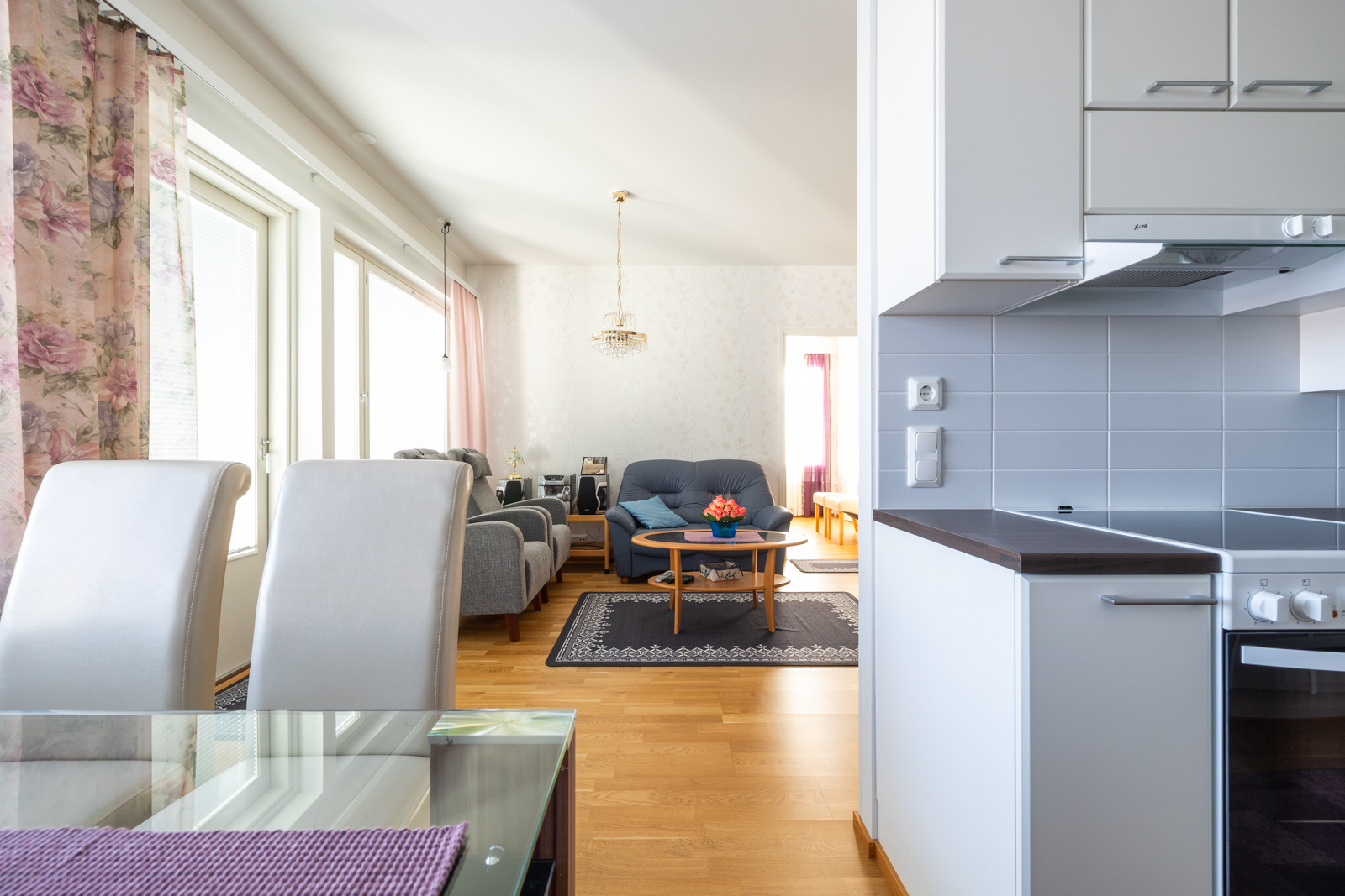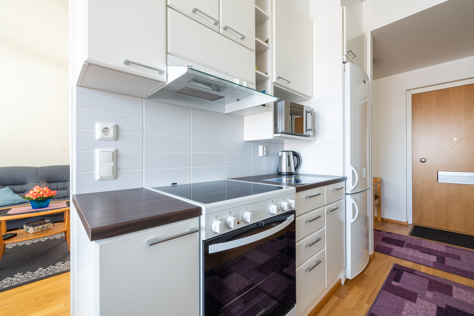 Liesi (Keraaminen liesi), seinät (tapetti), lattiat (parketti), astianpesukone, jääkaappipakastin, liesituuletin ja kiinteät valaisimet |