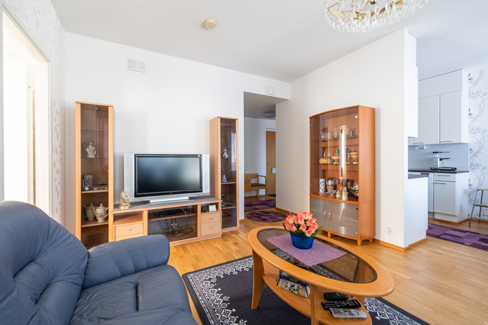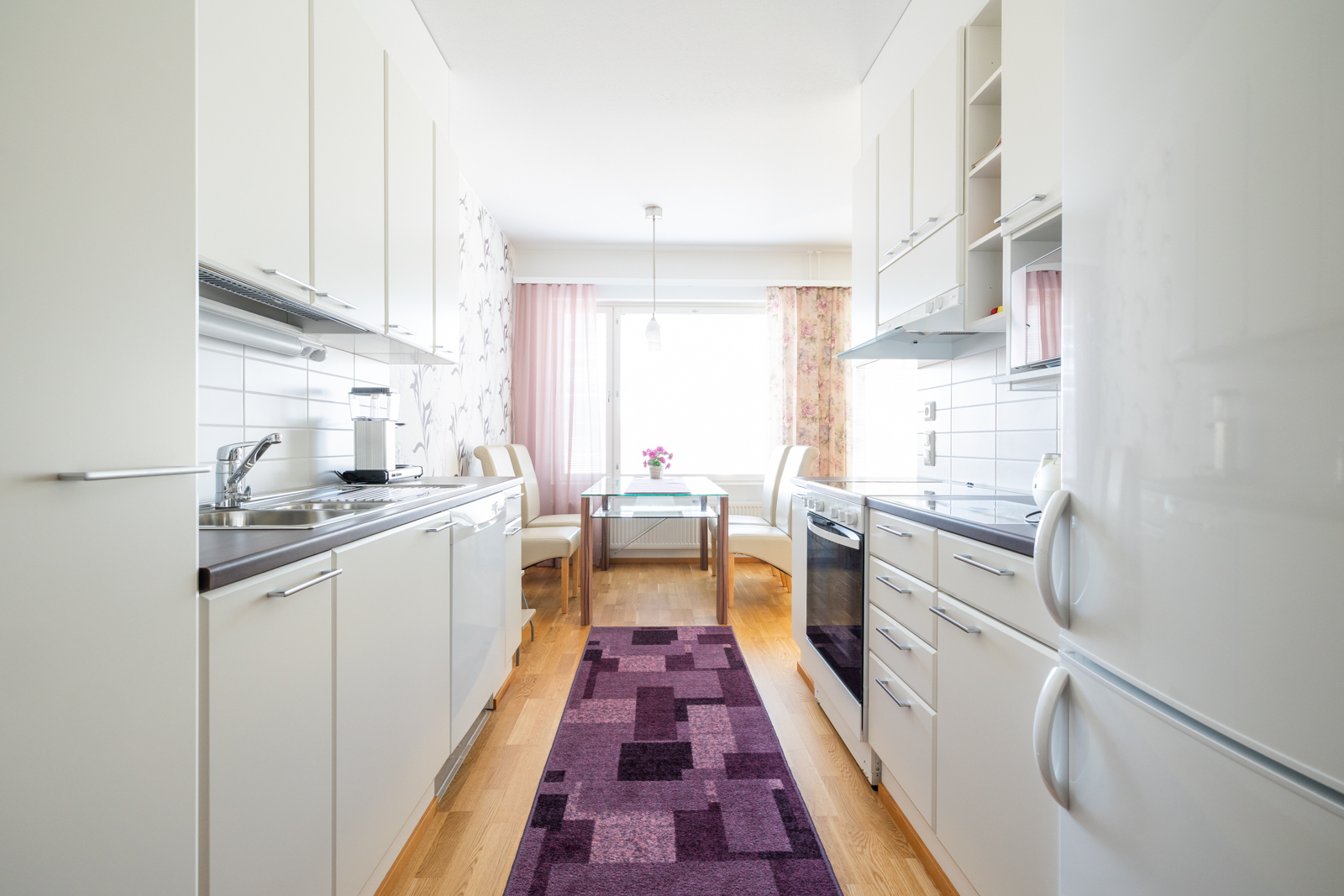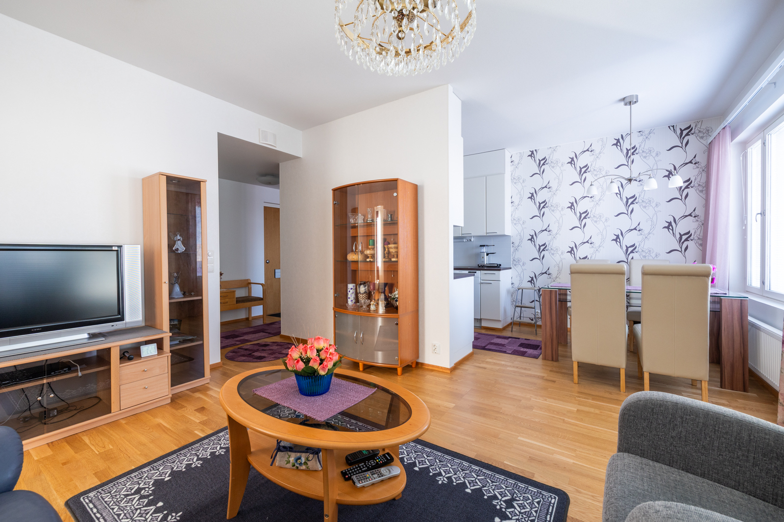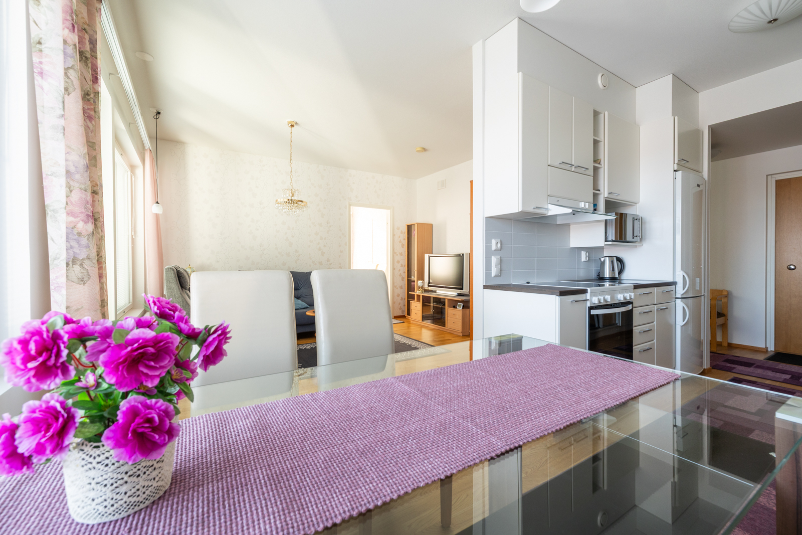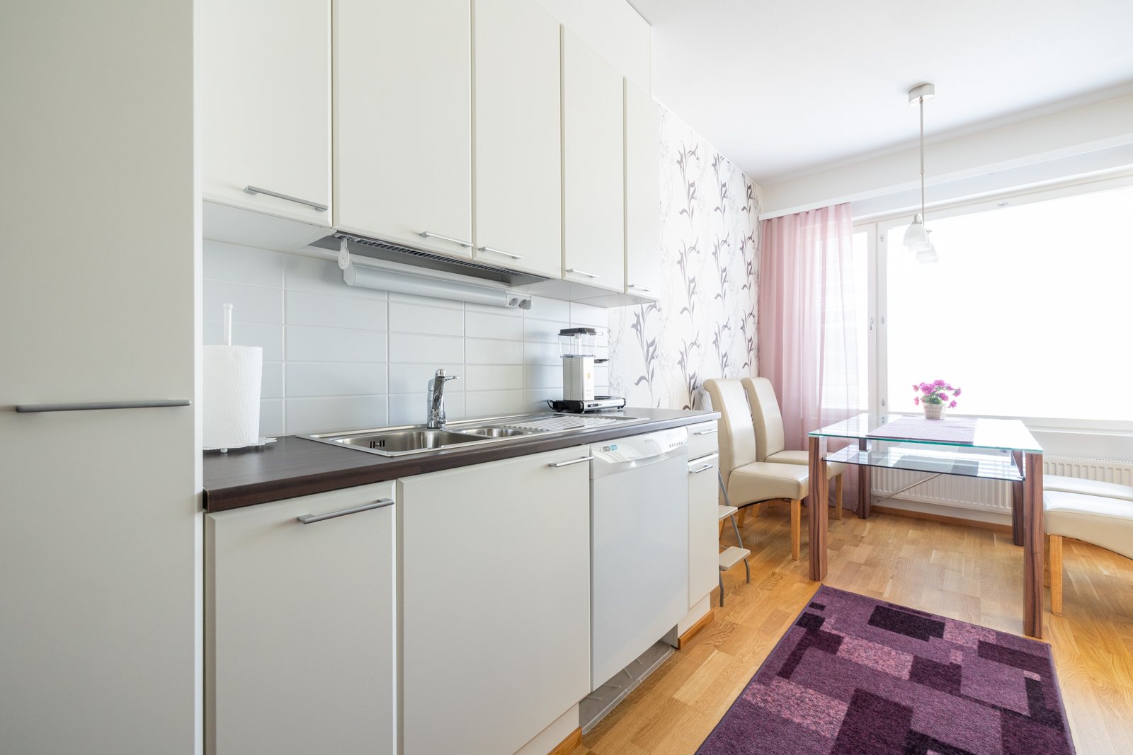 Liesi (Keraaminen liesi), seinät (tapetti), lattiat (parketti), astianpesukone, jääkaappipakastin, liesituuletin ja kiinteät valaisimet |