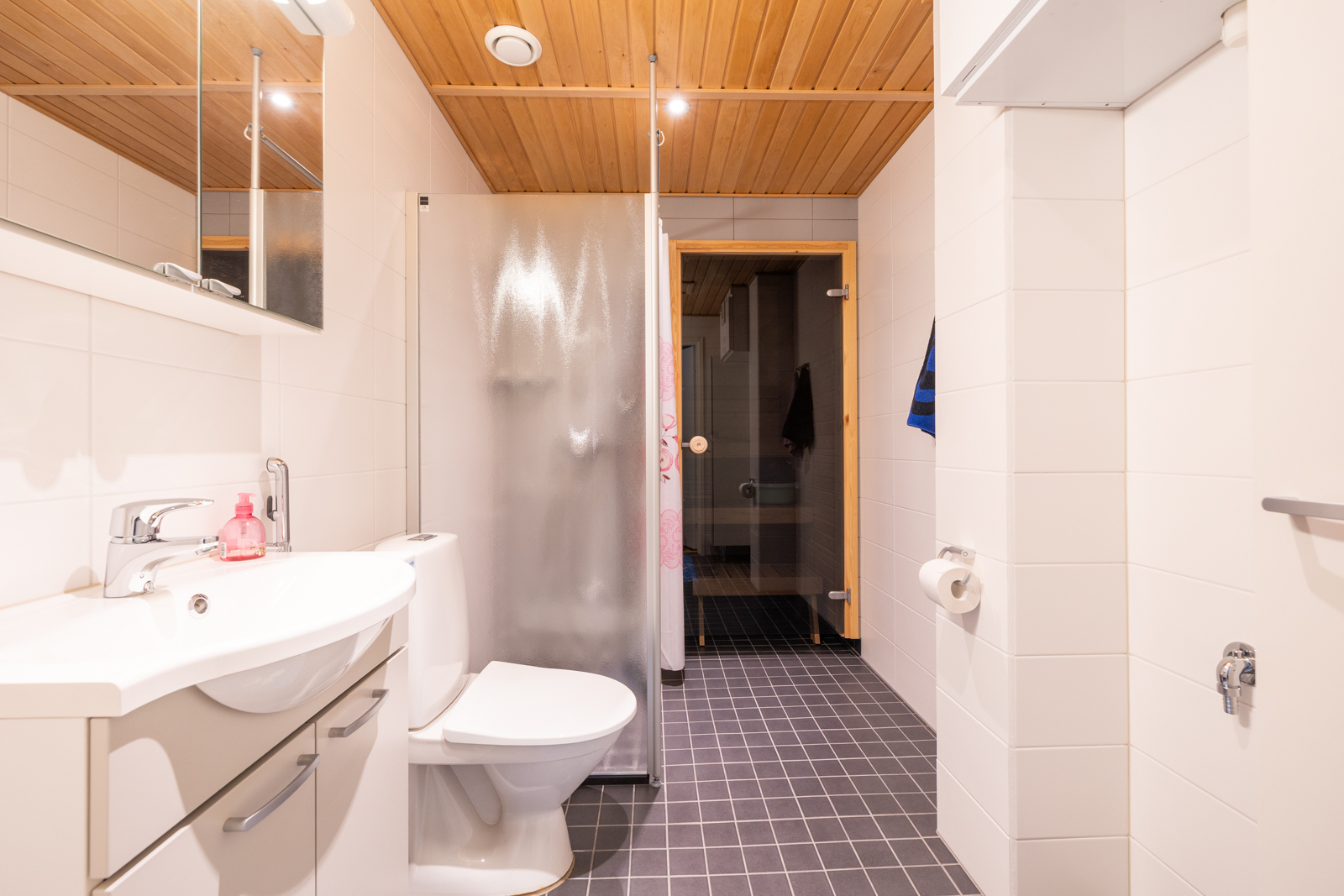 Pesukoneliitäntä, lattialämmitys, suihkuseinä, peilikaappi, allaskaappi, suihku, wc-istuin ja kiinteät valaisimet, seinät (kaakeli), lattiat (laatta) |