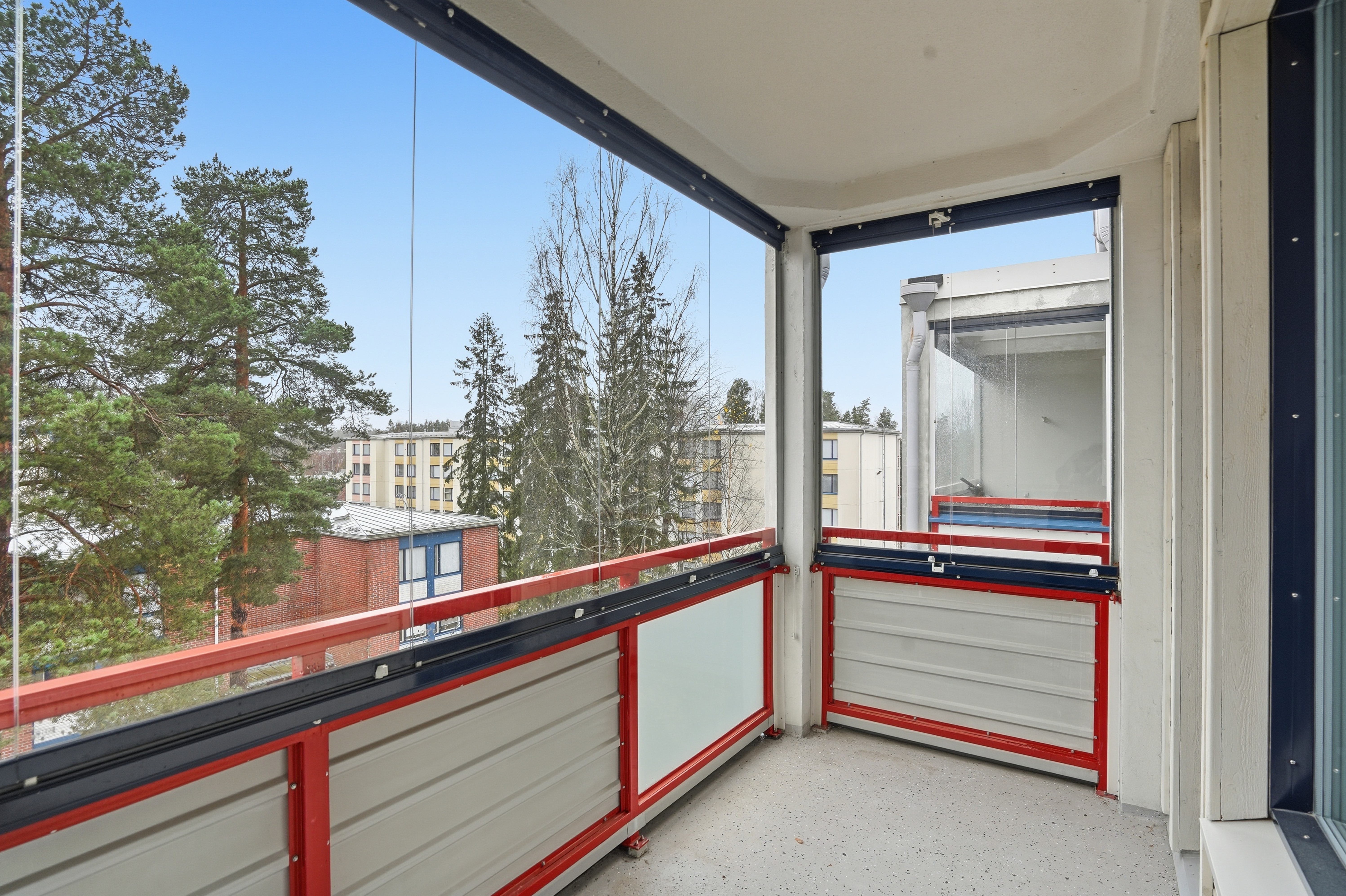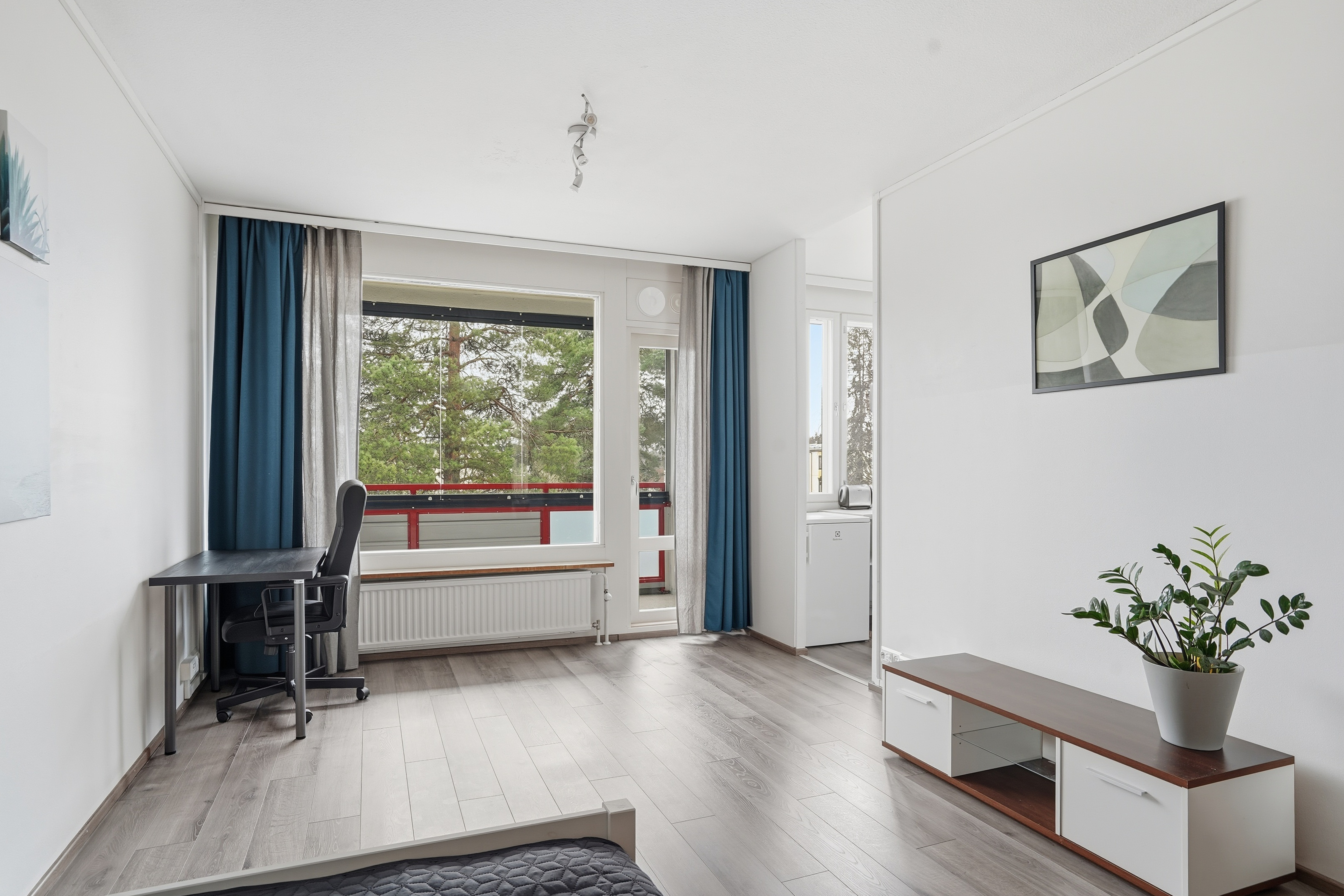 Asunnon tilat on käytetty tehokkaasti. Kompakti keittiökomero ja olohuoneesta on käynti lasitetulle parvekkeelle.