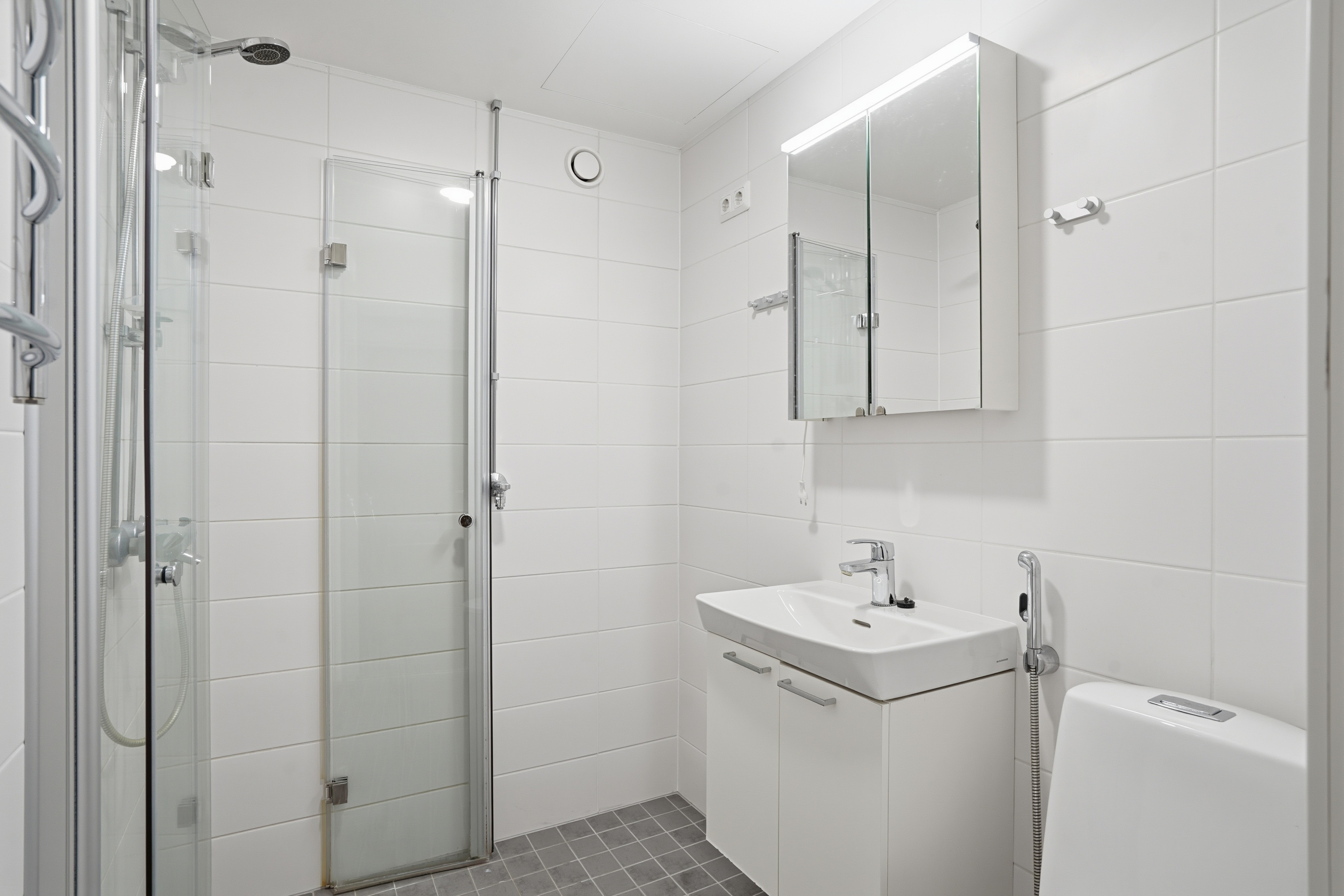 WC-istuin, suihku, suihkuseinä ja pesukoneliitäntä, seinät (kaakeli), lattiat (laatta) |