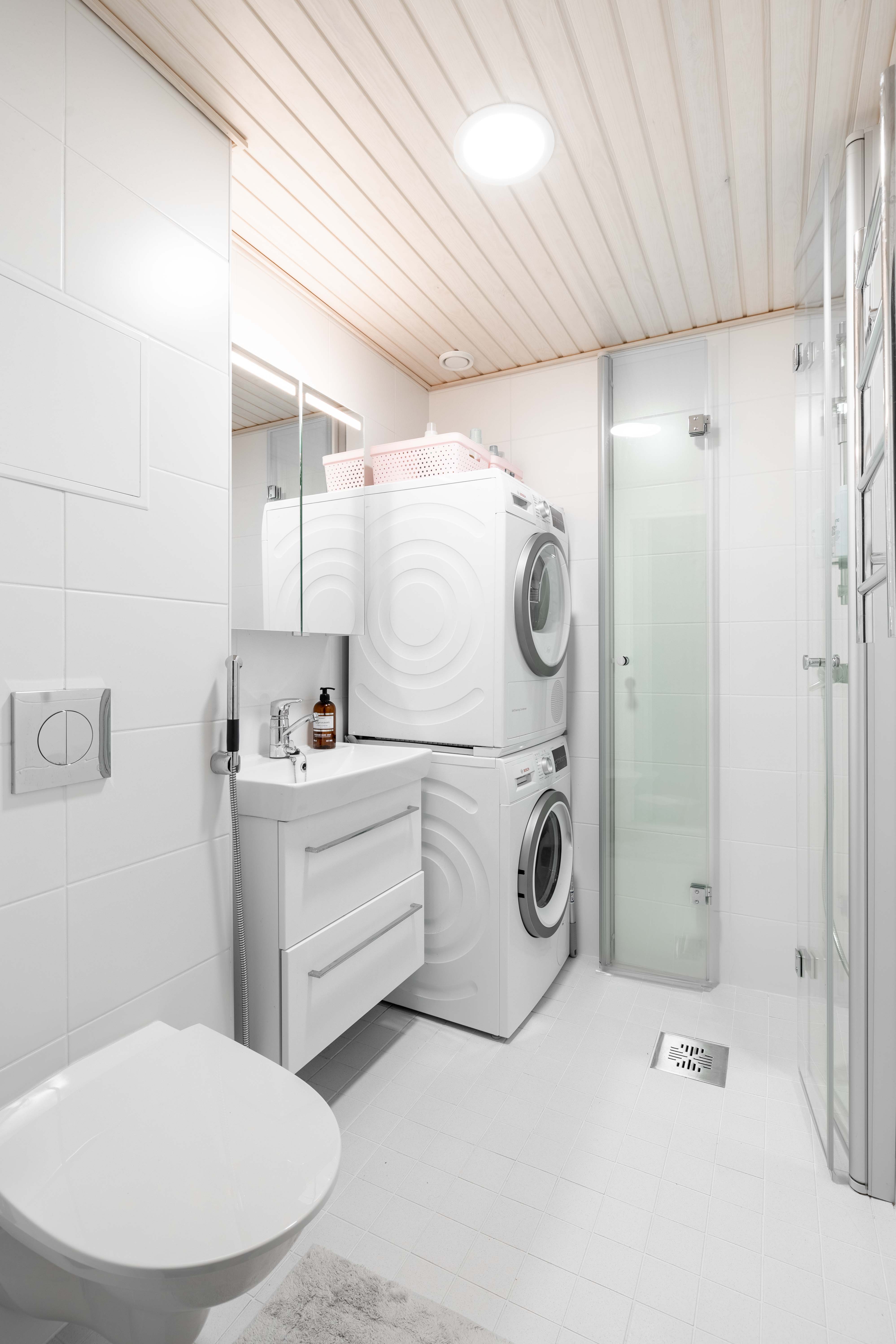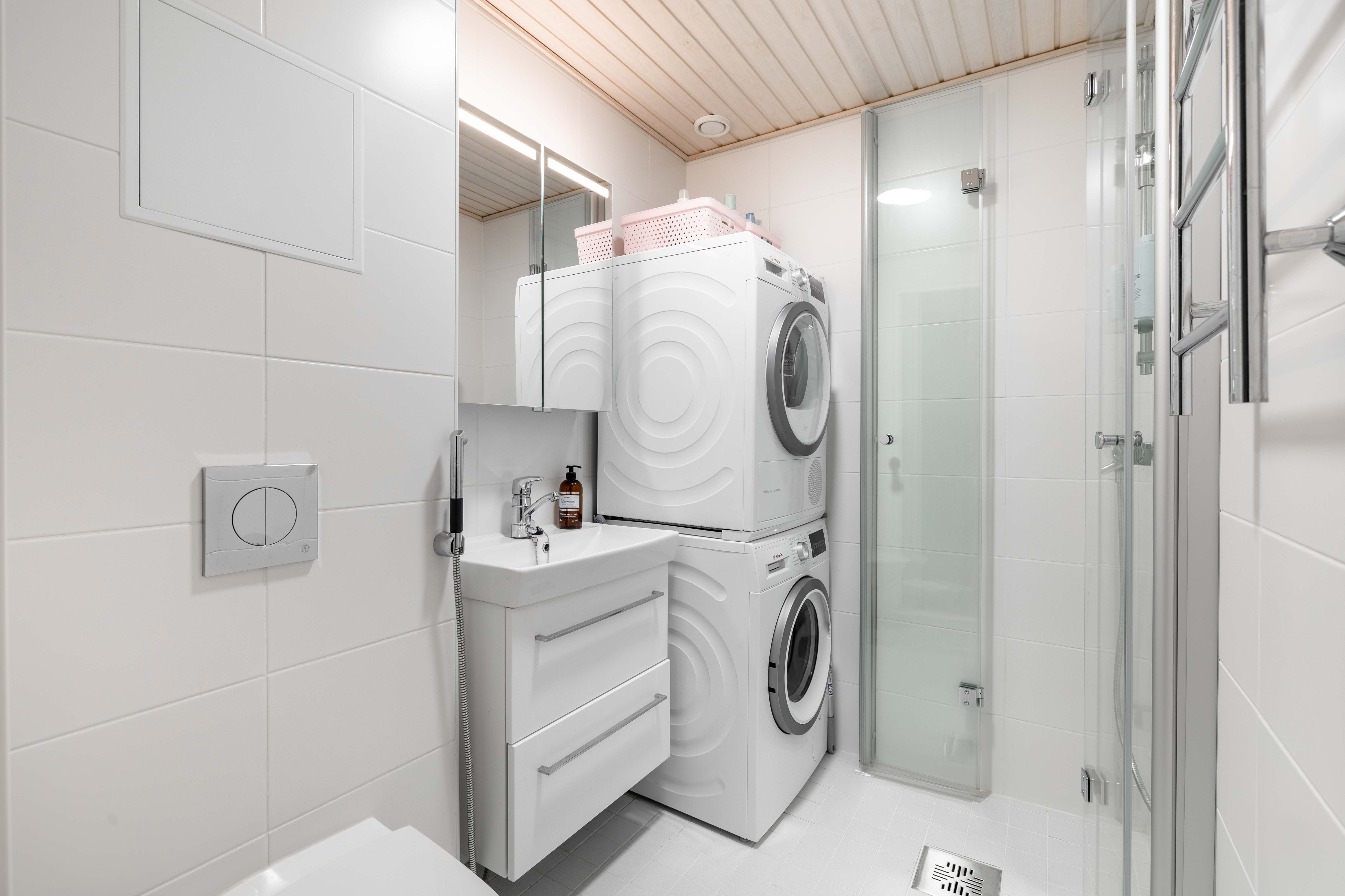 | Kylpyhuoneen kuvaus | WC-istuin, suihku, suihkuseinä, lattialämmitys ja peilikaappi, seinät (kaakeli), lattiat (laatta) |