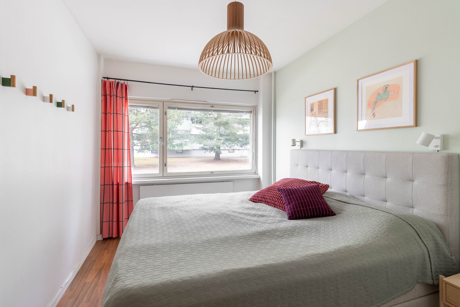 Makuuhuone on rauhallisella pihan puolella. Kylpyhuone on uusittu perinteisen putkiremontin yhteydessä ja sinne mahtuu pesukone.