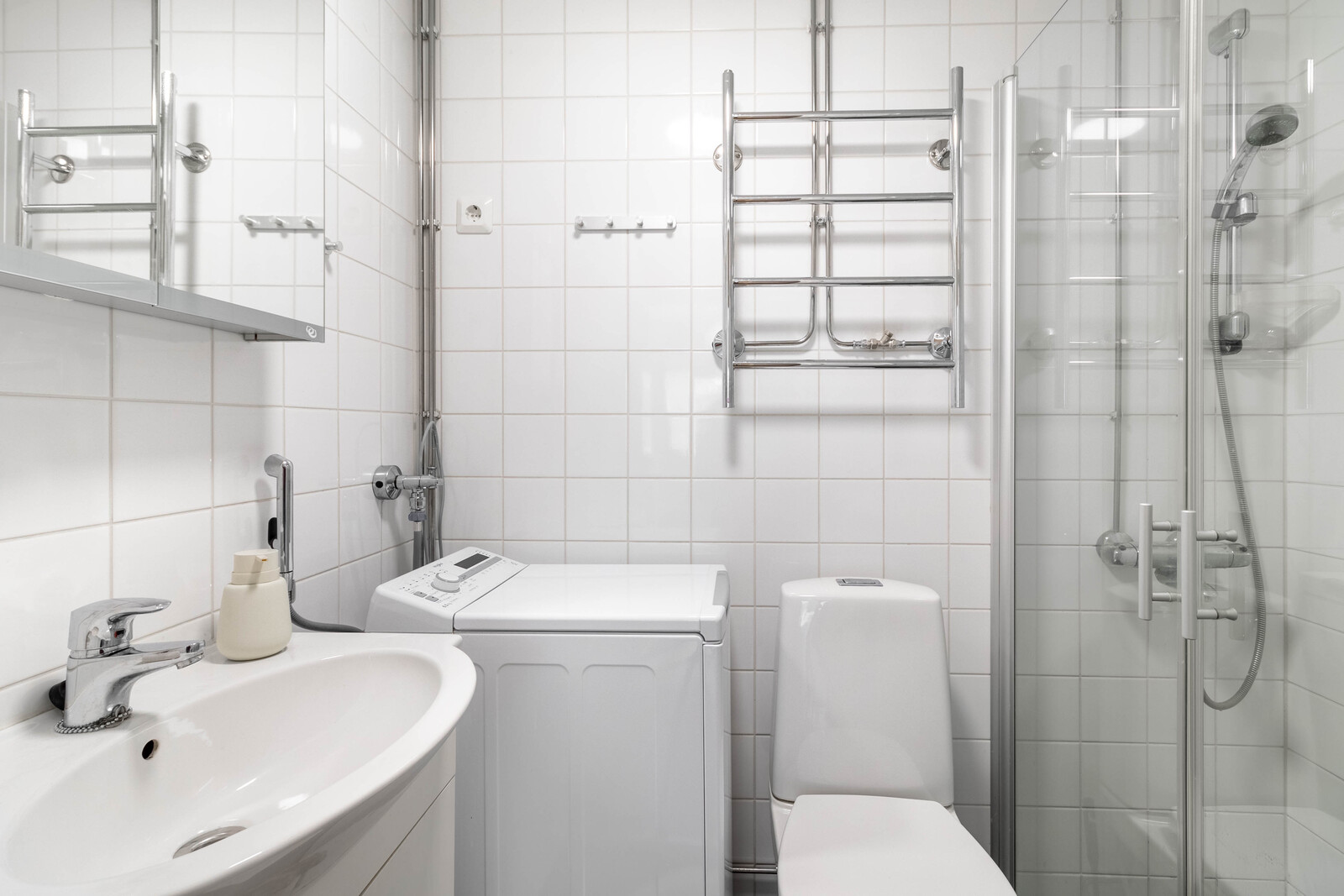 | Kylpyhuoneen kuvaus | Pesukoneliitäntä, lattialämmitys, peilikaappi, wc-istuin ja suihku, seinät (kaakeli), lattiat (laatta) |