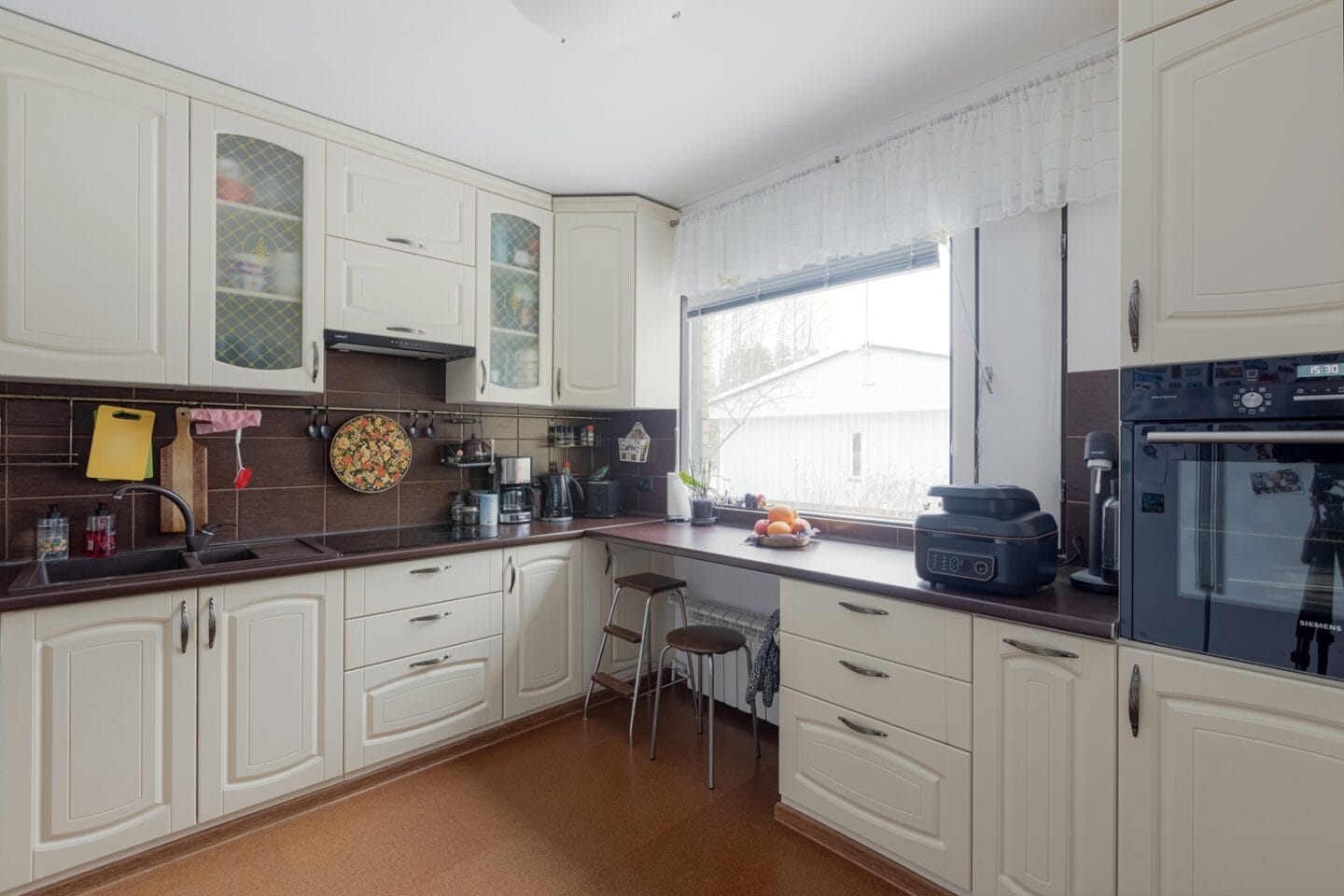 Liesi (Keraaminen liesi), työtasot (puu), seinät (maali), lattiat (korkki), jääkaappi, erillinen pakastin, liesituuletin, uuni ja astianpesukone |