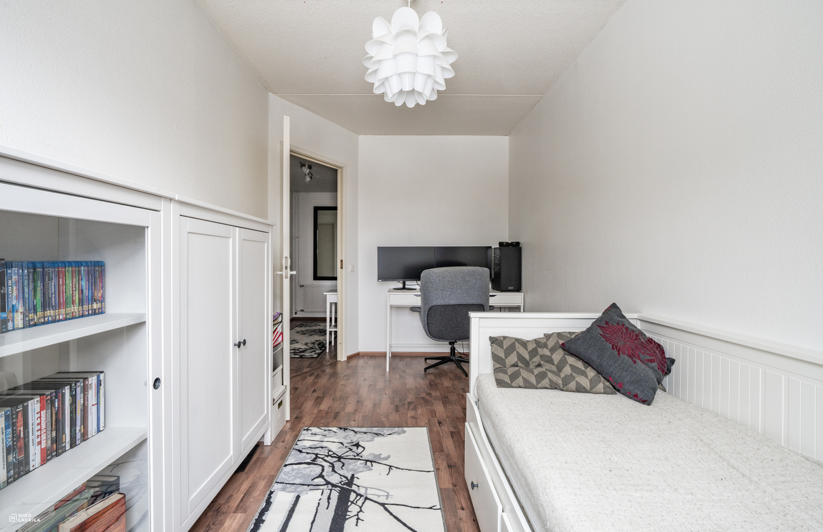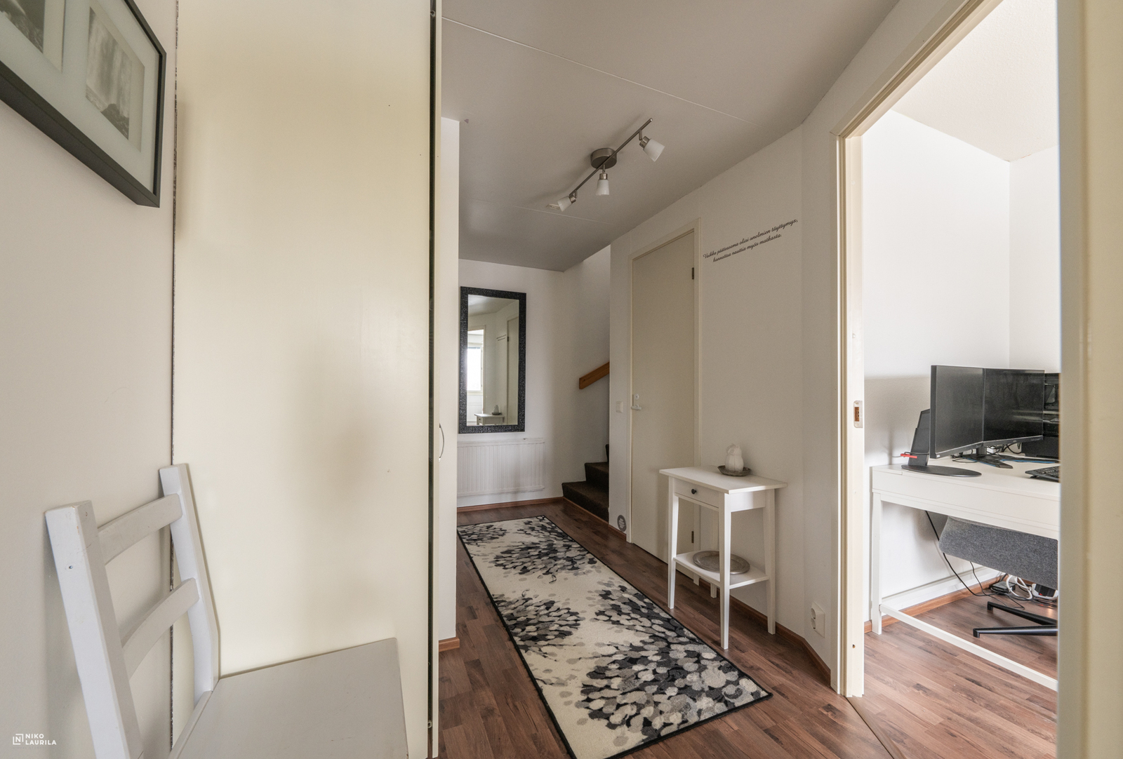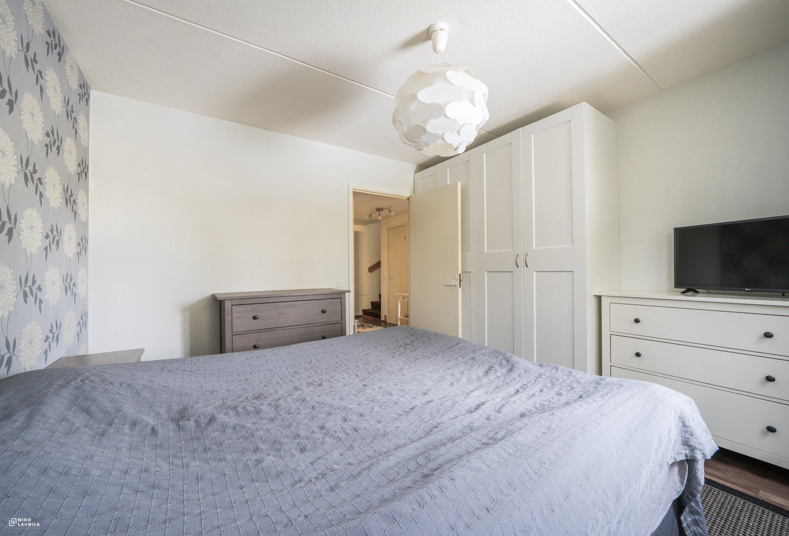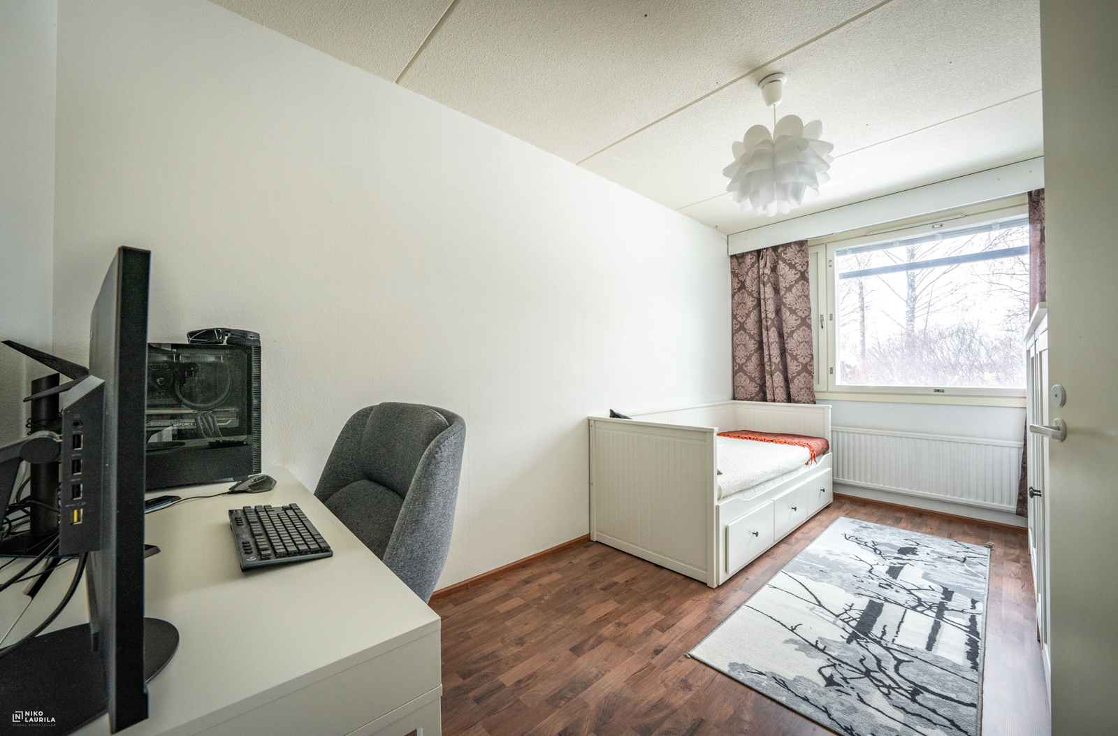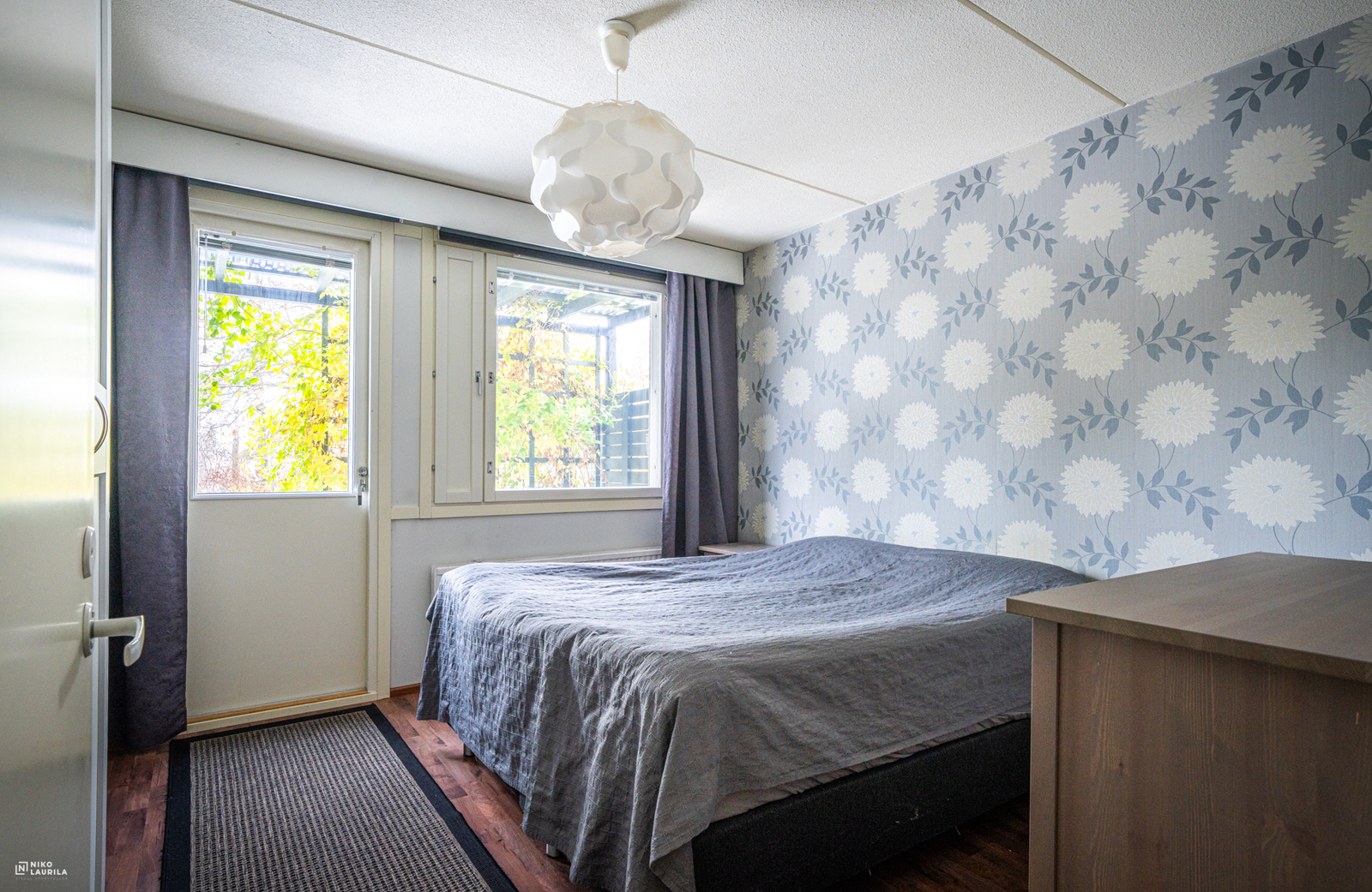 | Makuuhuoneen kuvaus | Lukumäärä: 2, seinät (maali ja tapetti), lattiat (laminaatti) |