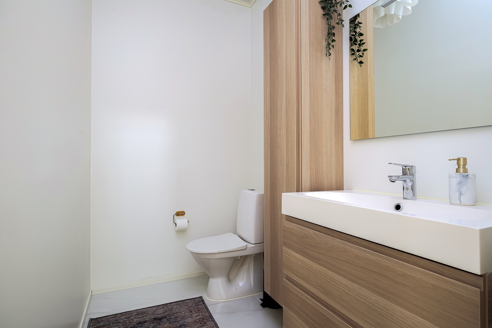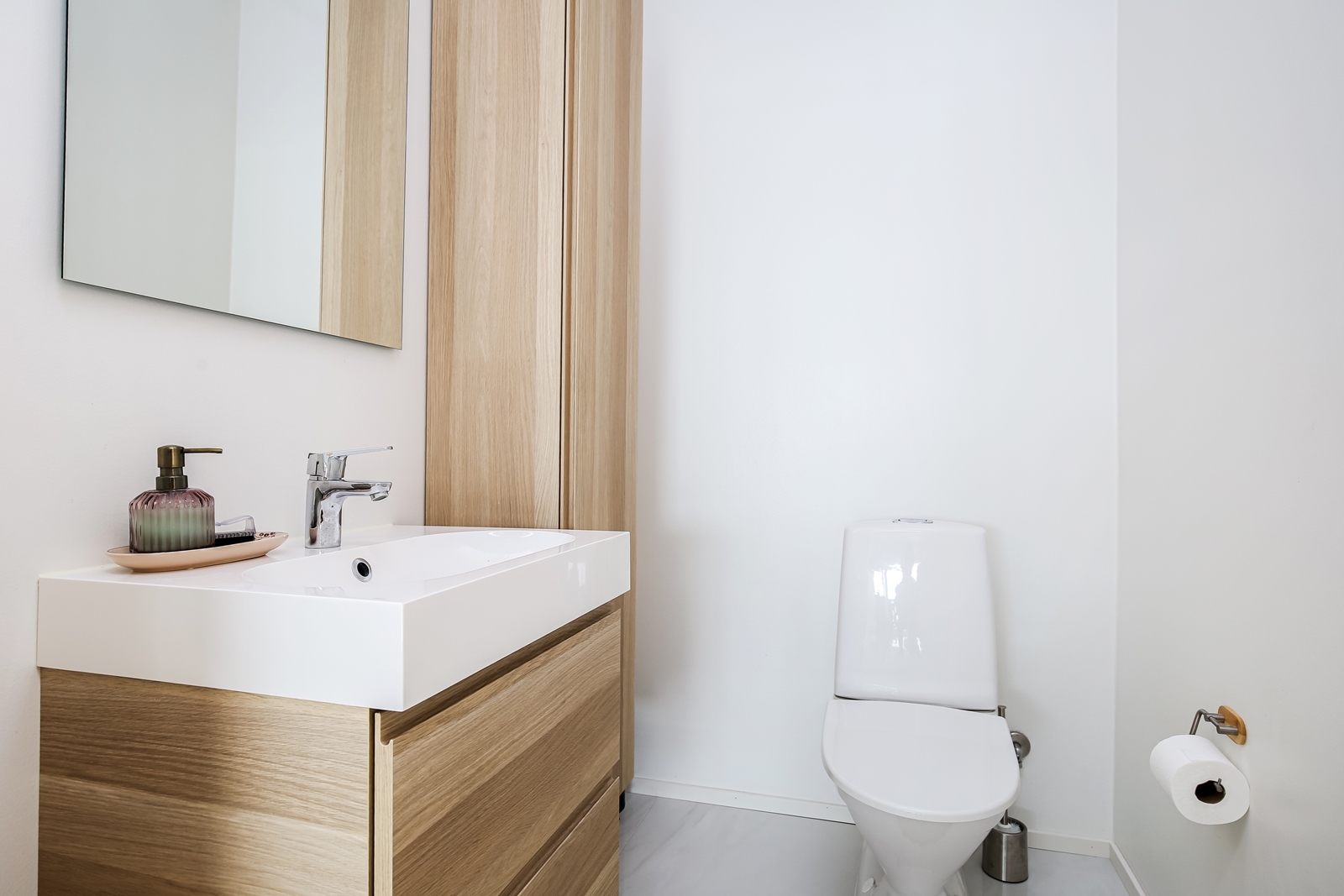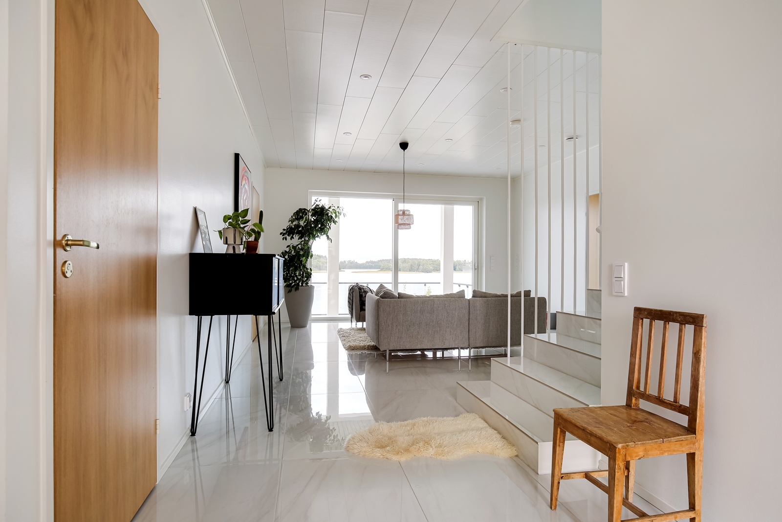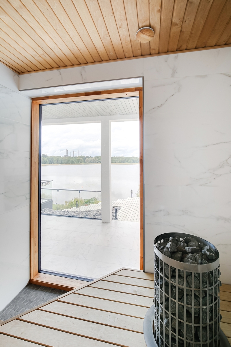 Jo astuessasi pihaan aistit tasokkaan kokonaisuuden ja astuessasi taloon sisälle vaikutut näkemästäsi. Sisääntulokerroksessa on ns. toinen olohuone hienolla näkymällä suurelle järvelle. Lisäksi täältä löytyy tilava kodinhoitohuone, erillinen wc, makuuhuone, vaatehuone ja tietenkin upea kylpyhuone-saunaosasto.