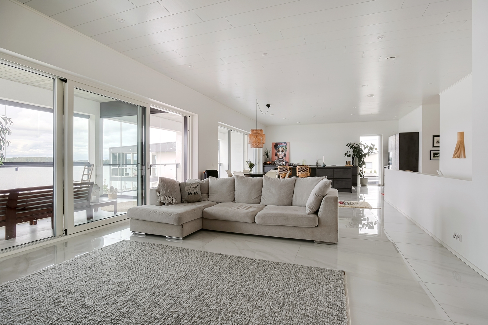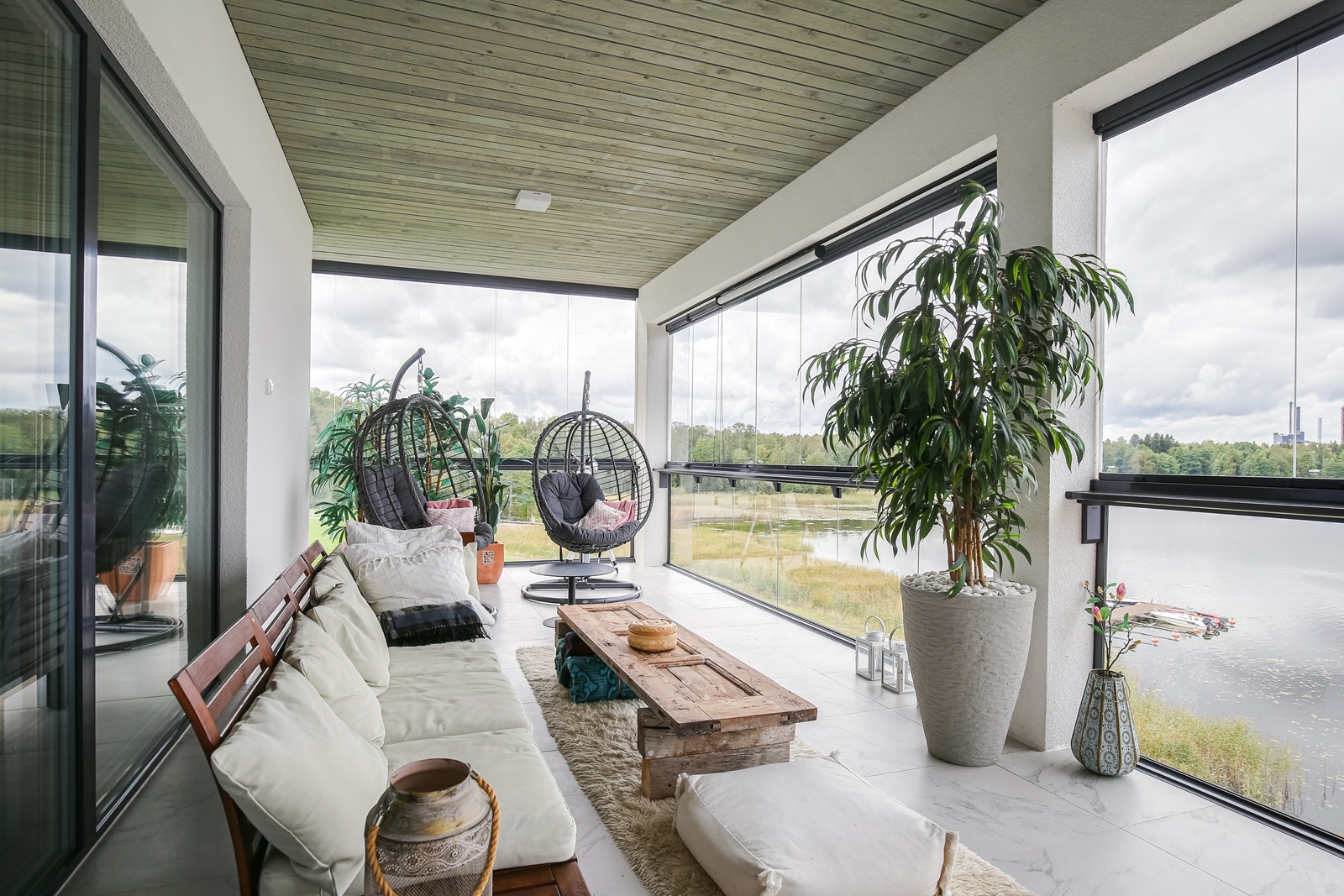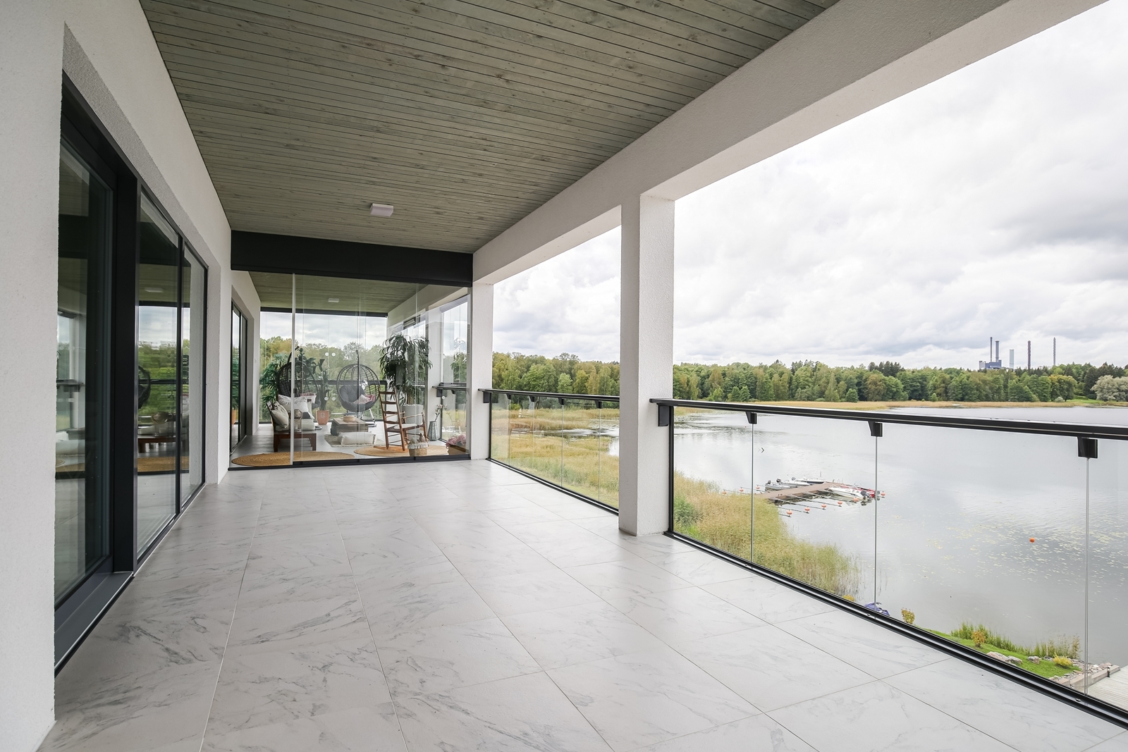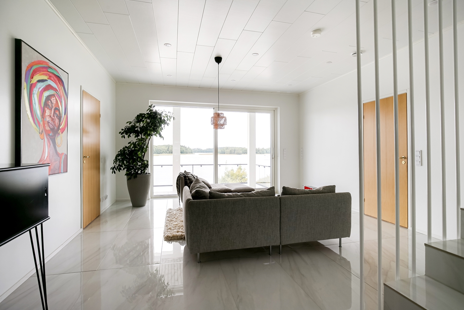 Leveät vaalein lattialaatoin päällystetyt portaat johdattavat Sinut yläkertaan, josta aukeaa silmiähivelevän kauniit näkymät järvelle kauas. Olohuone-keittiötila on yhtä hulppeankokoista tilaa ja täältä pääset vielä mahtavankokoiselle terassiparvekkeelle, josta osa on kokonaan lasitettua ja osassa kaidelasitus. Tällaista upeaa terassiparveketta, jossa näin upeat järvimaisemat ja tilat löytänetkö muualta?