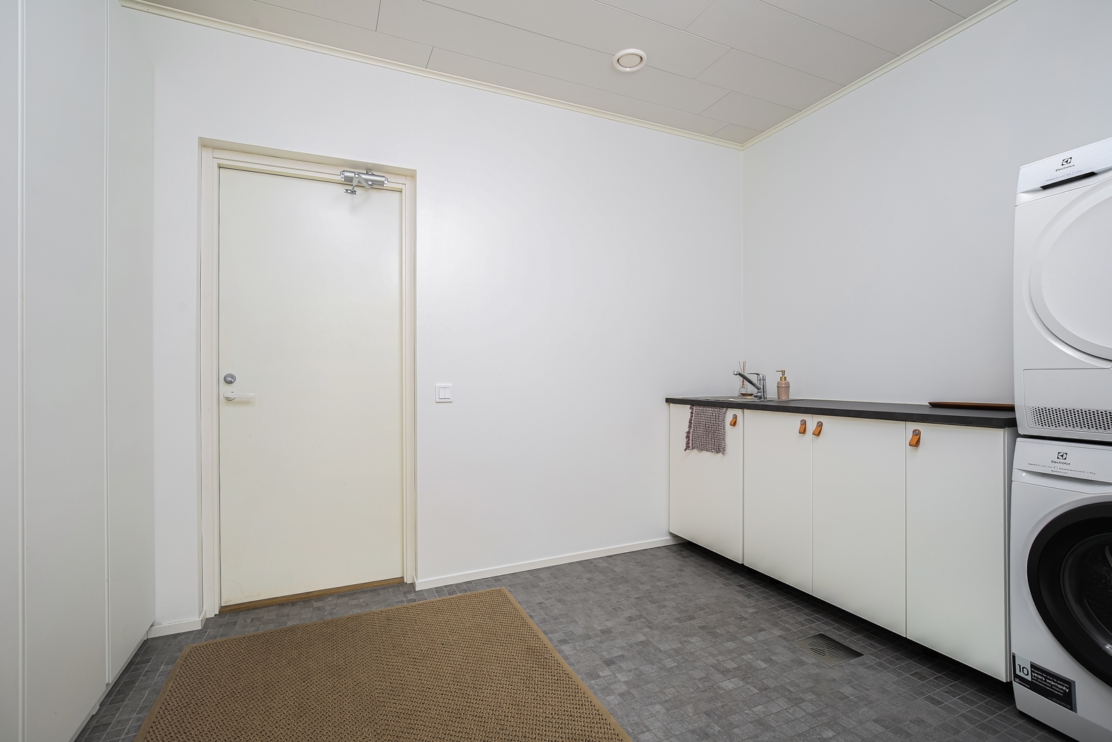 | Kodinhoitohuoneen kuvaus | Tilava tasokas kodinhoitohuone, jonne pääset talon eteisestä sekä autotallista. |