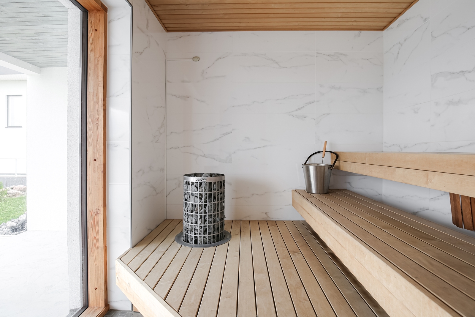 | Saunan kuvaus | Saunassa laattaseinät, lattia laatoitettu. Sähkökiuas. Laattaseinät antavat todella miellyttävän saunakokemuksen. |