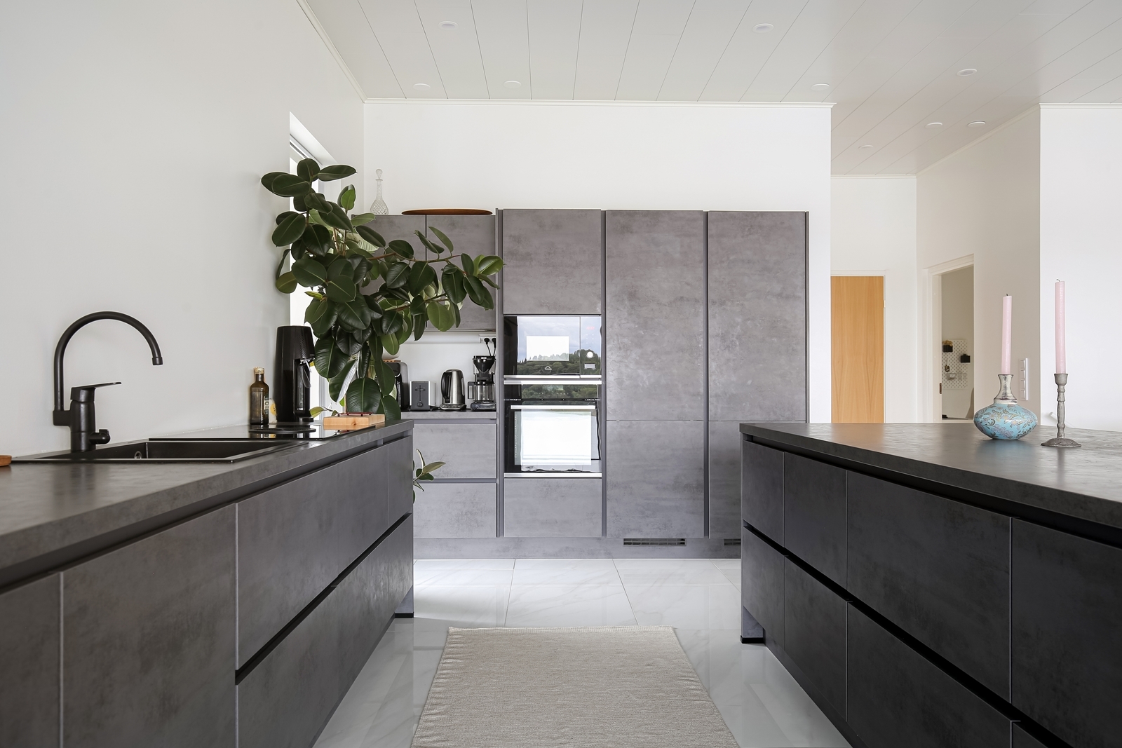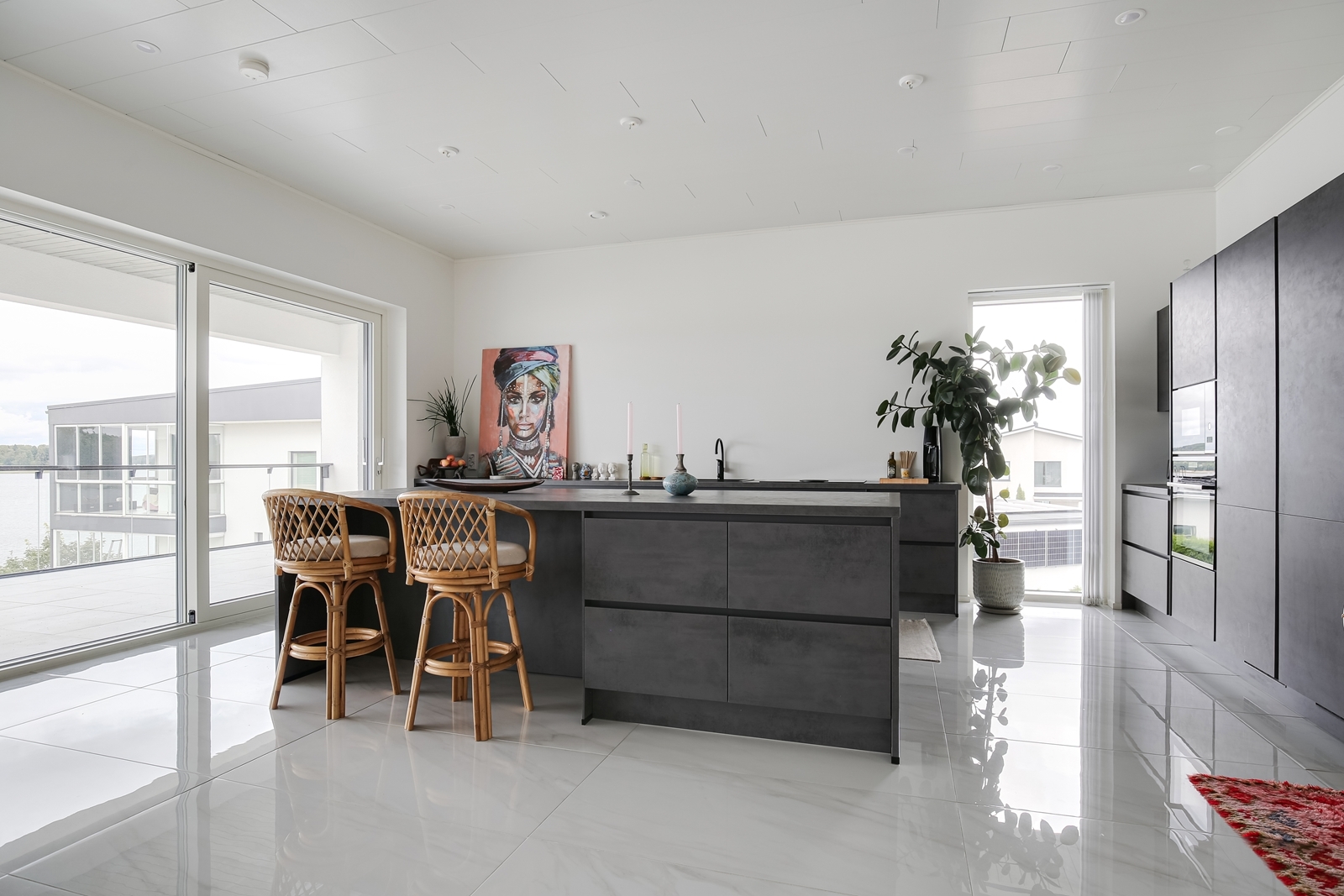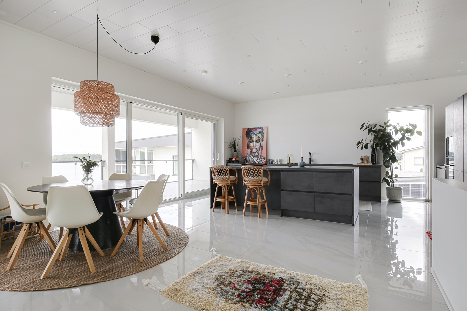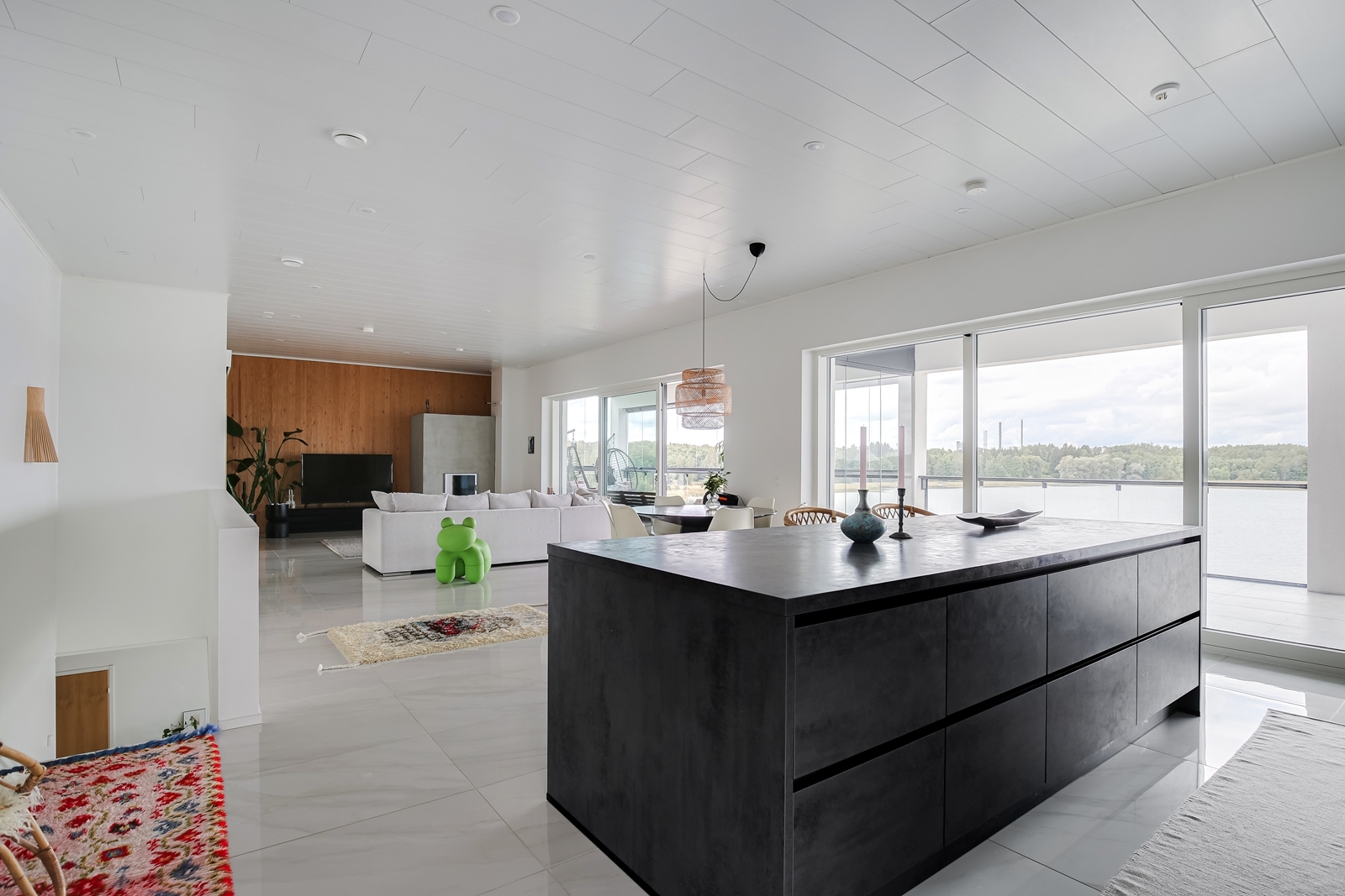 Noblessan vaikuttava ja tasokas keittiö kalusteineen yhdistyy hienosti olohuoneeseen.