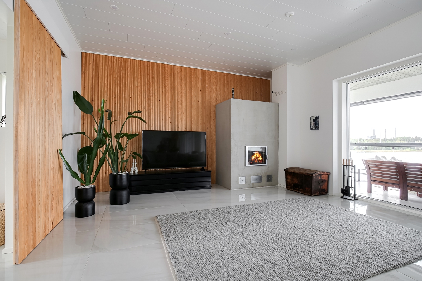 | Olohuoneen kuvaus | Olohuoneessa varaava takka. Seinät maalattuja ja sormipaneelia tehosteena. |