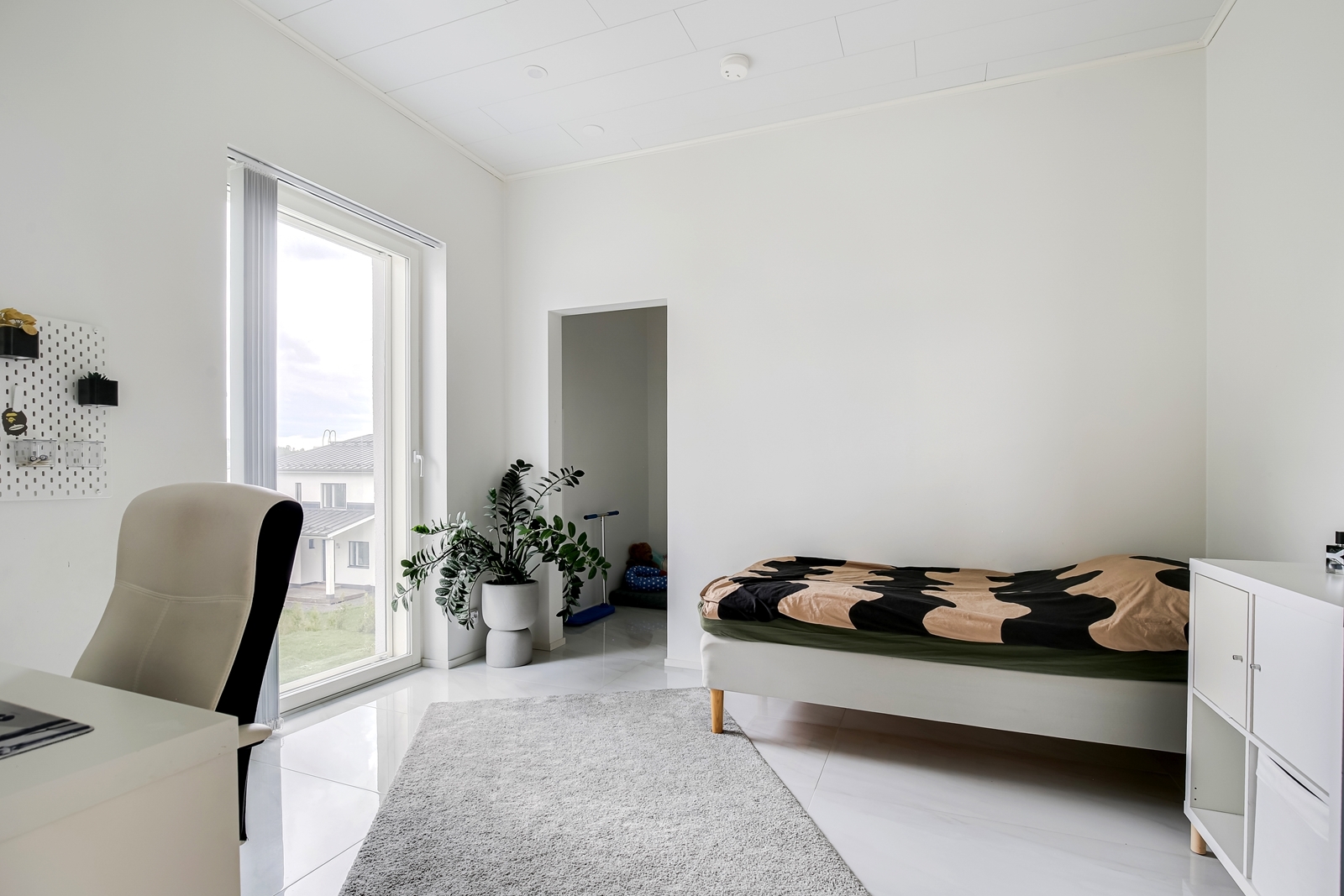 | Muut huoneet ja tilat | Makuuhuoneiden seinät maalattuja, lattiat laatoitettu. Yhden makuuhuoneen sijainti sisääntulokerroksessa ja kolme yläkerrassa. |