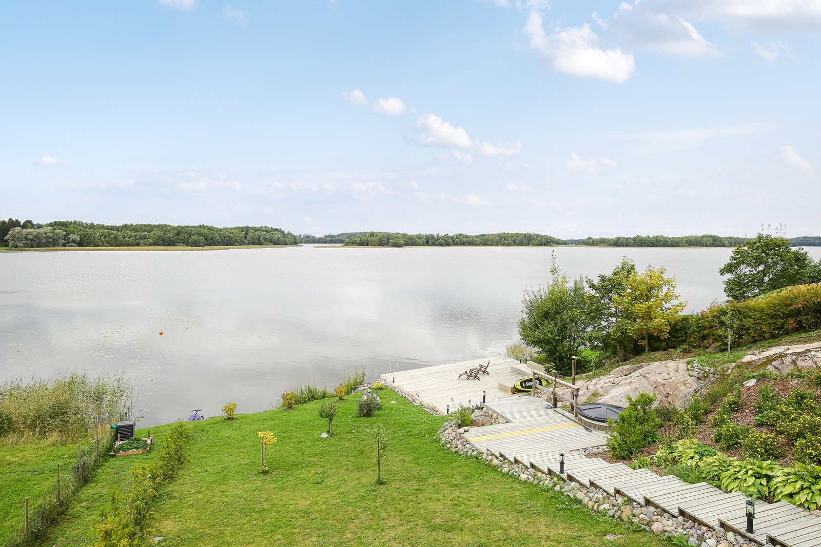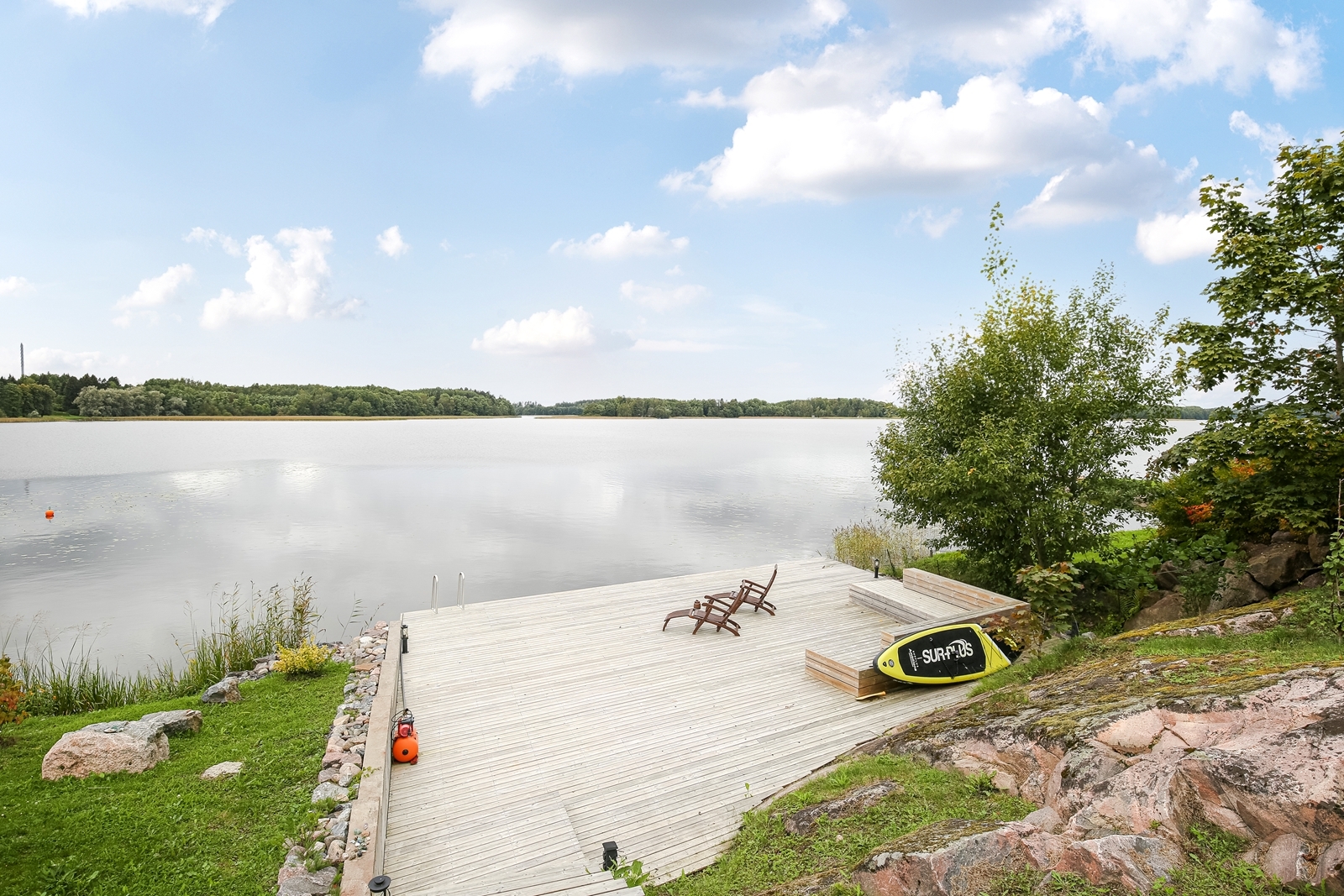 Sisääntulokerroksen 2. olohuoneesta (aivan saunaosaston vierestä) pääset terassille ja siitä omalle pihalle ja portaat johdattavat Sinut paljun kautta suurelle laiturille, josta voit pulahtaa järveen tai lähteä veneilemään. Oi miten kaunista ja rentouttavaa!