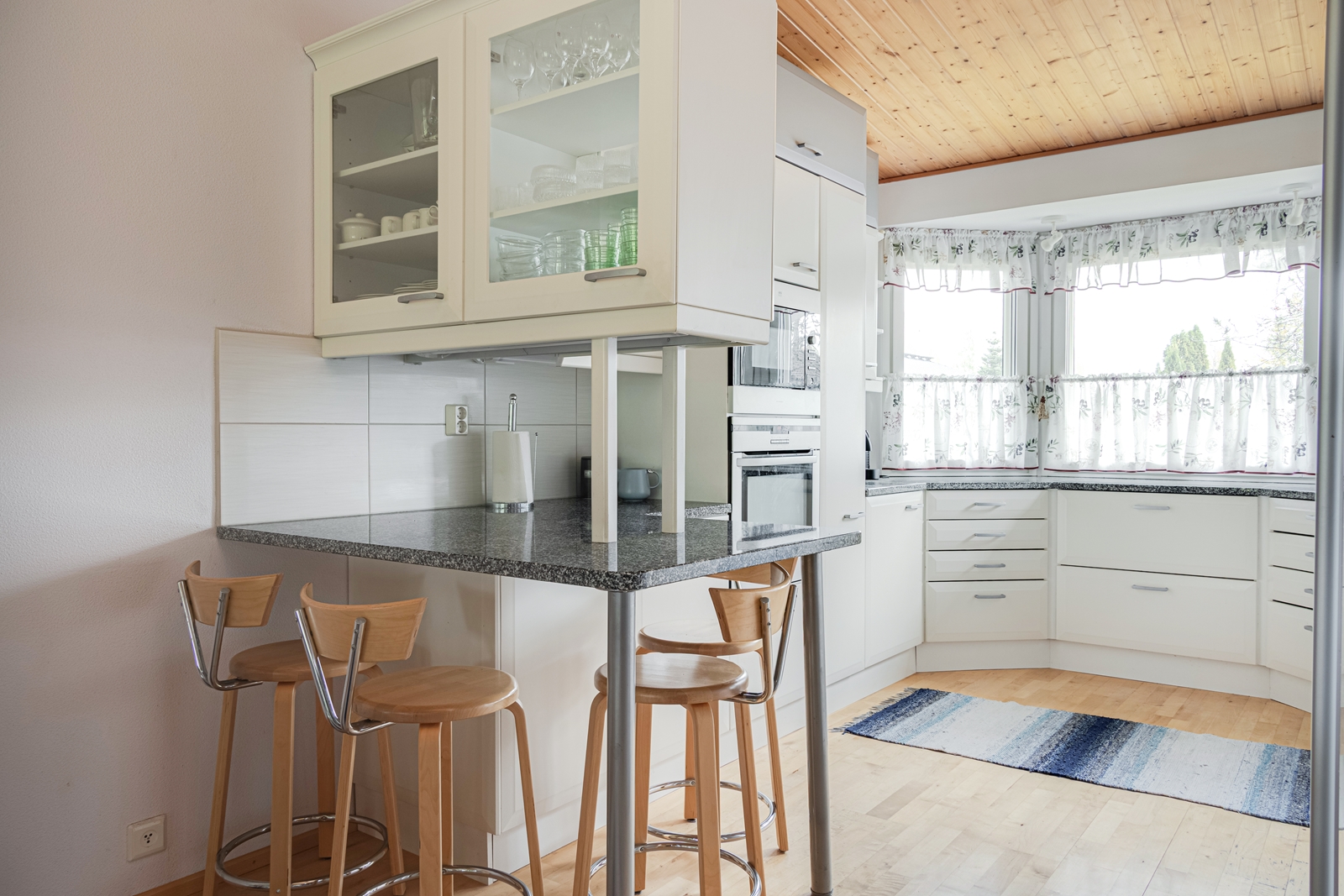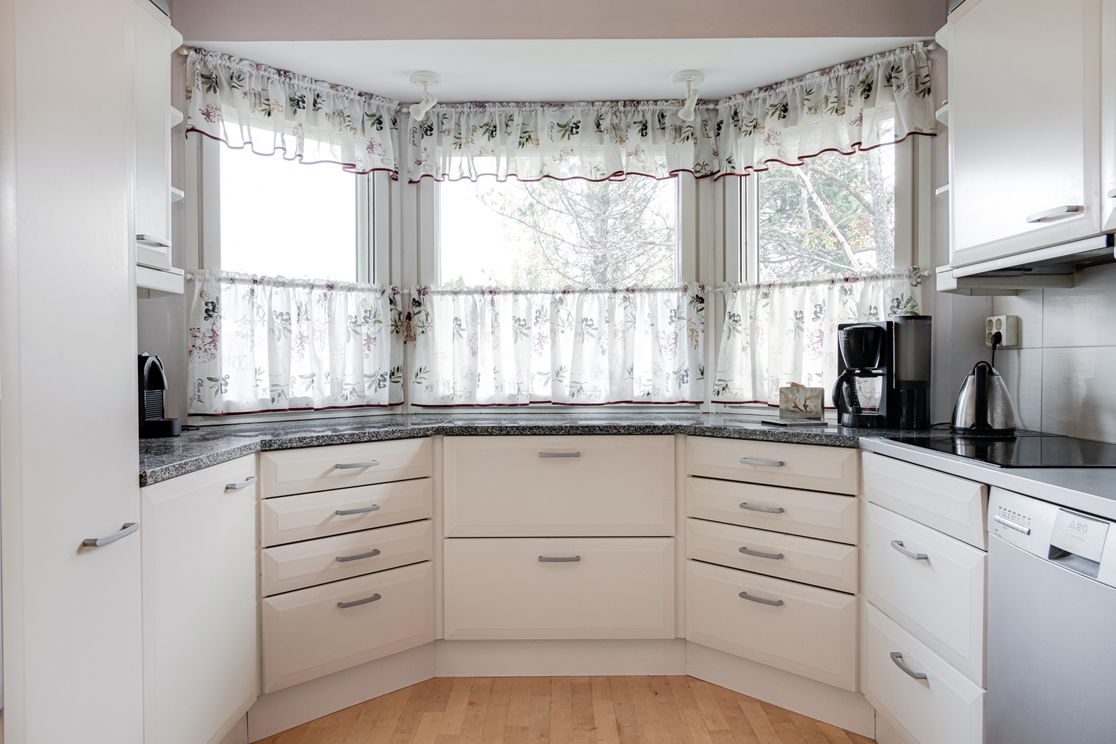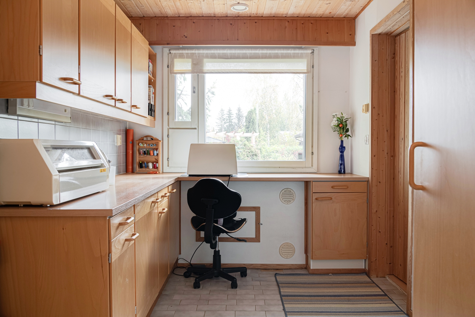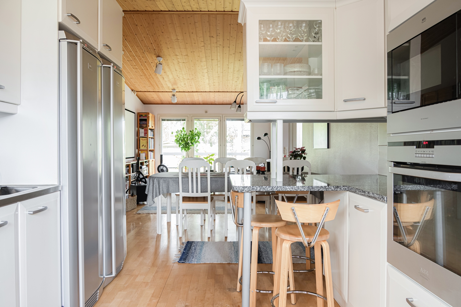 Liesi (Induktioliesi), työtasot (kivi), seinät (maali ja tapetti), lattiat (parketti), jääkaappi, erillinen pakastin, erillisuuni, liesituuletin ja astianpesukone |