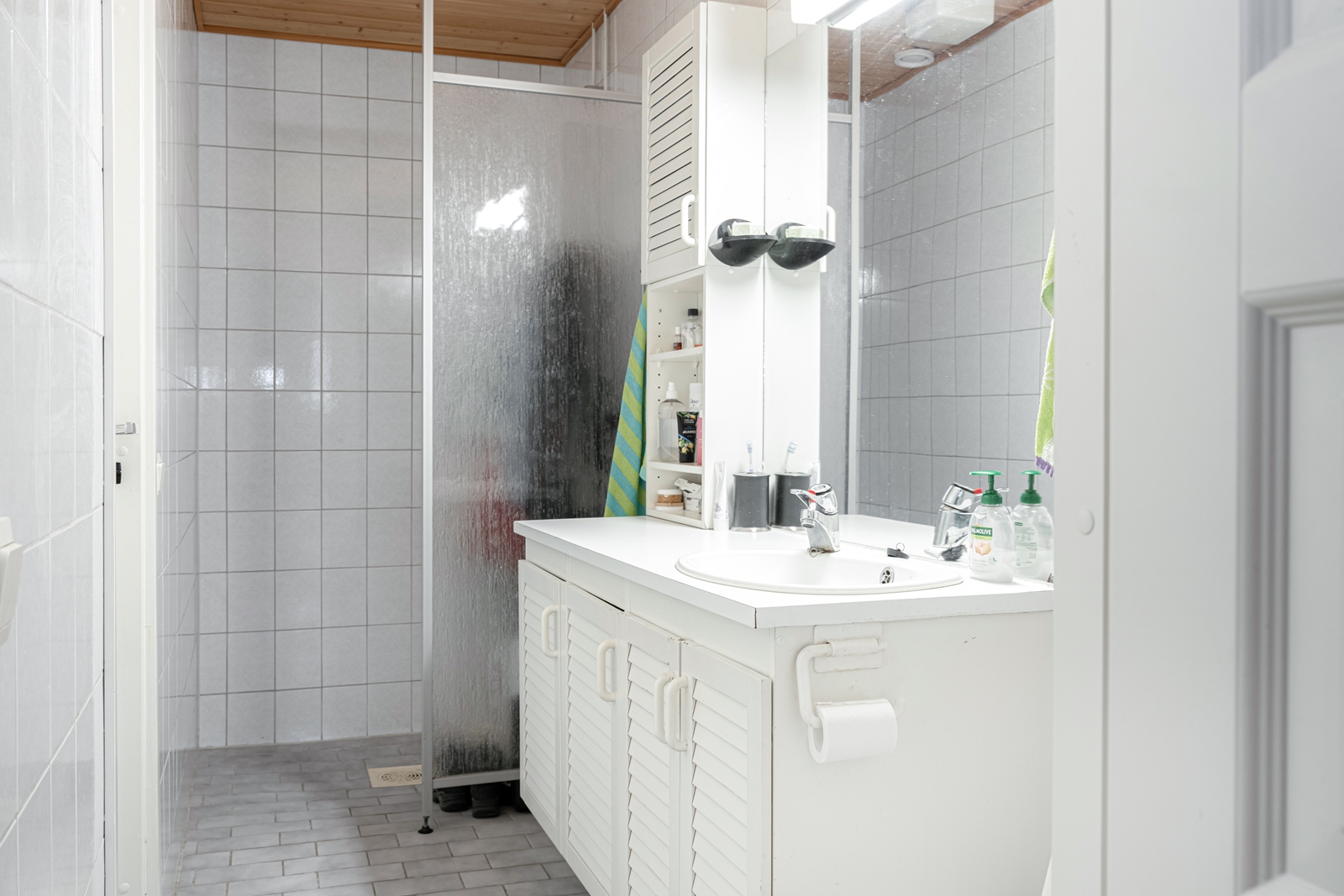 Pesukoneliitäntä, lattiakaivo, keskuspölynimuri ja pöytätaso, lattiat (laatta), seinät (maali) |