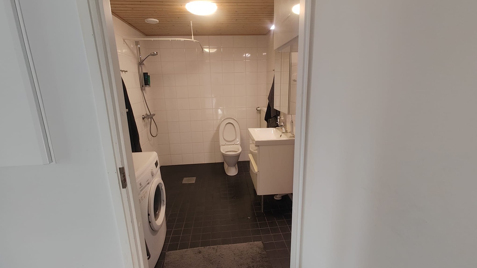 WC-istuin, pesukoneliitäntä, peilikaappi ja suihku, seinät (kaakeli), lattiat (laatta) |