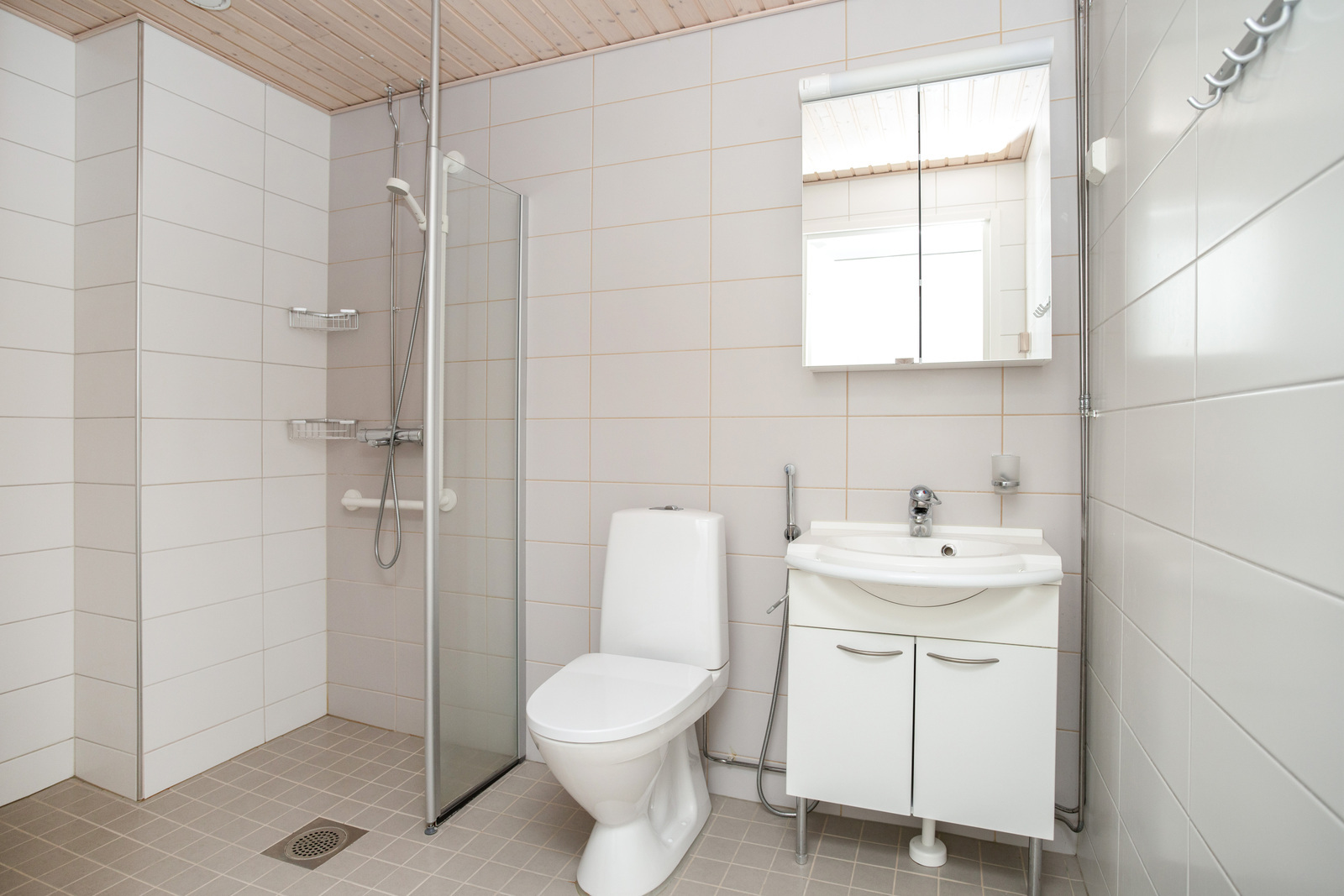 | Kylpyhuoneen kuvaus | Suihku, allaskaappi, lattialämmitys, wc-istuin, peilikaappi ja pesukoneliitäntä, seinät (kaakeli), lattiat (laatta) |