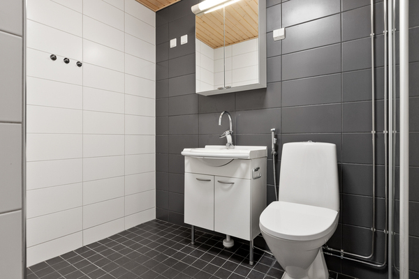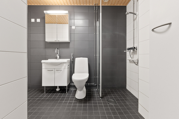 | Kylpyhuoneen kuvaus | Pesukoneliitäntä, lattialämmitys, suihkuseinä, peilikaappi, suihku ja wc-istuin, seinät (kaakeli), lattiat (laatta) |