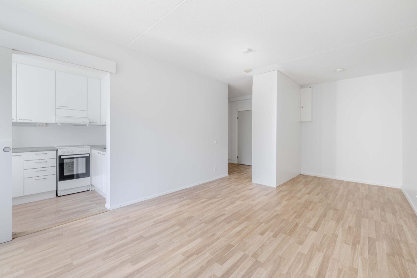 Keittiön kuvaus Liesi (Sähköhella), seinät (laatta ja maali), lattiat (laminaatti), liesituuletin ja erillisuuni