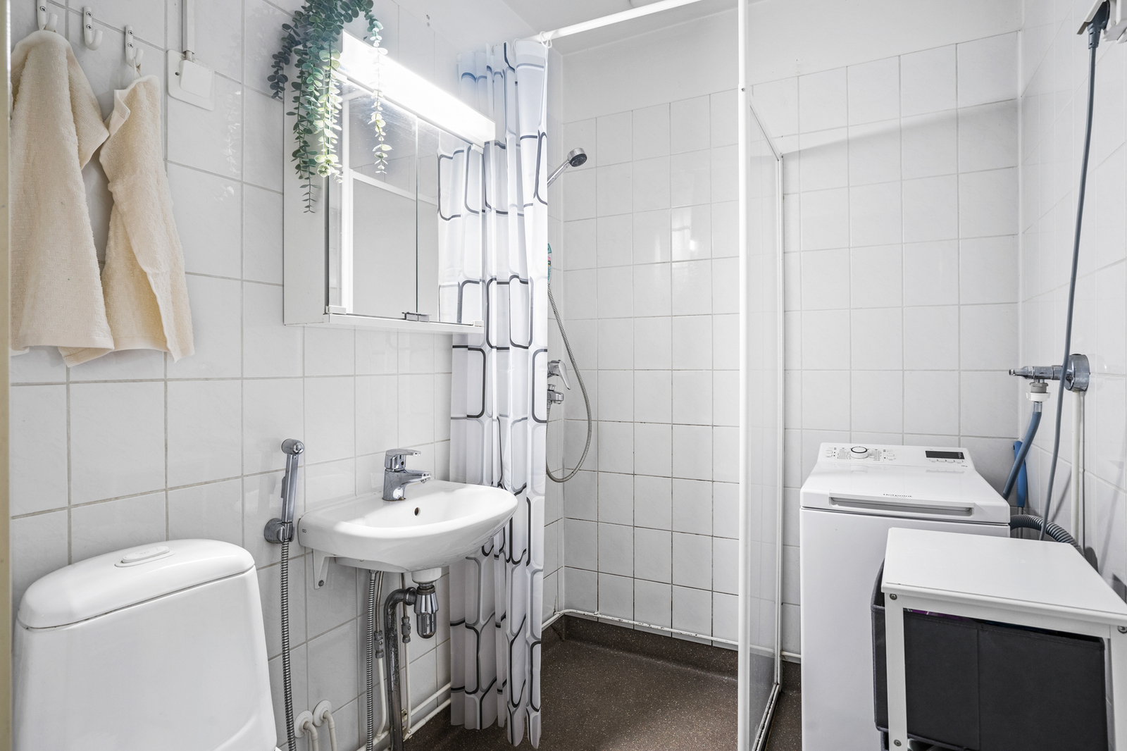 | Kylpyhuoneen kuvaus | WC-istuin, pesukoneliitäntä, suihkuseinä, peilikaappi, suihku ja asennettuja erikoisvarusteita, kiinteät valaisimet, seinät (kaakeli), lattiat (muovimatto) |
