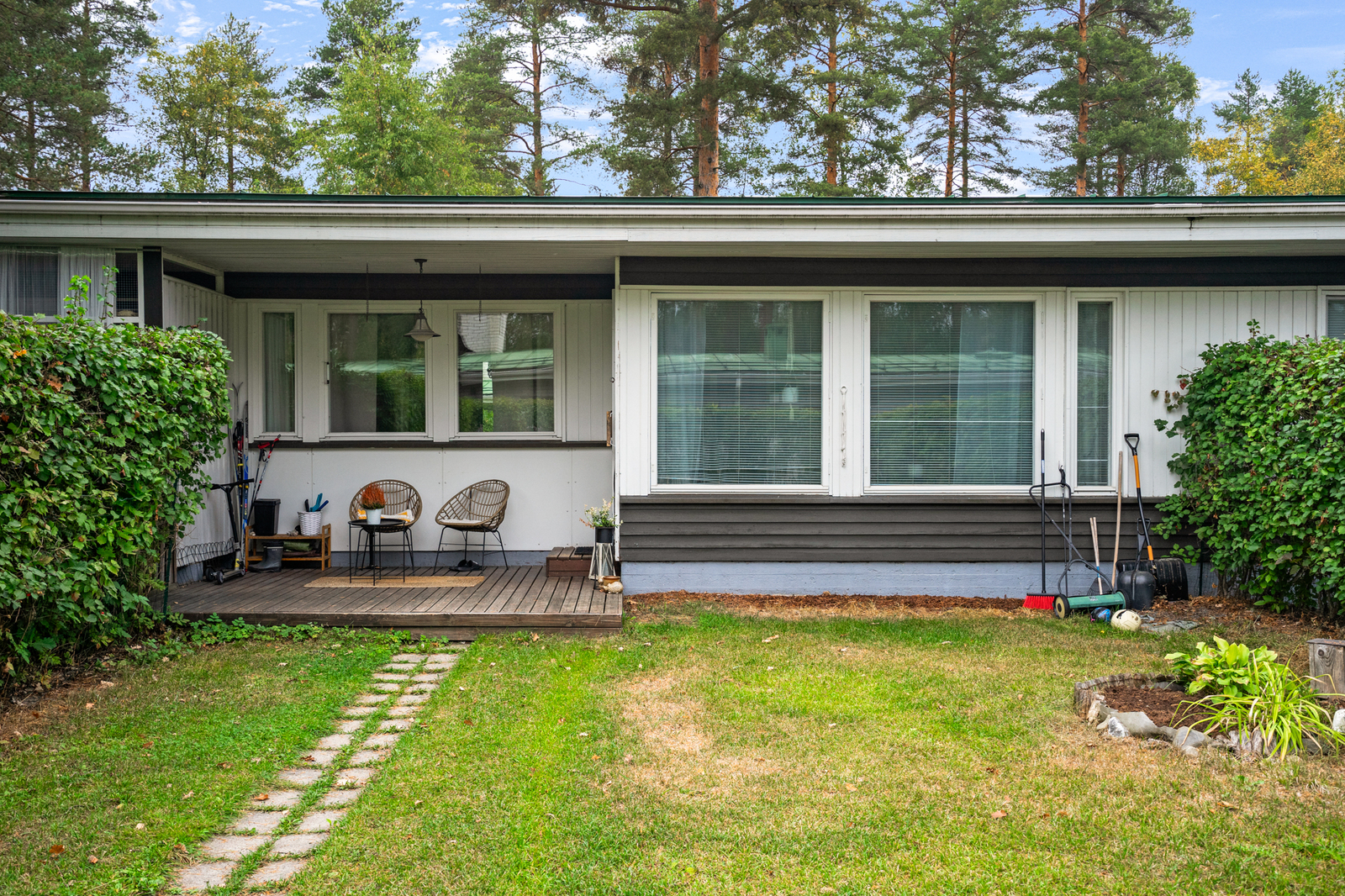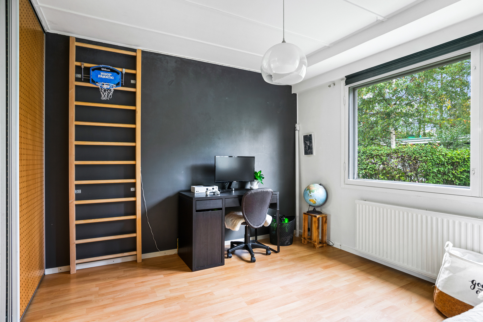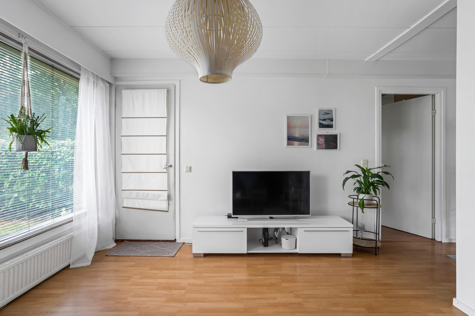 Rauhalliselta sijainnilta siisti rivitalokolmio, missä pohjaratkaisu on toteutettu fiksusti. Huoneiston keskiössä on isokokoinen ja avara olohuone, mistä avautuu pihanäkymä huoneiston käytössä olevalle pihalle. Toinen makuuhuone olohuoneen vieressä, mistä myös pihanäkymä. Tässä huoneessa on kaappitilaa yhden seinustan verran. Toisessa makuuhuoneessa on myös samalla tavalla kaappitilaa ja tässä etupihanäkymä. Keittiö tarjoaa kaappitilaa kattoon saakka, jonka ansiosta on maksimoitu kaikki käytettävä tila. Kylpyhuone on järkevästi sijoitettu keskelle asuntoa.