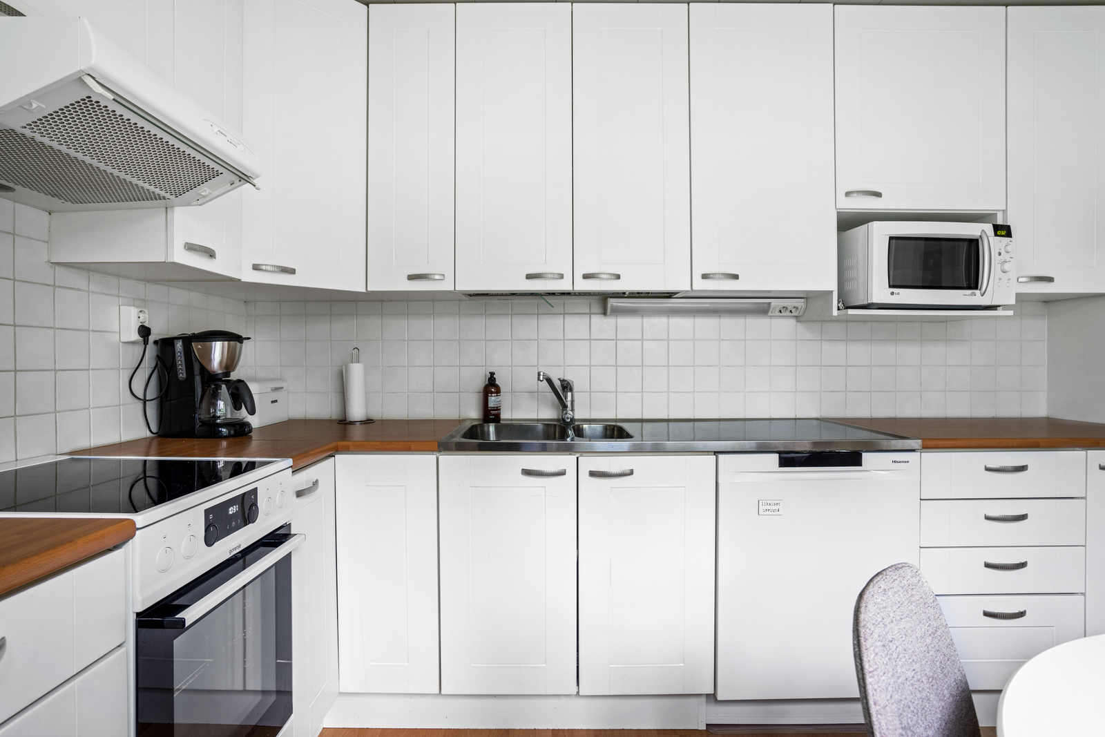 | Keittiön kuvaus | Liesi (muu), työtasot (laminaatti), seinät (laatta ja maali), lattiat (laminaatti), jääkaappipakastin, liesituuletin, liesi, astianpesukone ja kiinteät valaisimet |