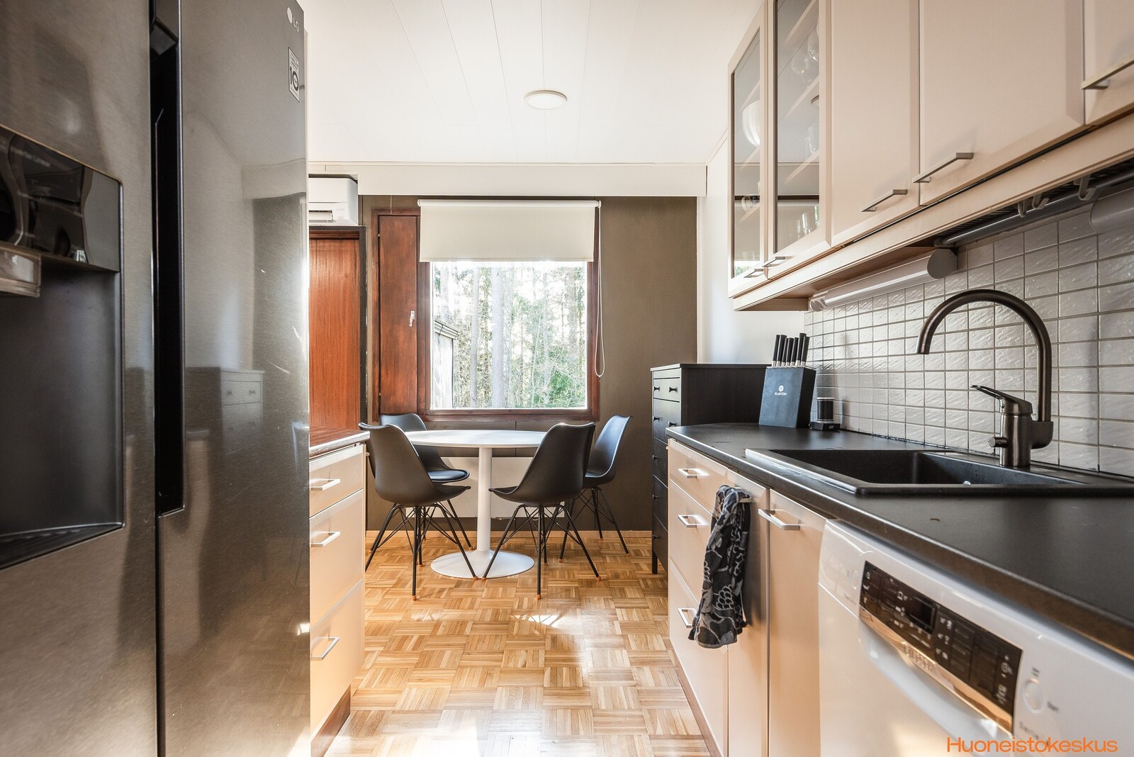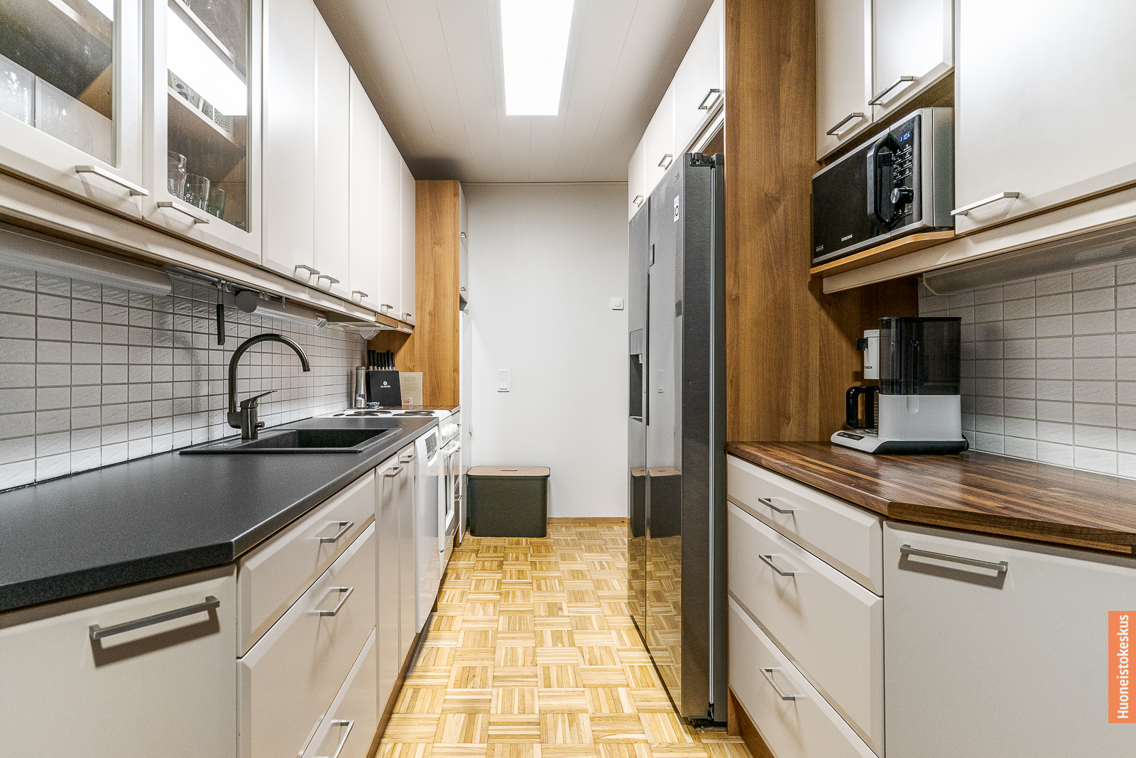 | Keittiön kuvaus | Liesi (sähköliesi), työtasot (laminaatti), seinät (maali), lattiat (parketti), astianpesukone, liesituuletin, jääkaappi, liesi ja kiinteät valaisimet, pakastekaappi |