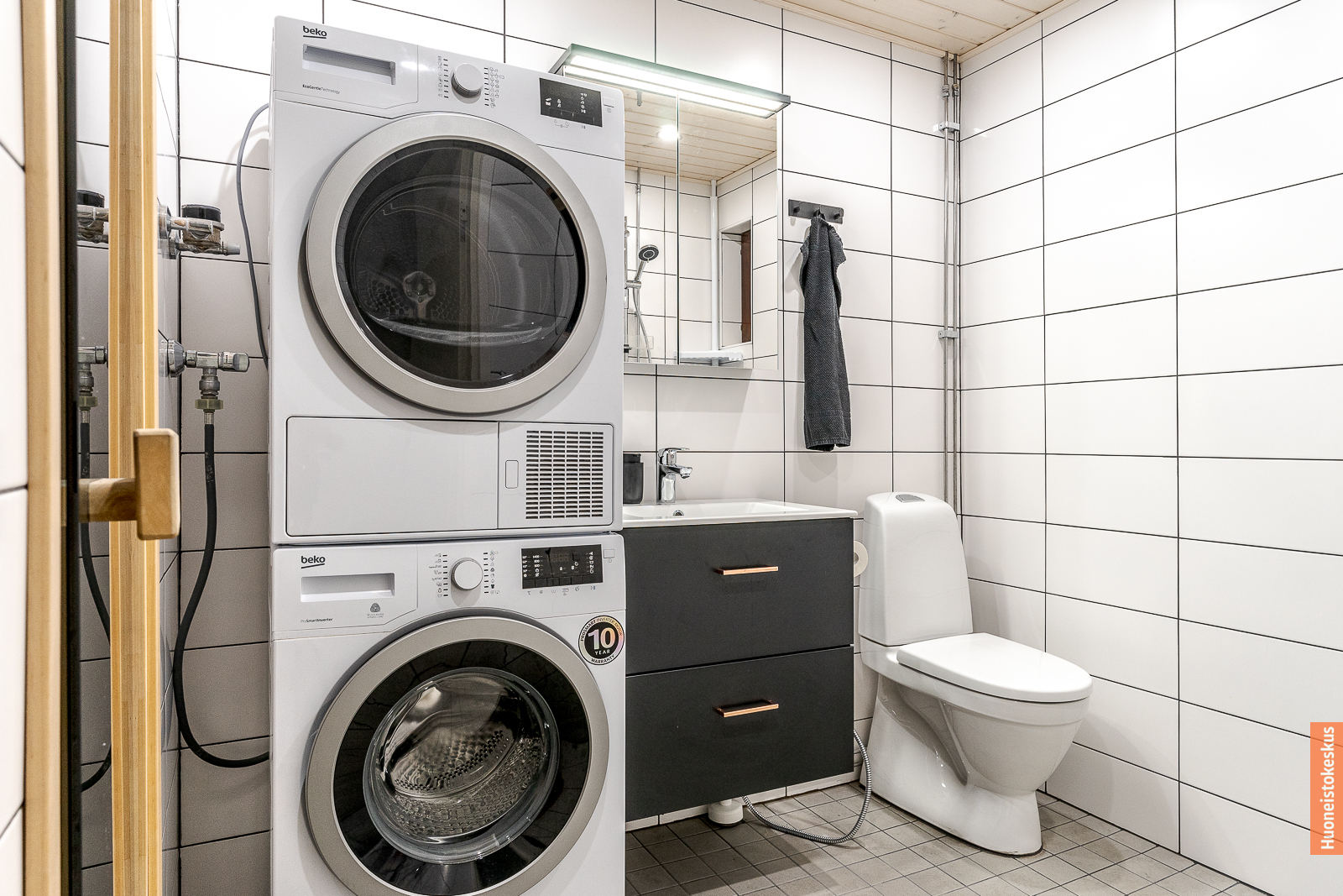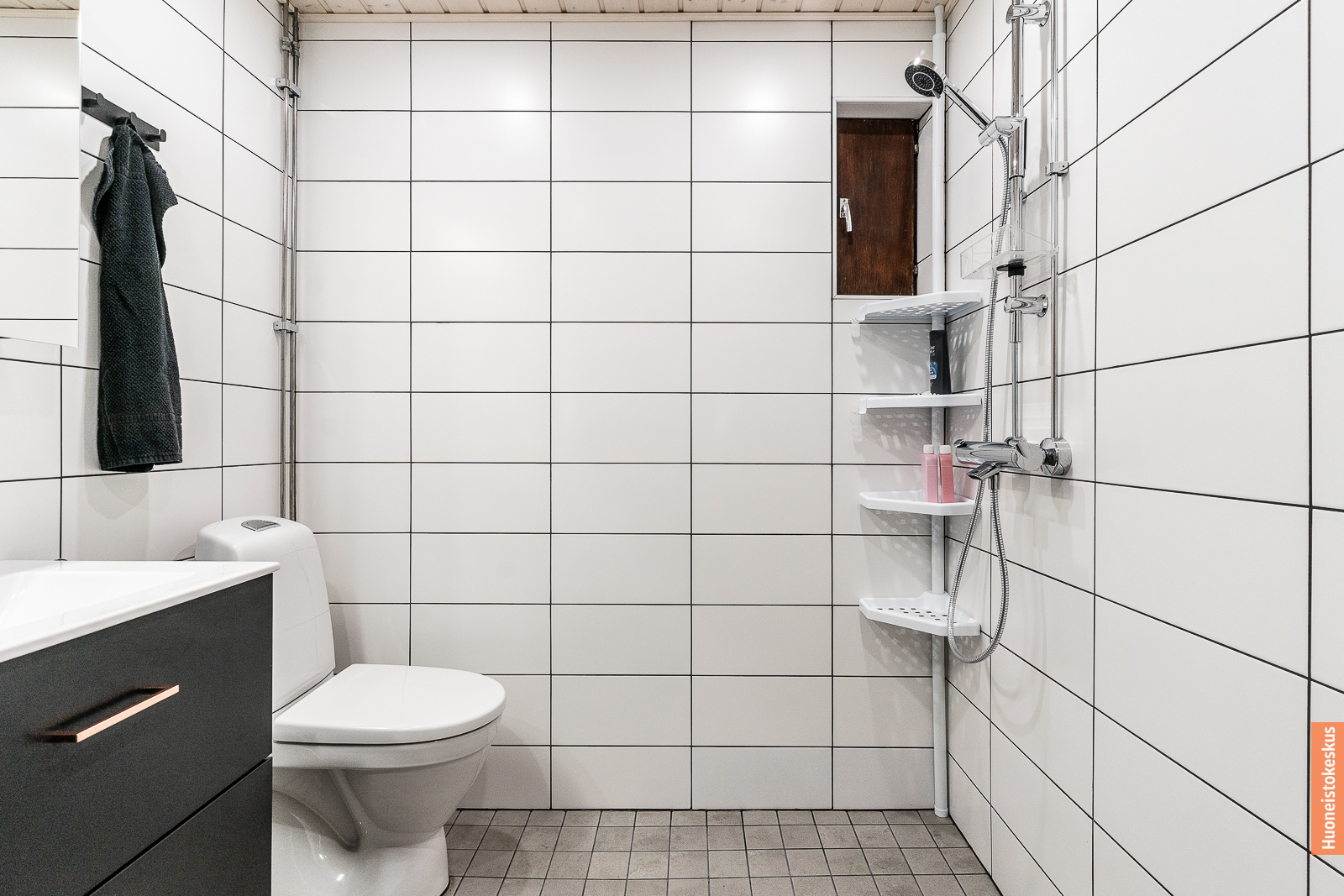 | Kylpyhuoneen kuvaus | Allaskaappi, pesukoneliitäntä, peilikaappi, wc-istuin, suihku ja kiinteät valaisimet, seinät (kaakeli), lattiat (laatta) |