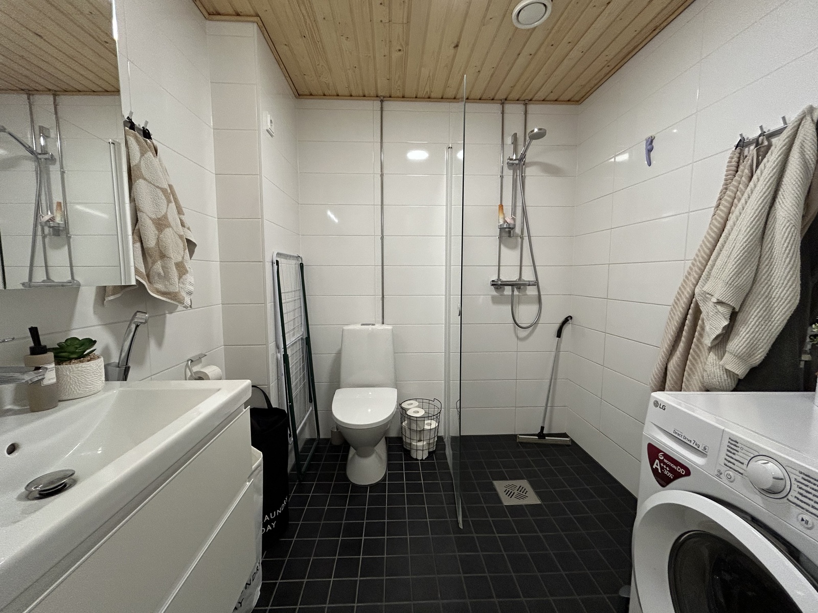 Suihkuseinä, pesukoneliitäntä, wc-istuin, suihku ja lattialämmitys, seinät (kaakeli), lattiat (laatta) |
