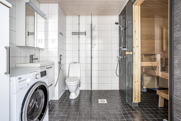 | Kylpyhuoneen kuvaus | Suihkuseinä, pesukoneliitäntä, wc-istuin, peilikaappi, suihku, allaskaappi, lattialämmitys ja kiinteät valaisimet, seinät (kaakeli), lattiat (laatta) |