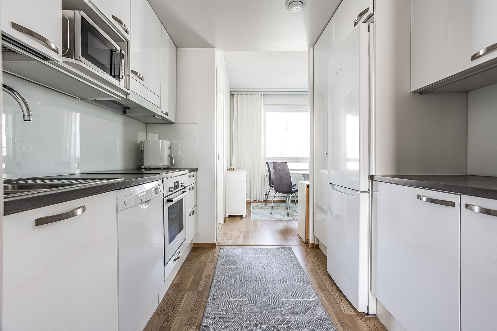 | Keittiön kuvaus | Liesi (Keraaminen liesi ja erillisuuni), työtasot (laminaatti), seinät (maali), lattiat (parketti), jääkaappipakastin, erillisuuni, astianpesukone, mikroaaltouuni, liesituuletin ja kiinteät valaisimet, Keittiössä välitilassa lasi |