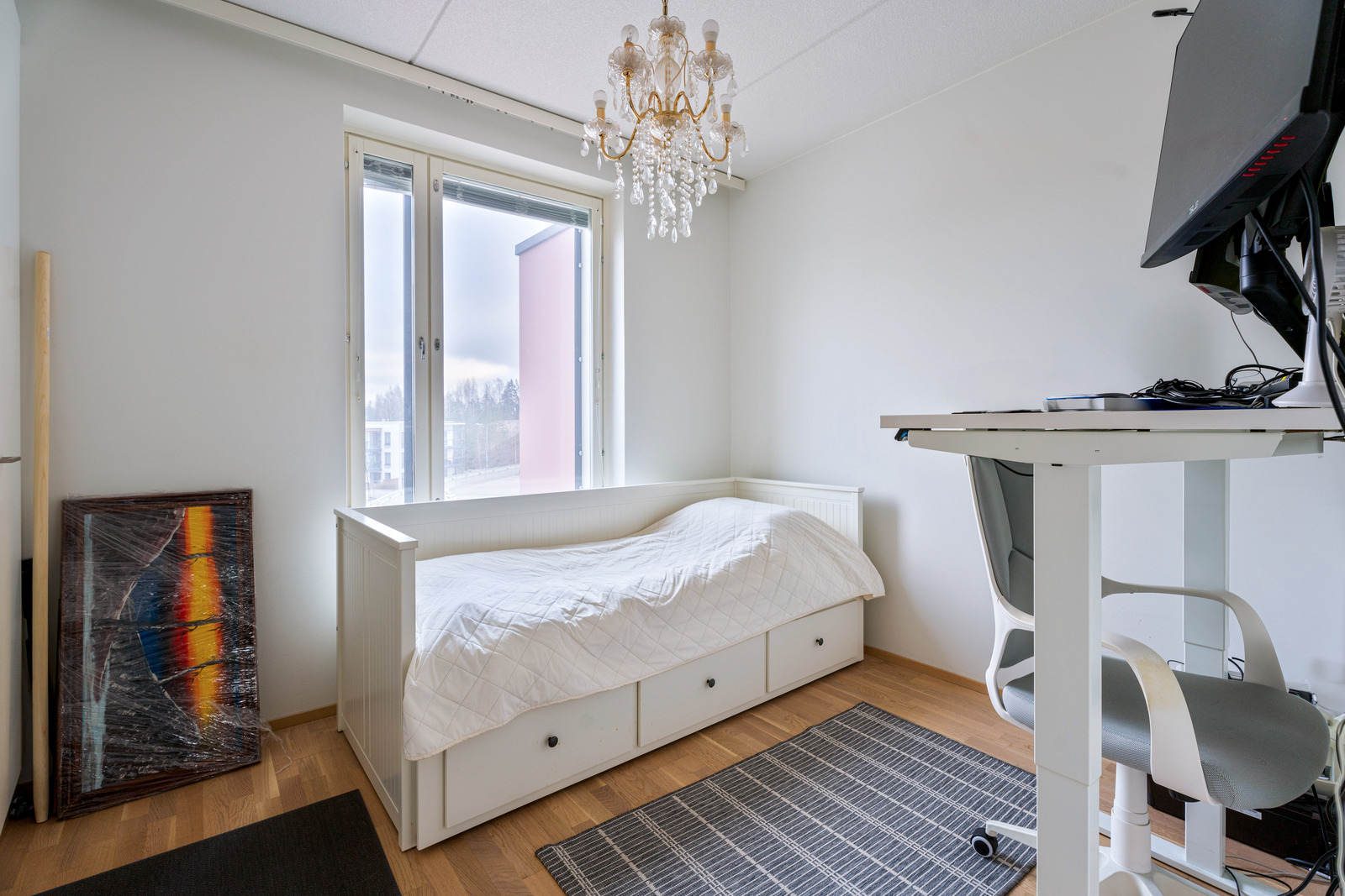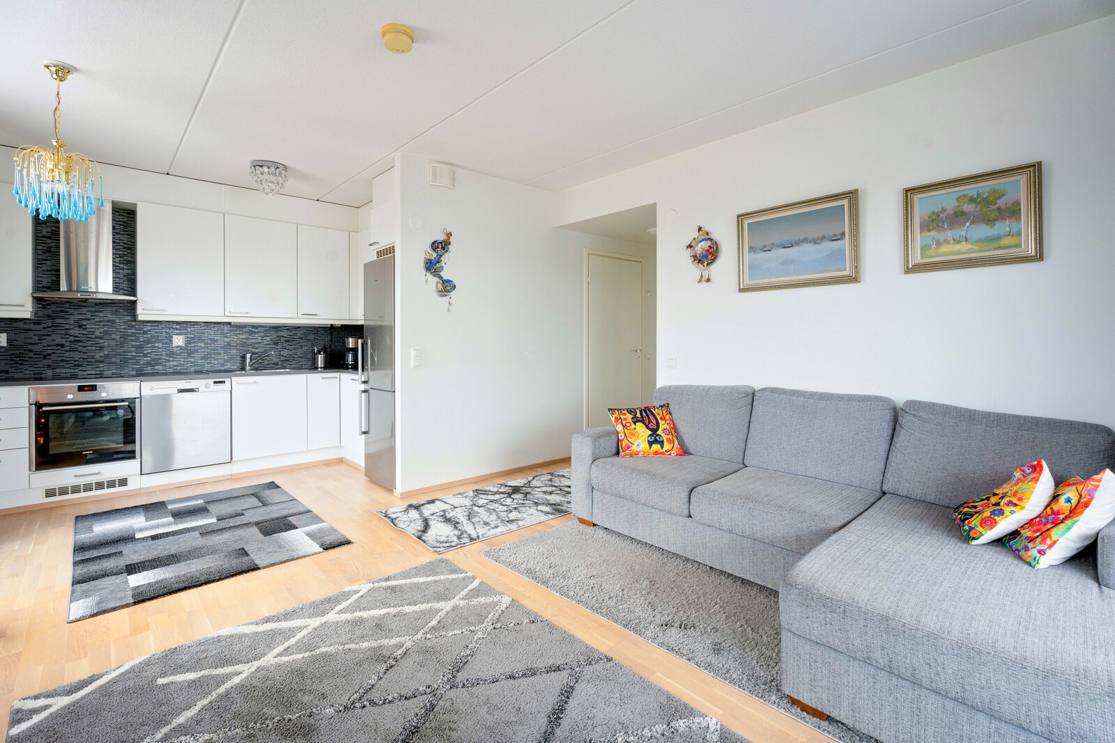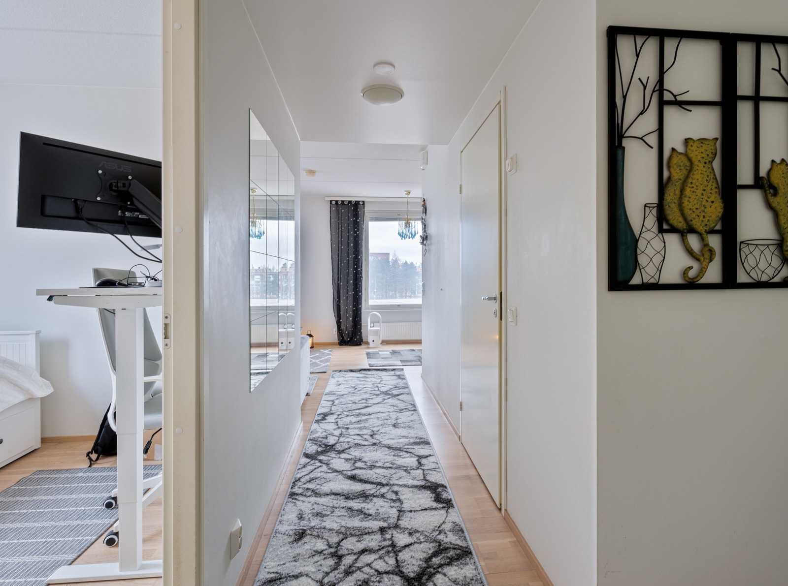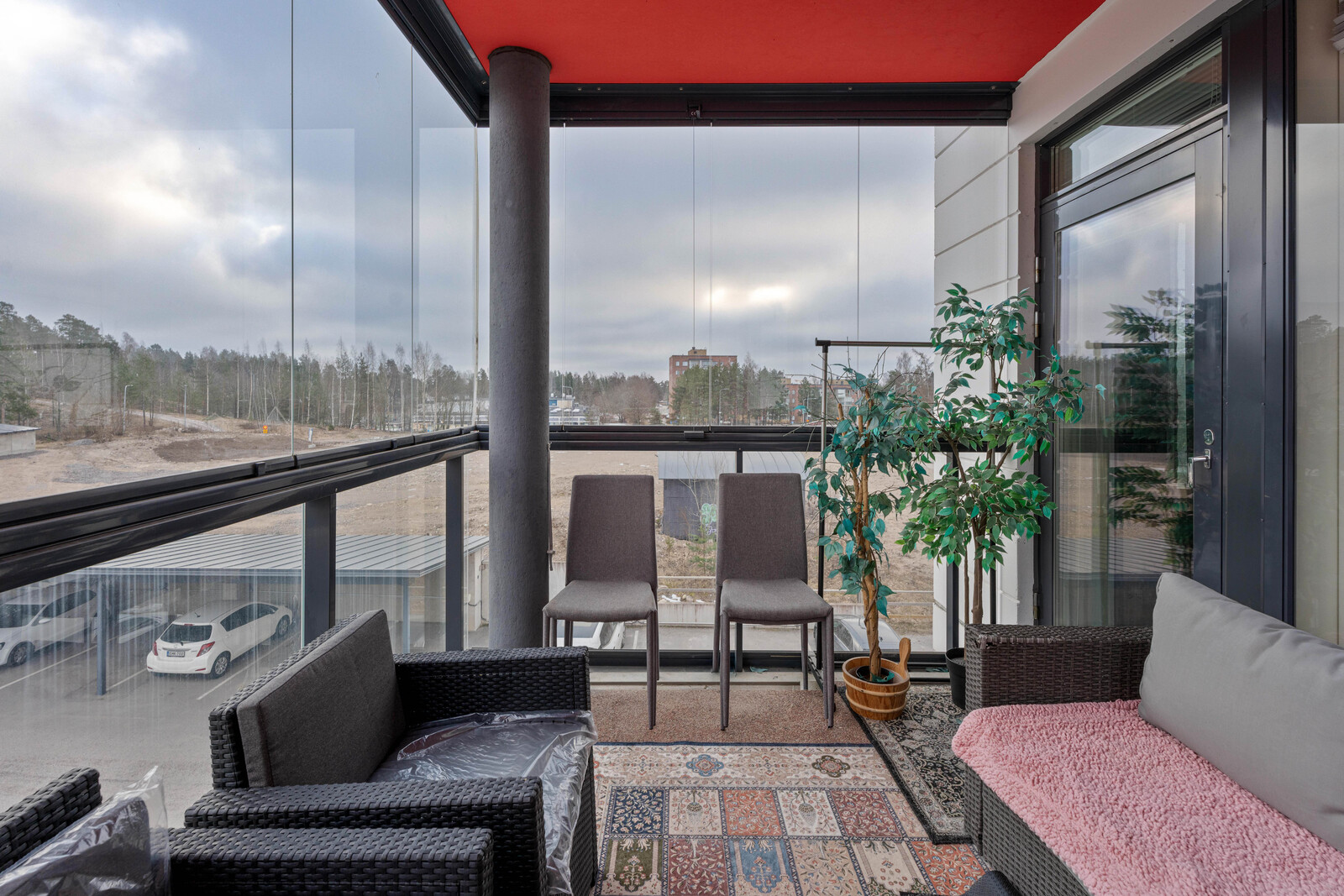 Huoneisto sijaitsee taloyhtiön ylimmässä, kolmannessa kerroksessa, tarjoten toimivan pohjaratkaisun. Suurista ikkunoista tulvii valoa huoneistoon. Lasitettu parveke tuo lisämukavuutta, ja sieltä näkymät rauhallisemmalle puolelle parkkikannelle.