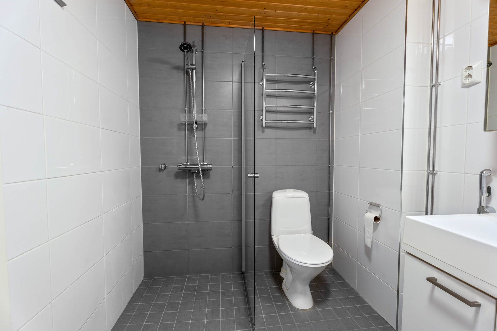 | Kylpyhuoneen kuvaus | Suihkuseinä, lattialämmitys, suihku, pesukoneliitäntä, wc-istuin, peilikaappi ja allaskaappi, seinät (kaakeli), lattiat (laatta) |