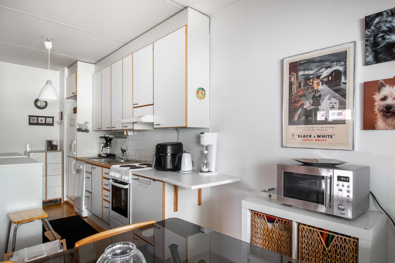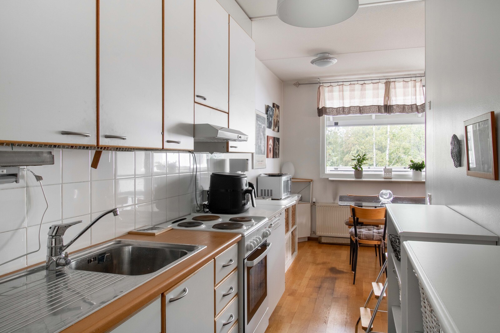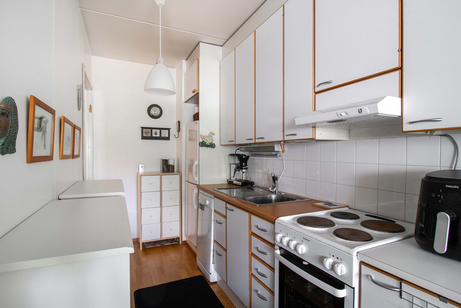 | Keittiön kuvaus | Liesi (sähköliesi), työtasot (laminaatti), seinät (maali), lattiat (parketti), liesi, jääkaappipakastin, astianpesukone ja liesituuletin / hormi, keittiön kaapistot valkoiset, vetimet vaihdettu |