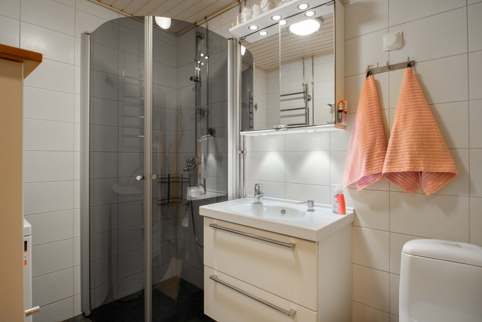 Kylpyhuone on uusittu ja siellä mainiosti tilaa pesukoneelle.