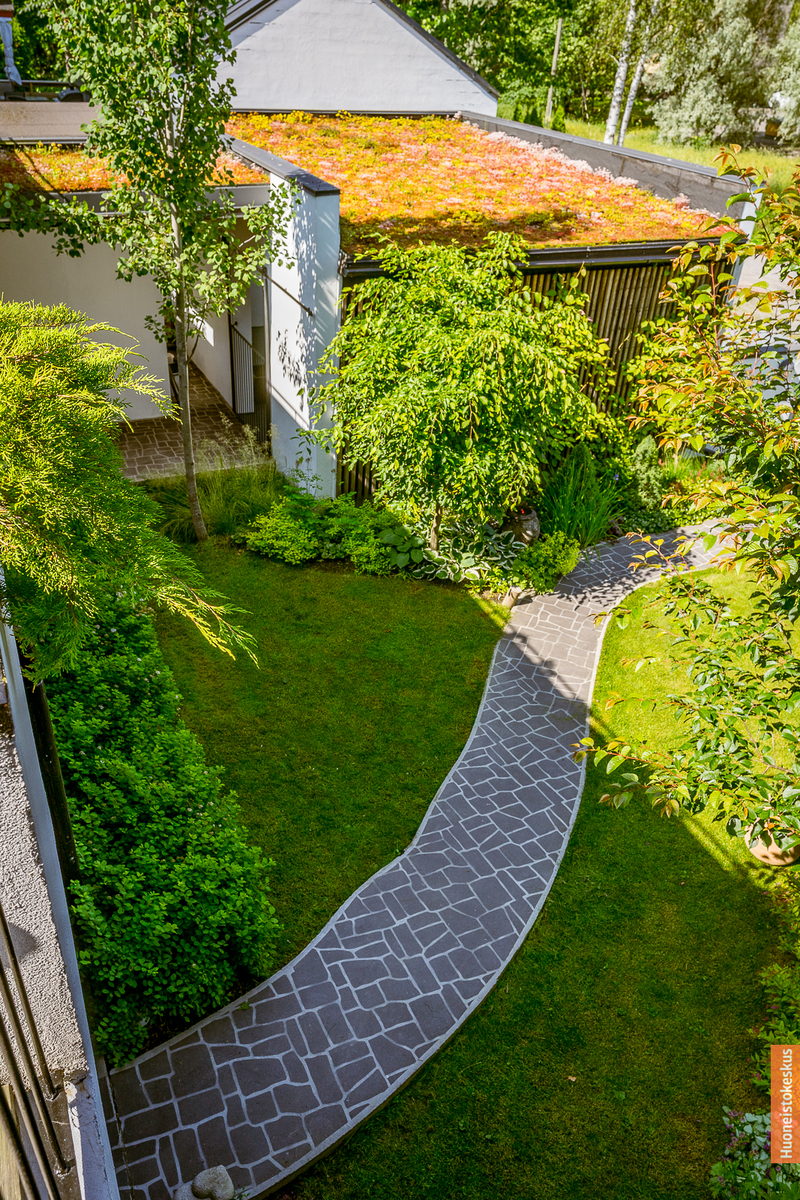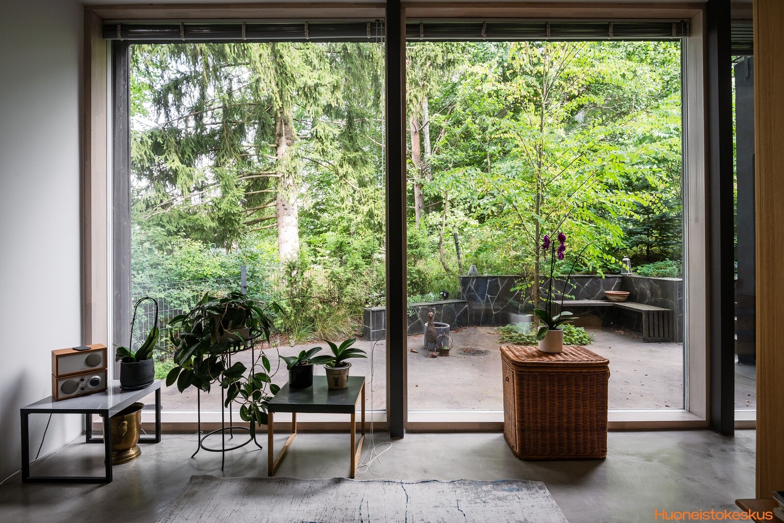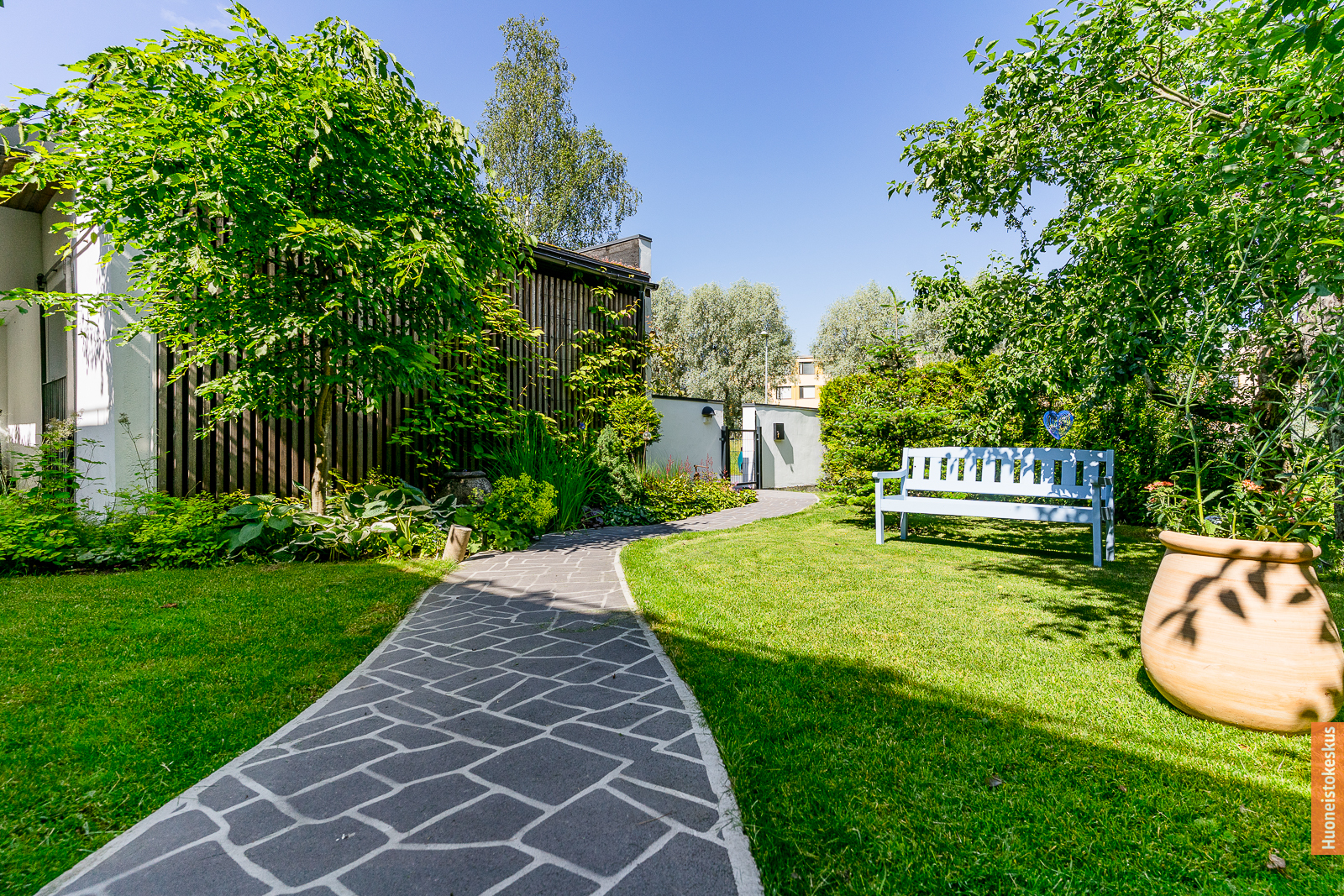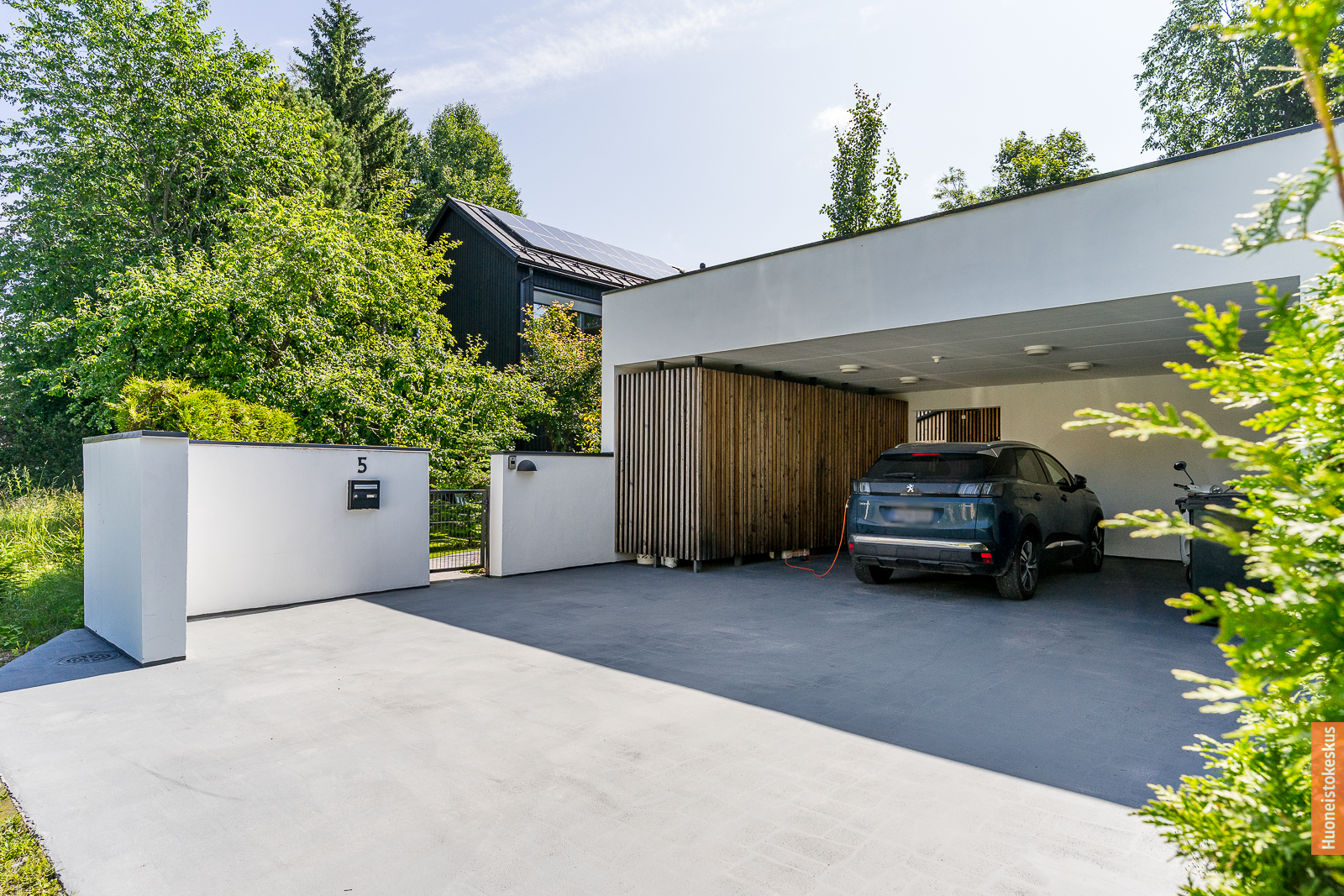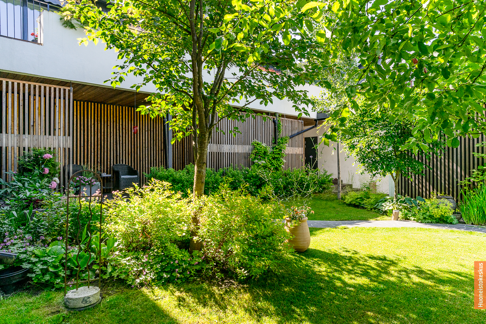 Tontti on vehreä ja huolella suunniteltu – jokainen istutus ja elementti on harkitusti asemoitu osaksi kokonaisuutta. Aidattu ja suojaisa piha, kahden auton katos ja oma maakellari viimeistelevät tämän ainutlaatuisen pihapiirin. Raunistulan alakouluun on matkaa reilu kilometri, Rieskalähteen yläkouluun noin kaksi kilometriä.