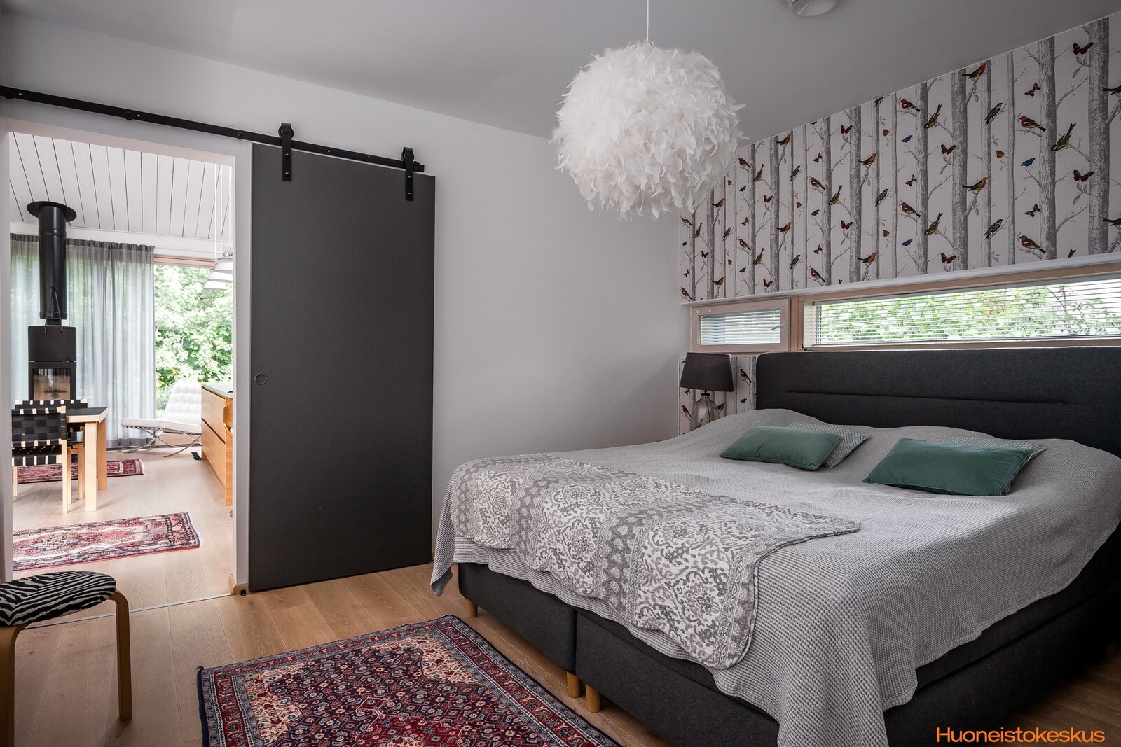| Makuuhuoneen kuvaus | Lukumäärä: 3, Parketti Kährs valkovahattu, öljytty tammi, 1-sauvanen/mikrosementti. |
