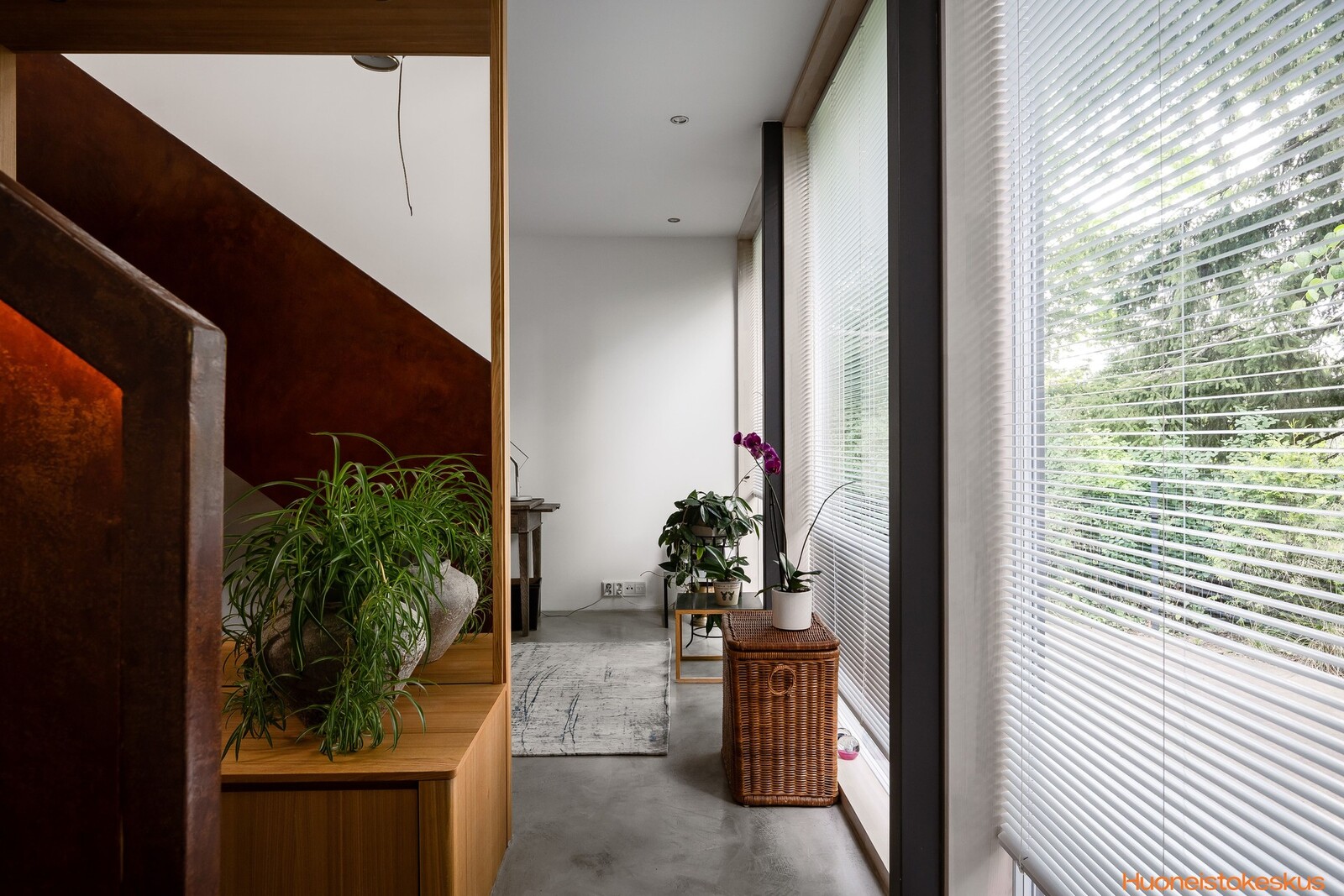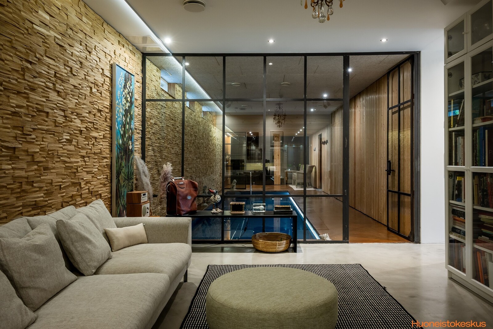 Sisätiloissa korostuvat avaruus ja valo. Avoin keittiö-olohuonekokonaisuus, kolme tilavaa makuuhuonetta sekä arkiolohuone uima-allasosaston yhteydessä muodostavat toimivan ja ylellisen kokonaisuuden, jossa jokainen neliö on tarkoin mietitty. Yläkerran master bedroomin yhteydessä oma kylpyhuone ja tilava vaatehuone. Alakerrassa kaksi makuuhuonetta, arkiolohuone, kodinhoitotila, allasosasto infrasaunoineen ja arkea helpottava kuraeteinen.