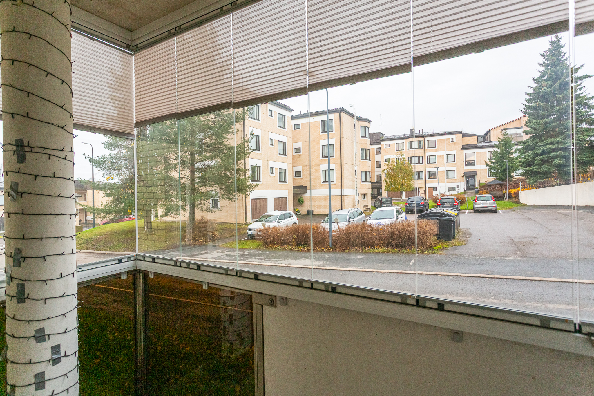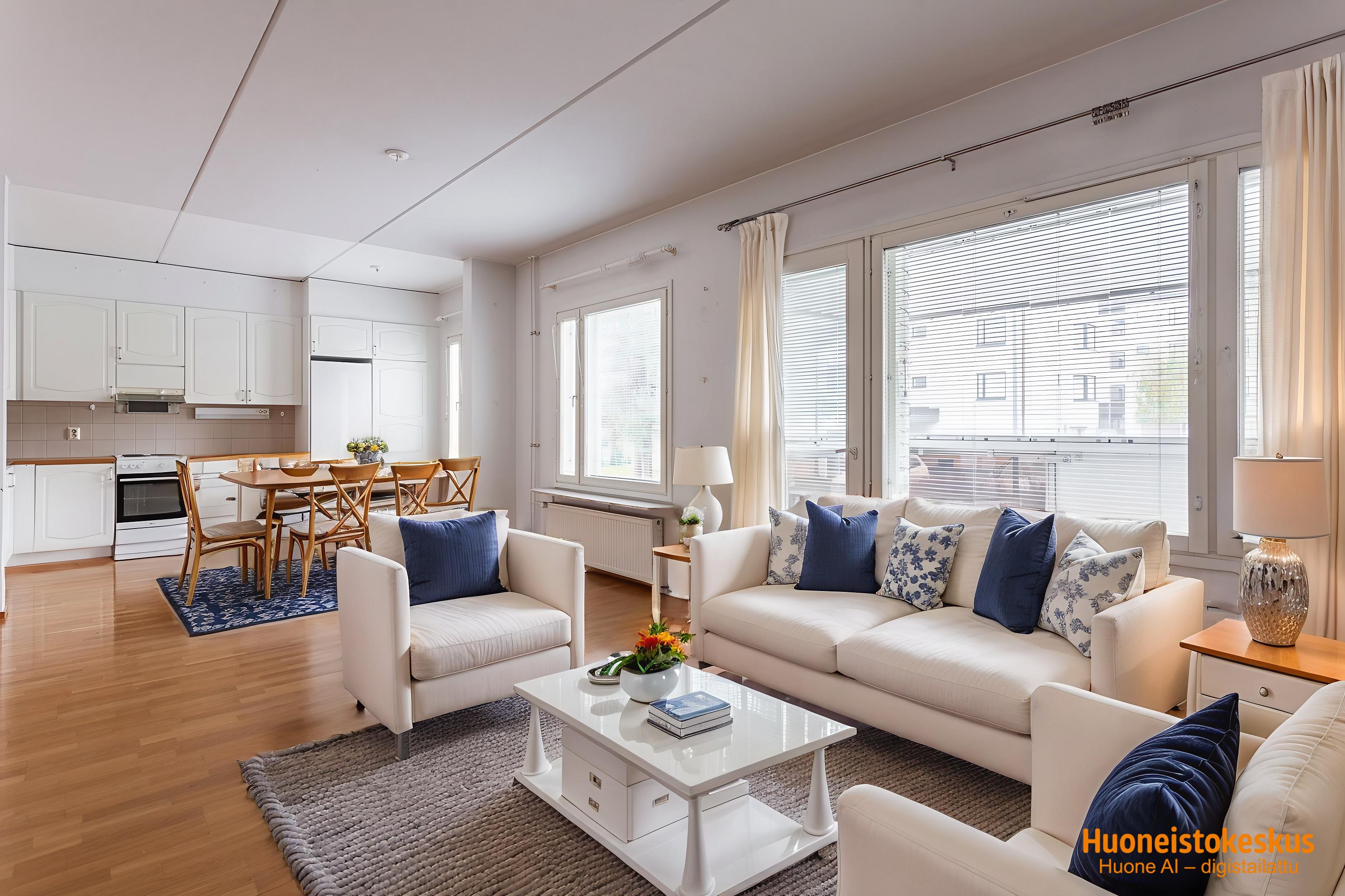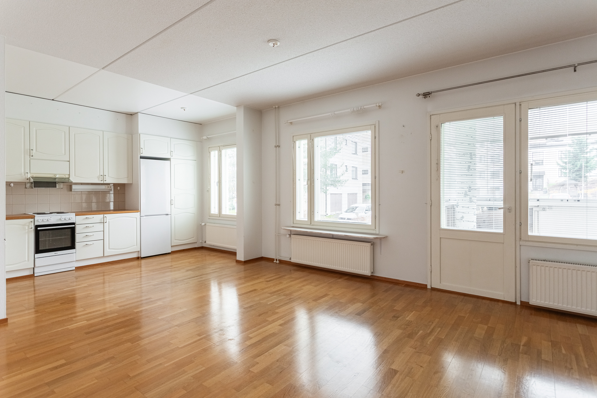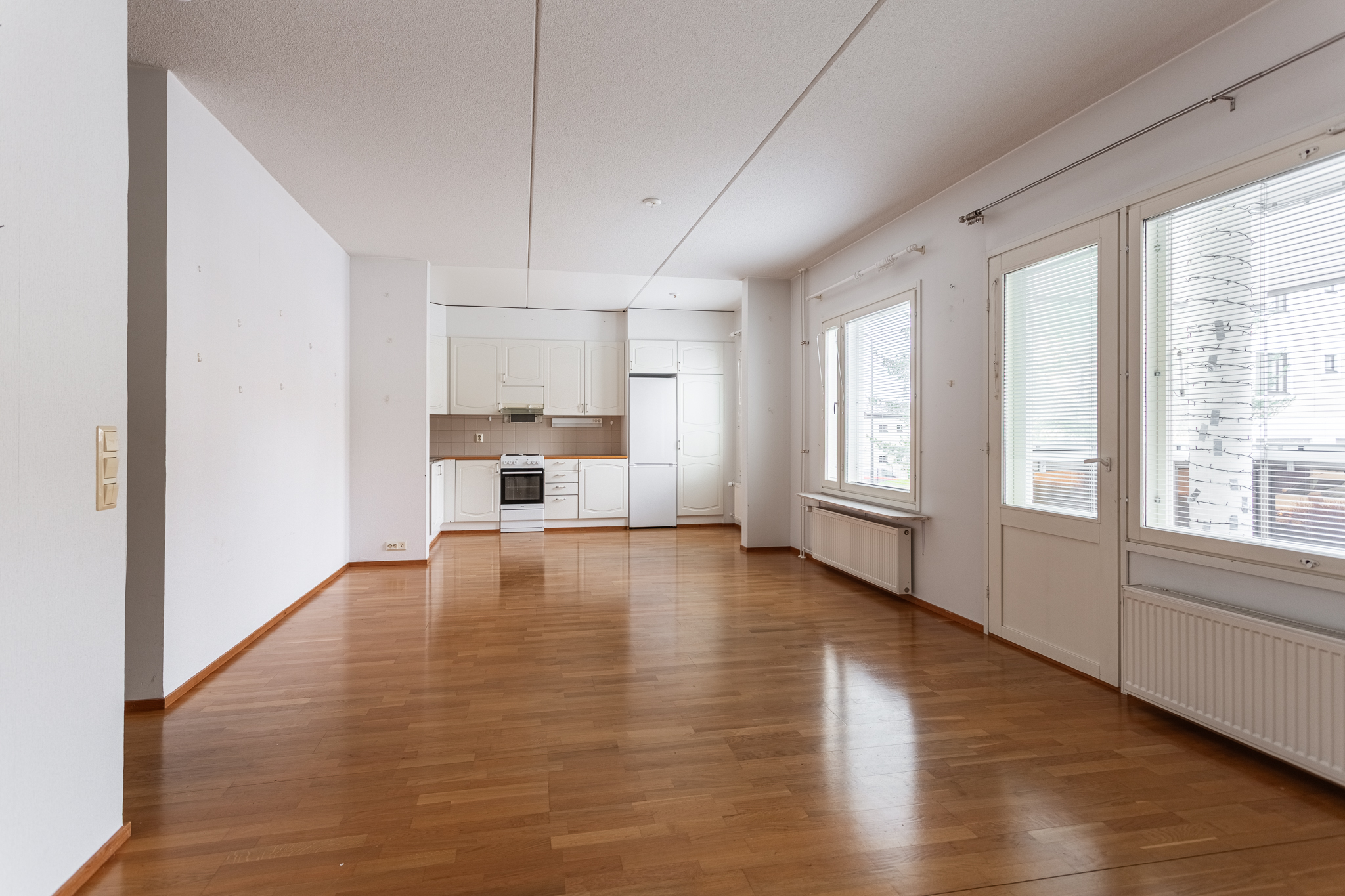 Asunnossa on kauniit siistit parkettilattiat ja maalatut seinäpinnat. Valoisuus ja tilantuntu ovat ilmeistä, keittiön ja olohuoneen ollessa yhtä avonaista tilaa. Olohuoneesta on kulku lasitetulle parvekkeelle joka on sopivasti irti maantasalta. Makuuhuoneessa on mukavasti tilaa ja löytyy myös säilytysratkaisultaan hyvä ja tilava vaatehuone.