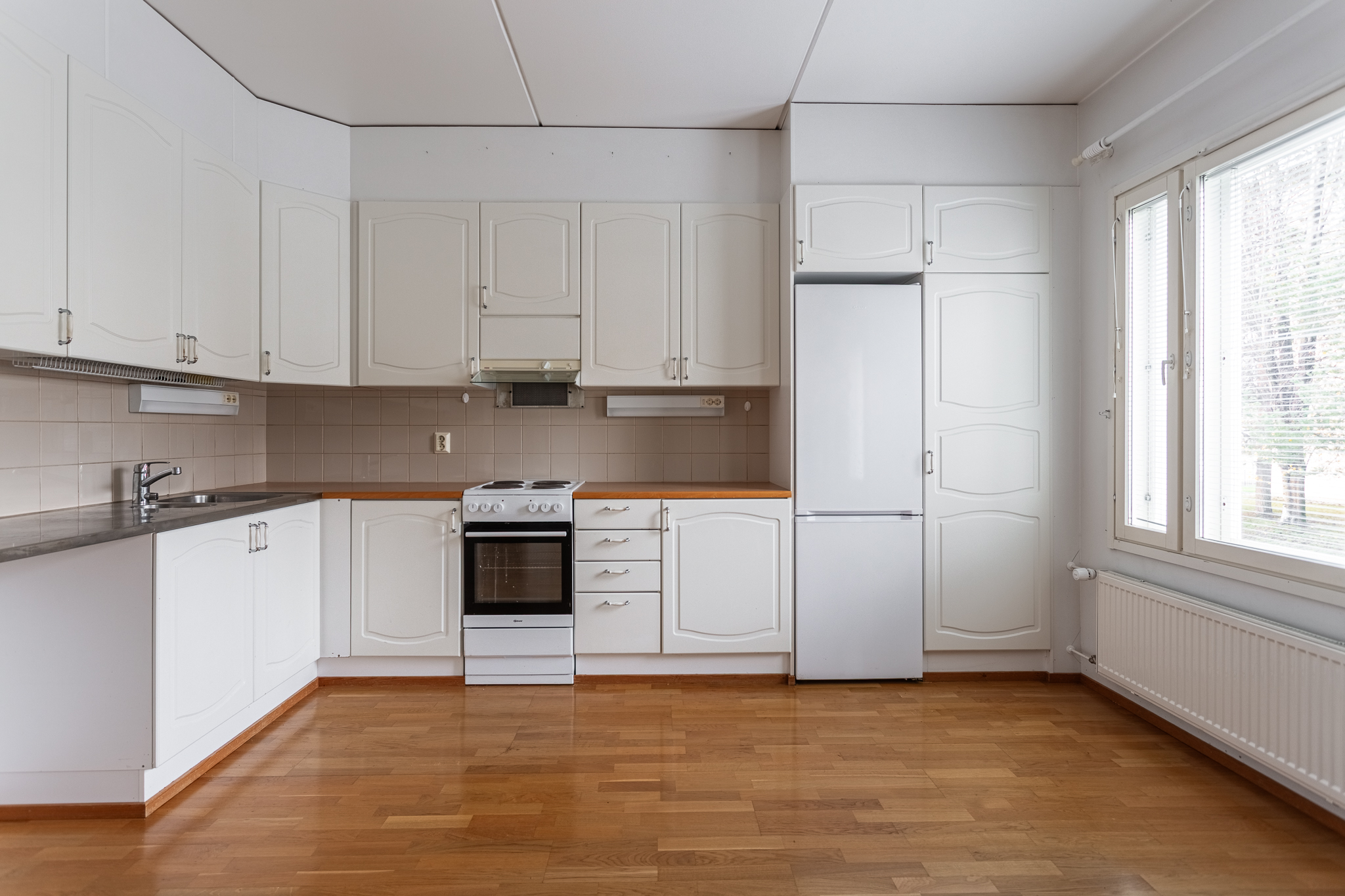 Liesi (Sähköhella), työtasot (laminaatti), seinät (maali ja tapetti), lattiat (parketti), jääkaappipakastin ja liesituuletin |