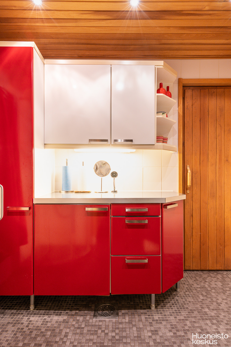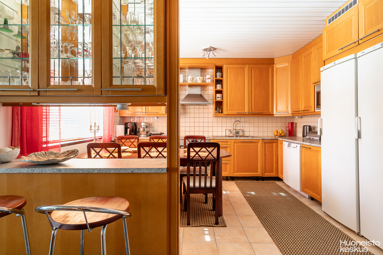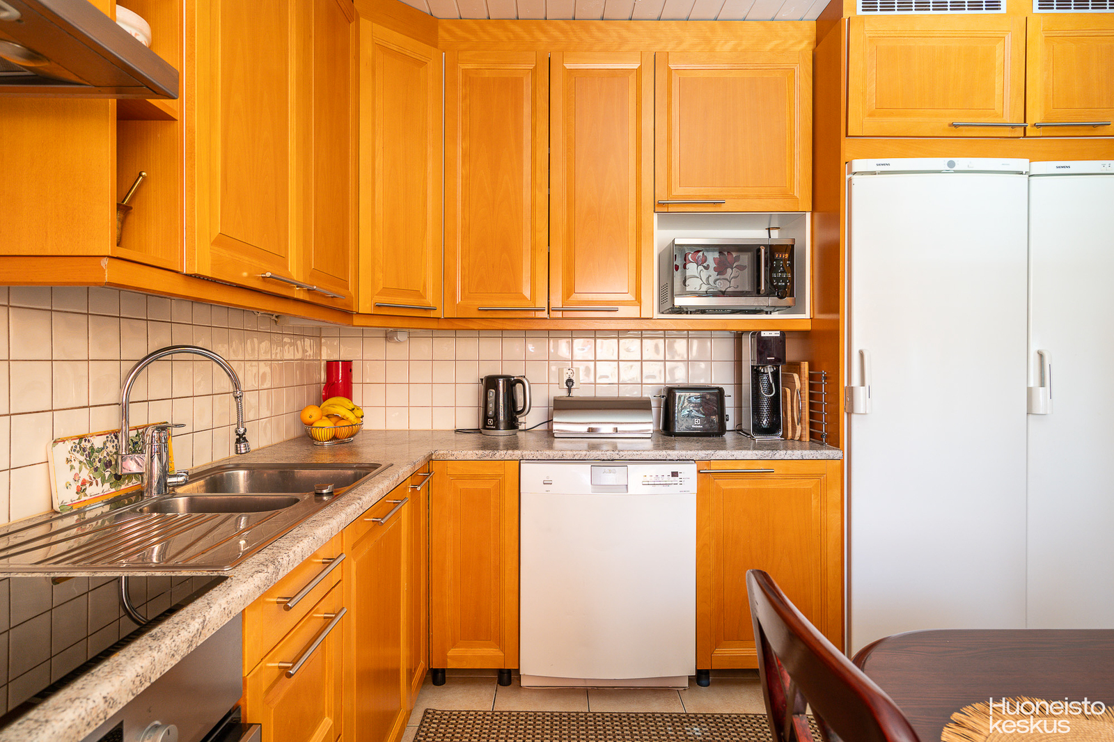 Liesi (Induktioliesi ja erillisuuni), työtasot (laminaatti), seinät (maali), lattiat (laatta), erillisuuni, jääkaappi, erillinen pakastin, liesi, astianpesukone ja liesituuletin / hormi, kiinteät valaisimet |