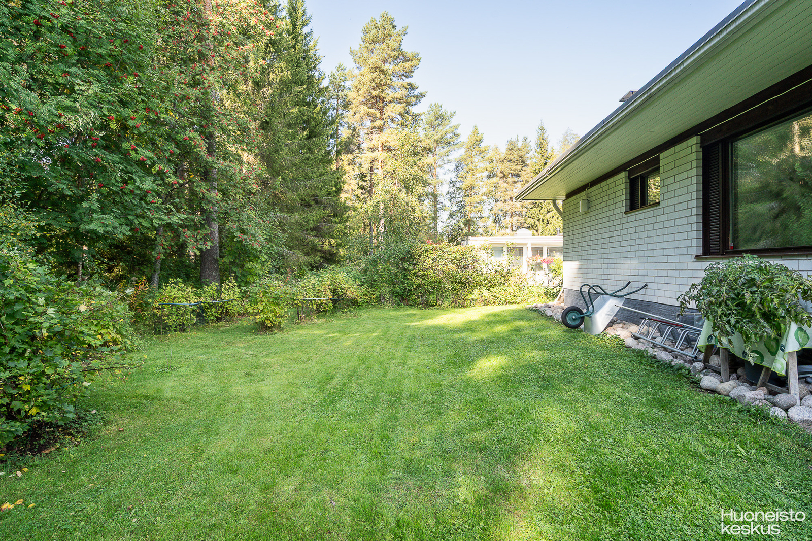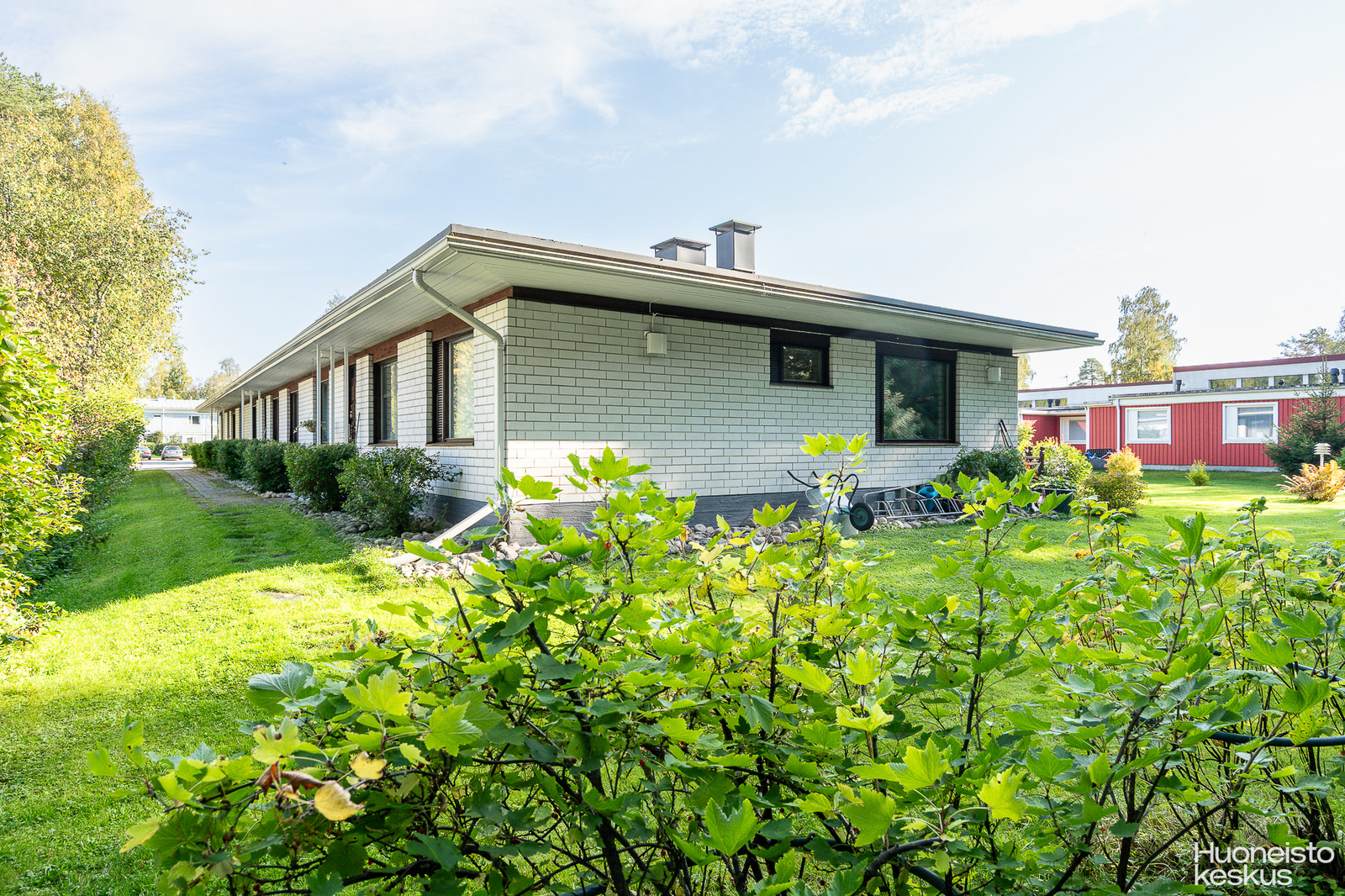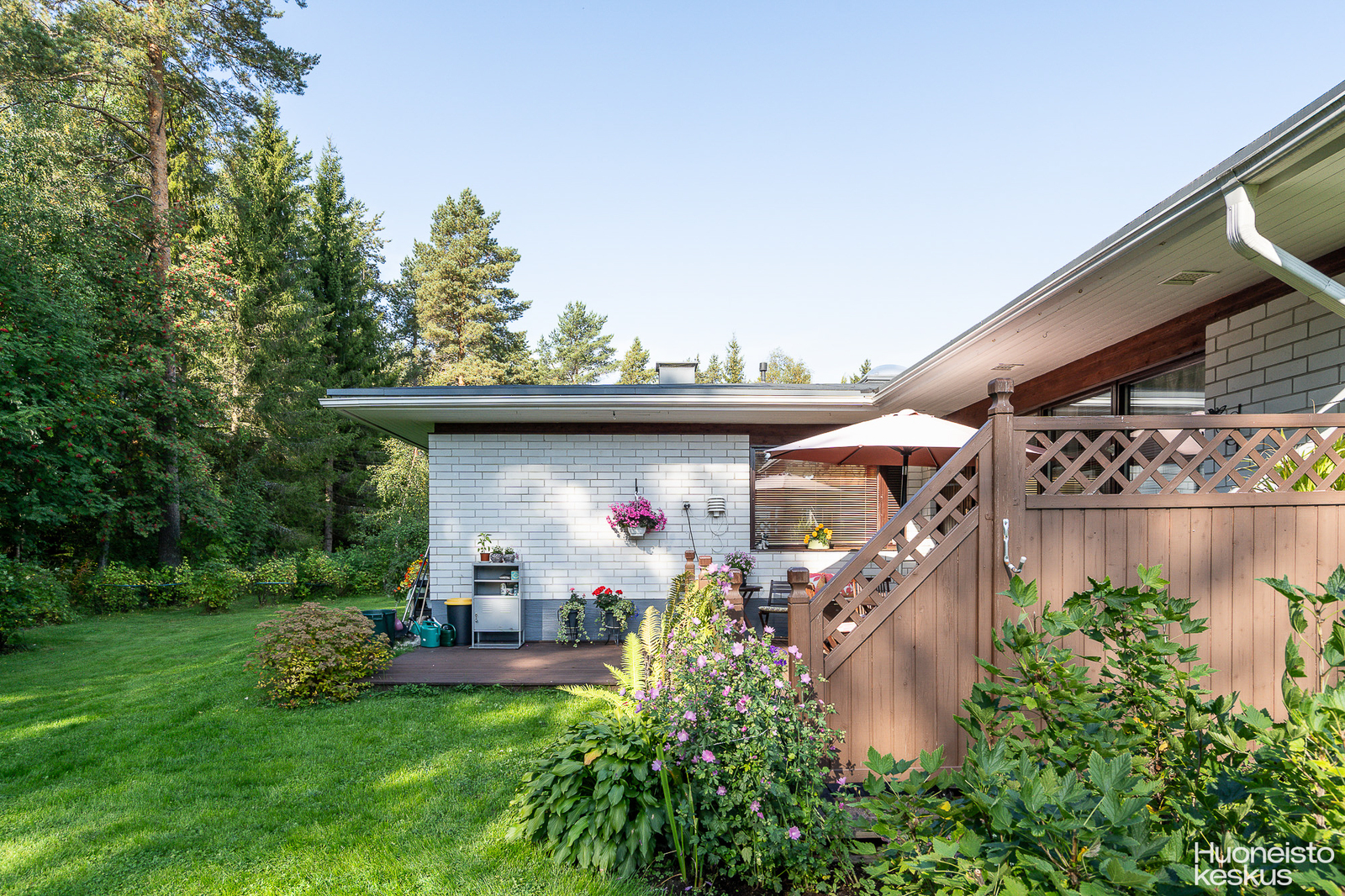 Tämän päätyhuoneiston suuri takapiha rajoittuu metsäkaistaleeseen ja on siten rauhallinen.