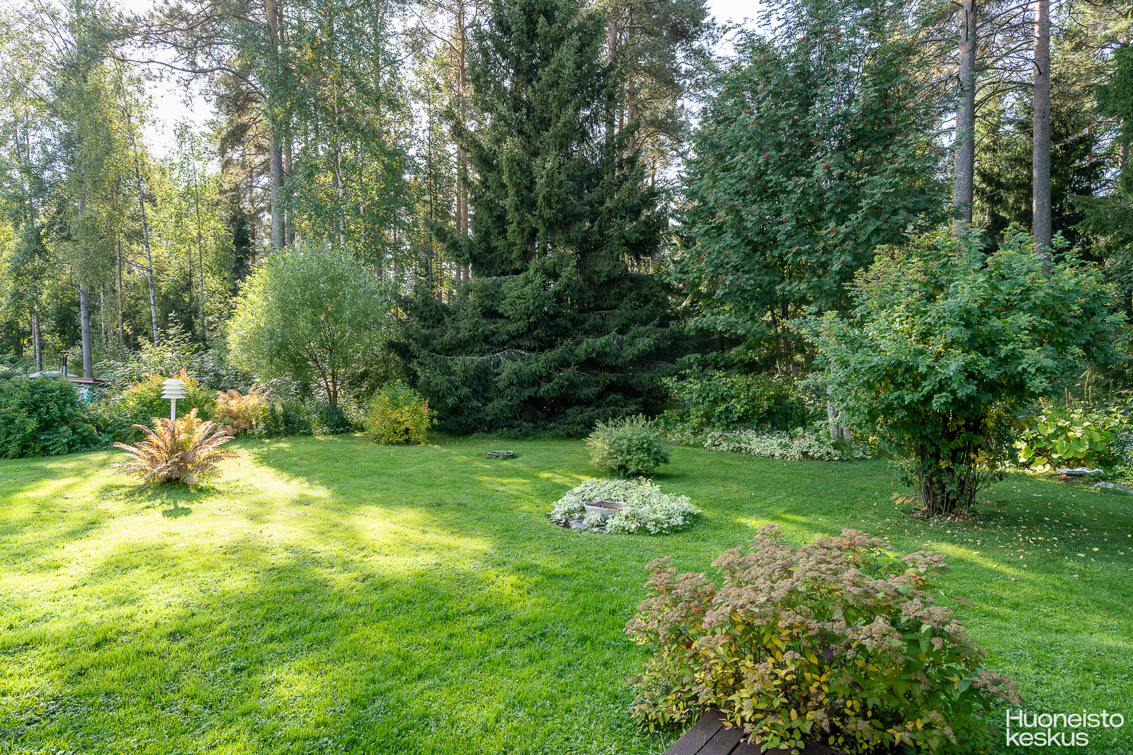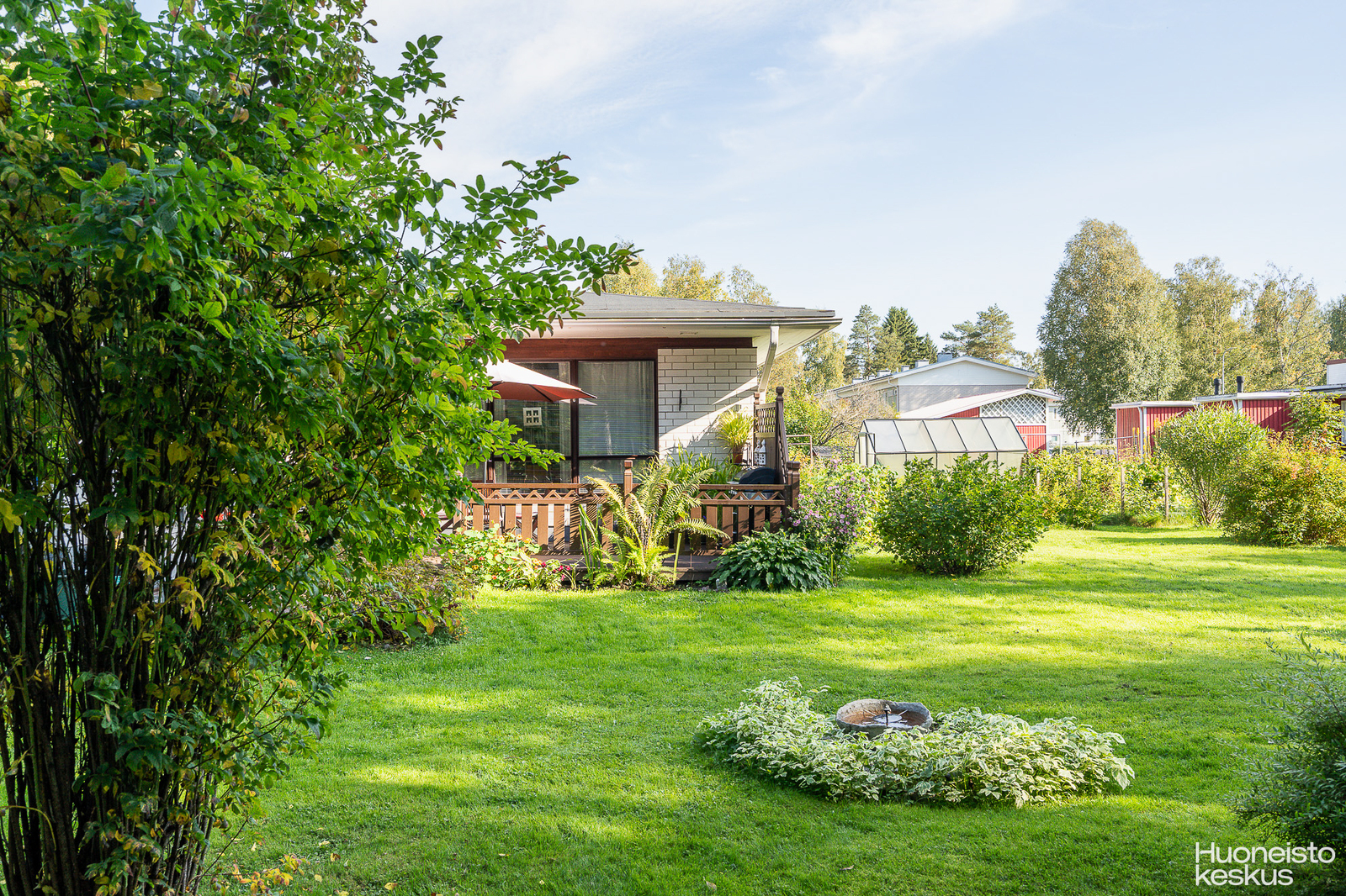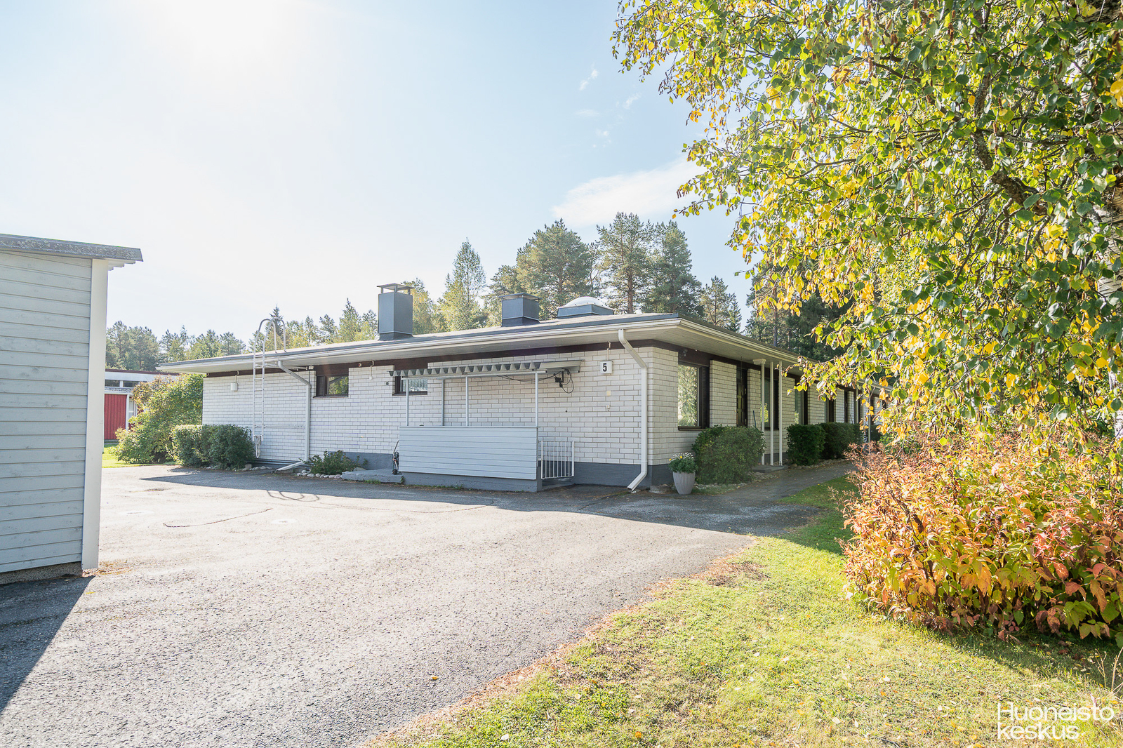Tämän päätyhuoneiston suuri takapiha rajoittuu metsäkaistaleeseen ja on siten rauhallinen.