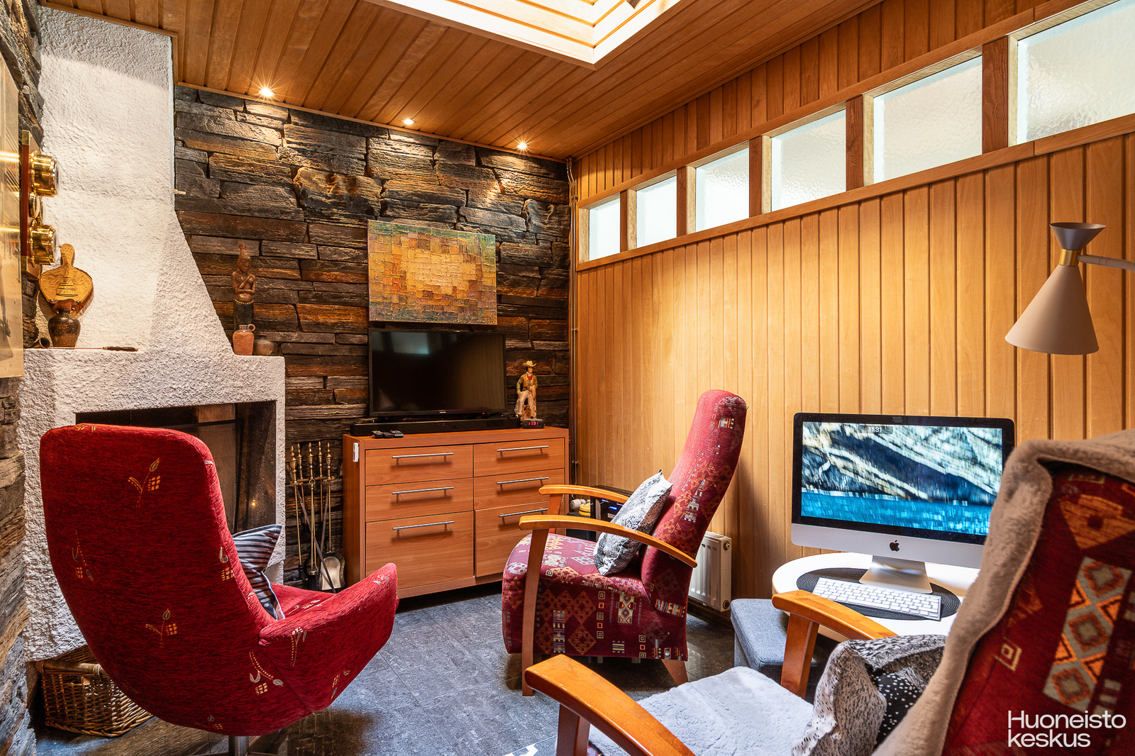 Upeat kattoikkunat tuovat oman valoisan tunnelmansa. Saunan jälkeen on kiva nauttia vaikka takkatulen lämmössä.
