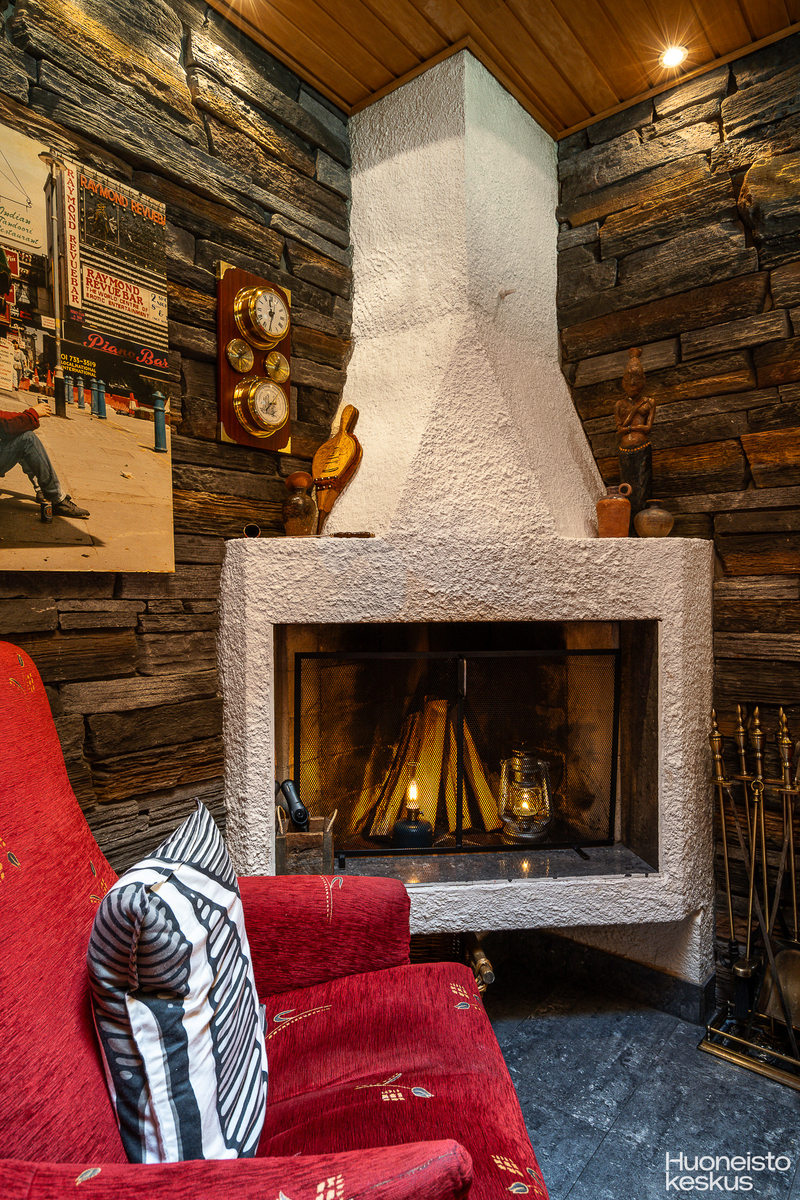 Yhdessä makuuhuoneessa, takkahuoneessa ja saunassa yksi koristekiviseinä. |