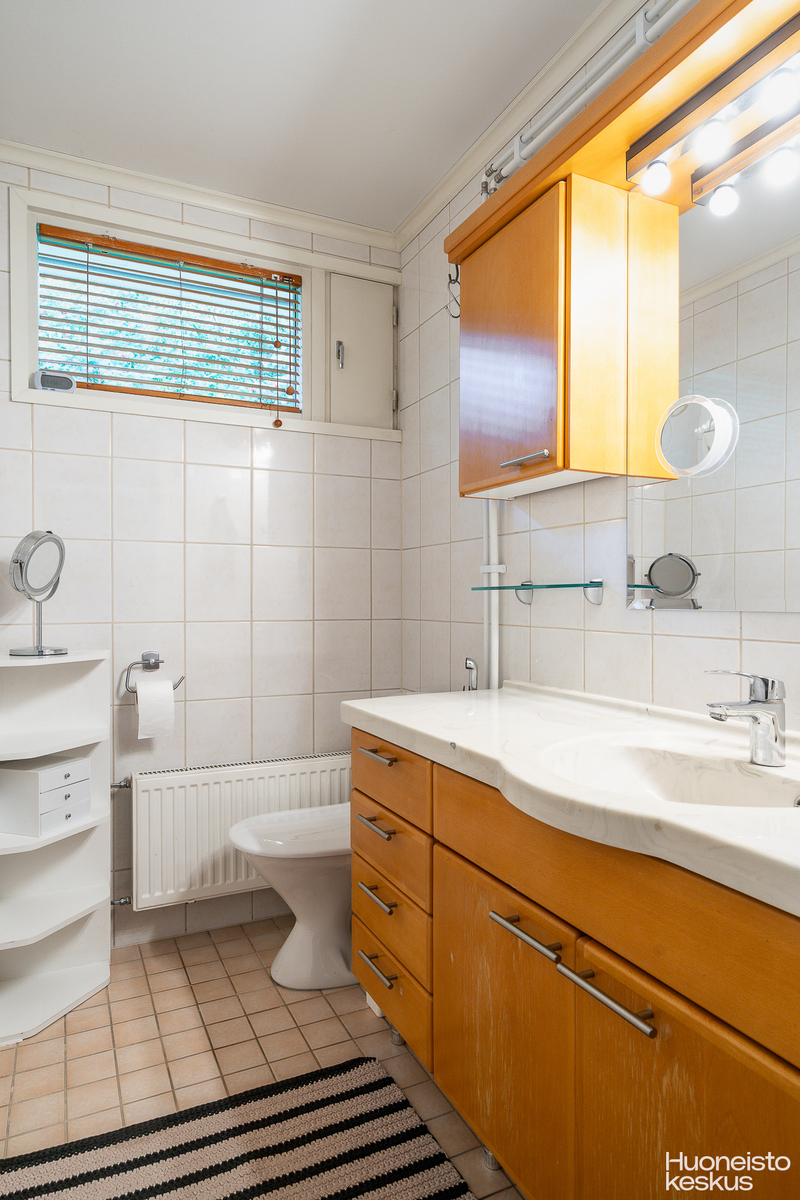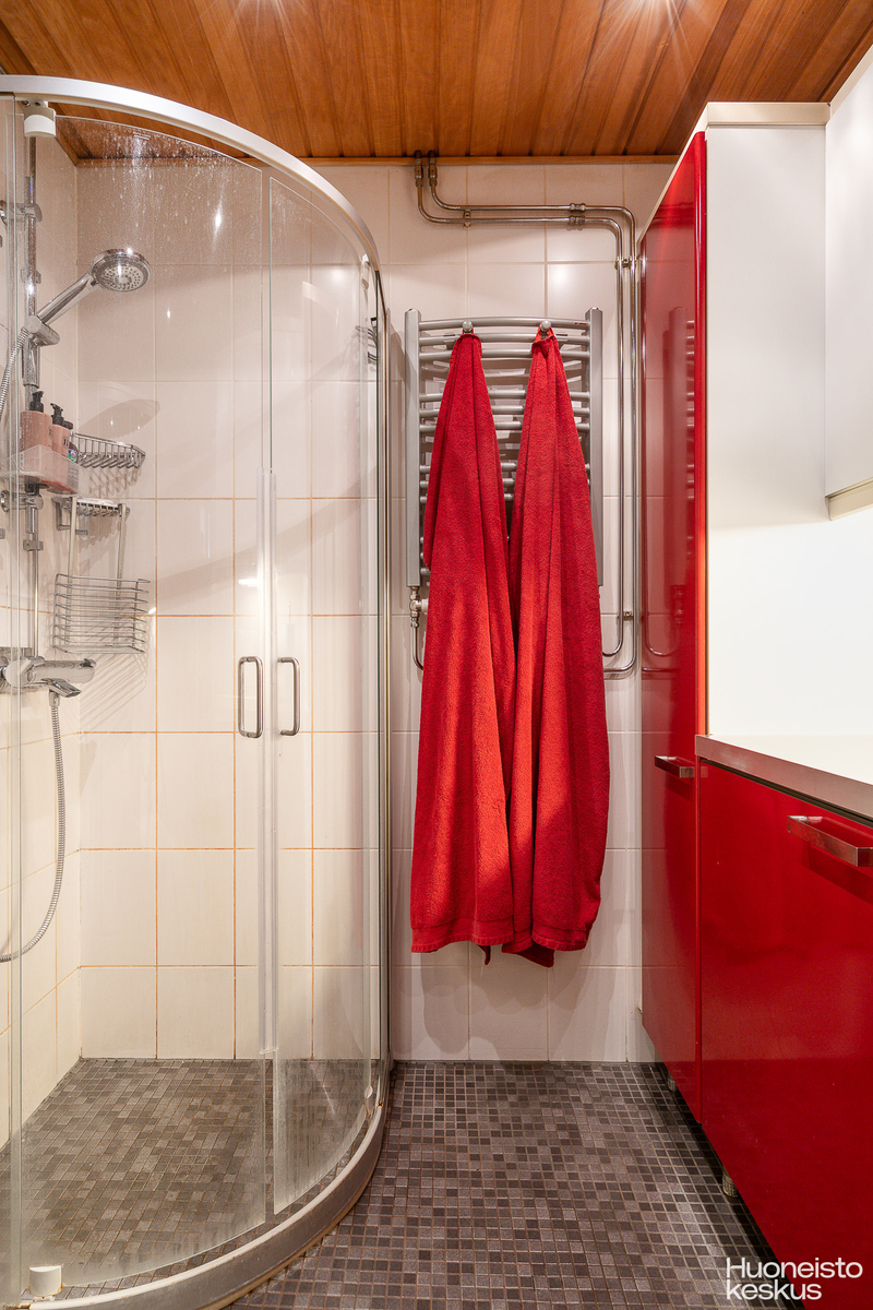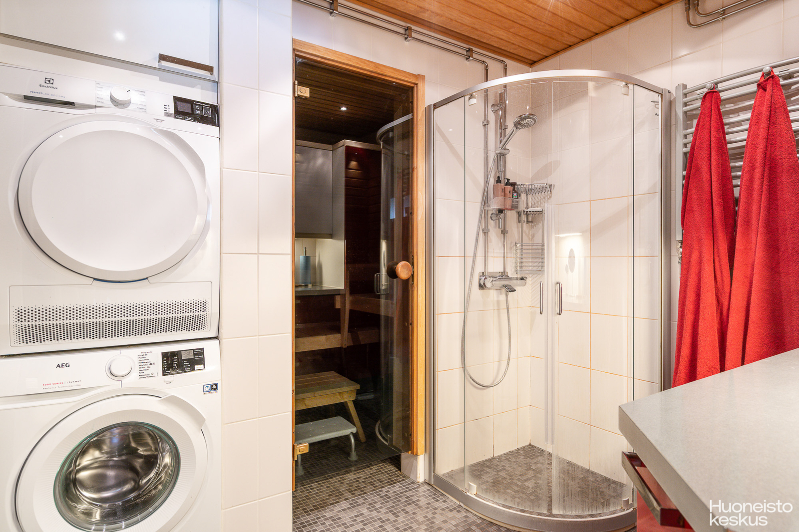 Allaskaappi, suihku, lattialämmitys, pesukoneliitäntä, suihkukaappi ja asennettuja erikoisvarusteita (pyyhepatteri), seinät (kaakeli), lattiat (laatta) |