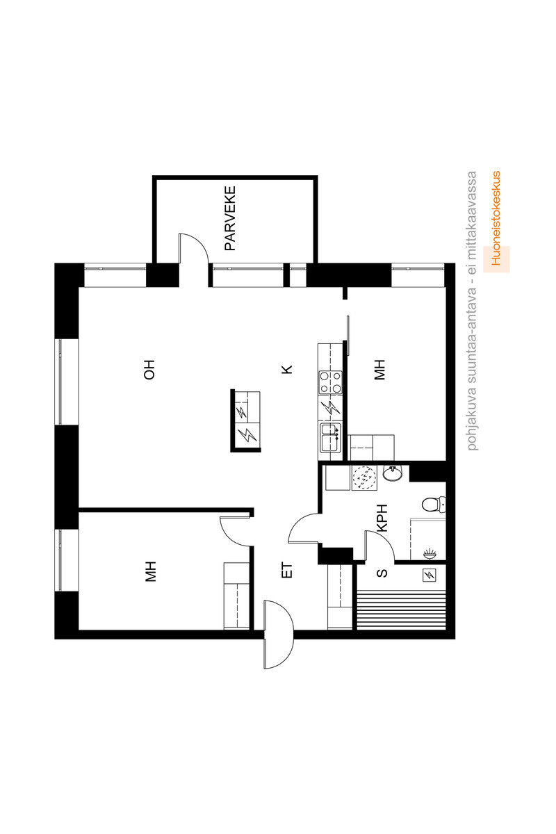 | Huoneistoselitelmä | 3 h, avokeittiö, kh/wc, s, lasitettu parveke (Yj 3h+k+s) |
