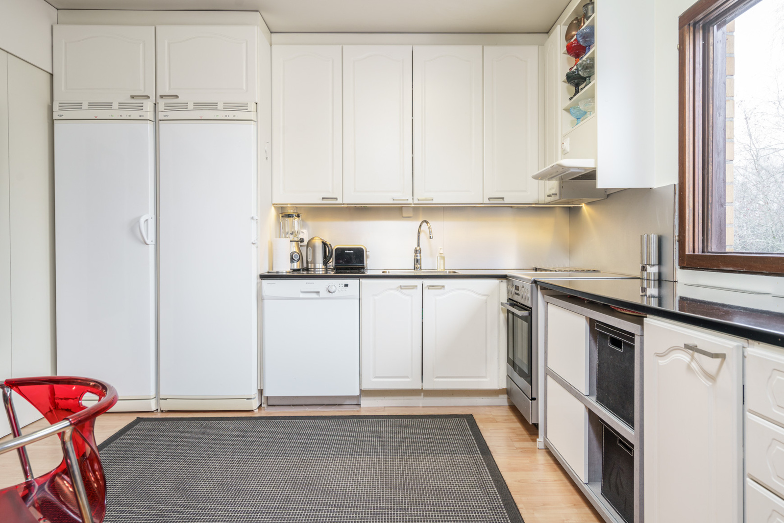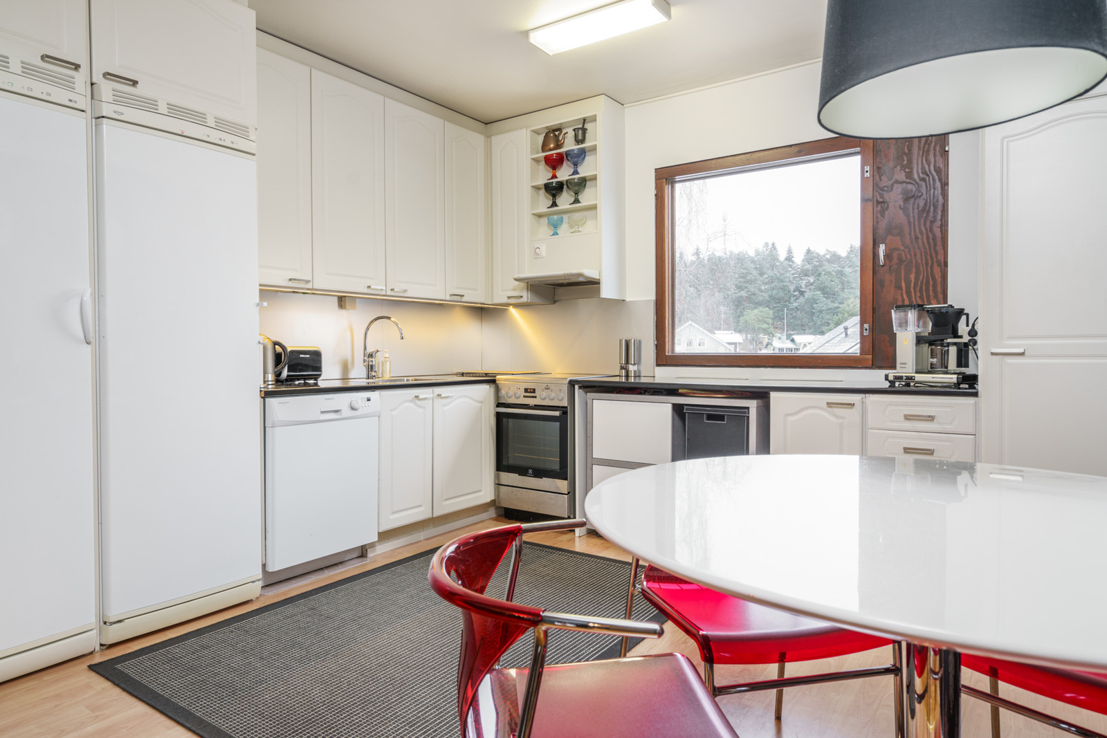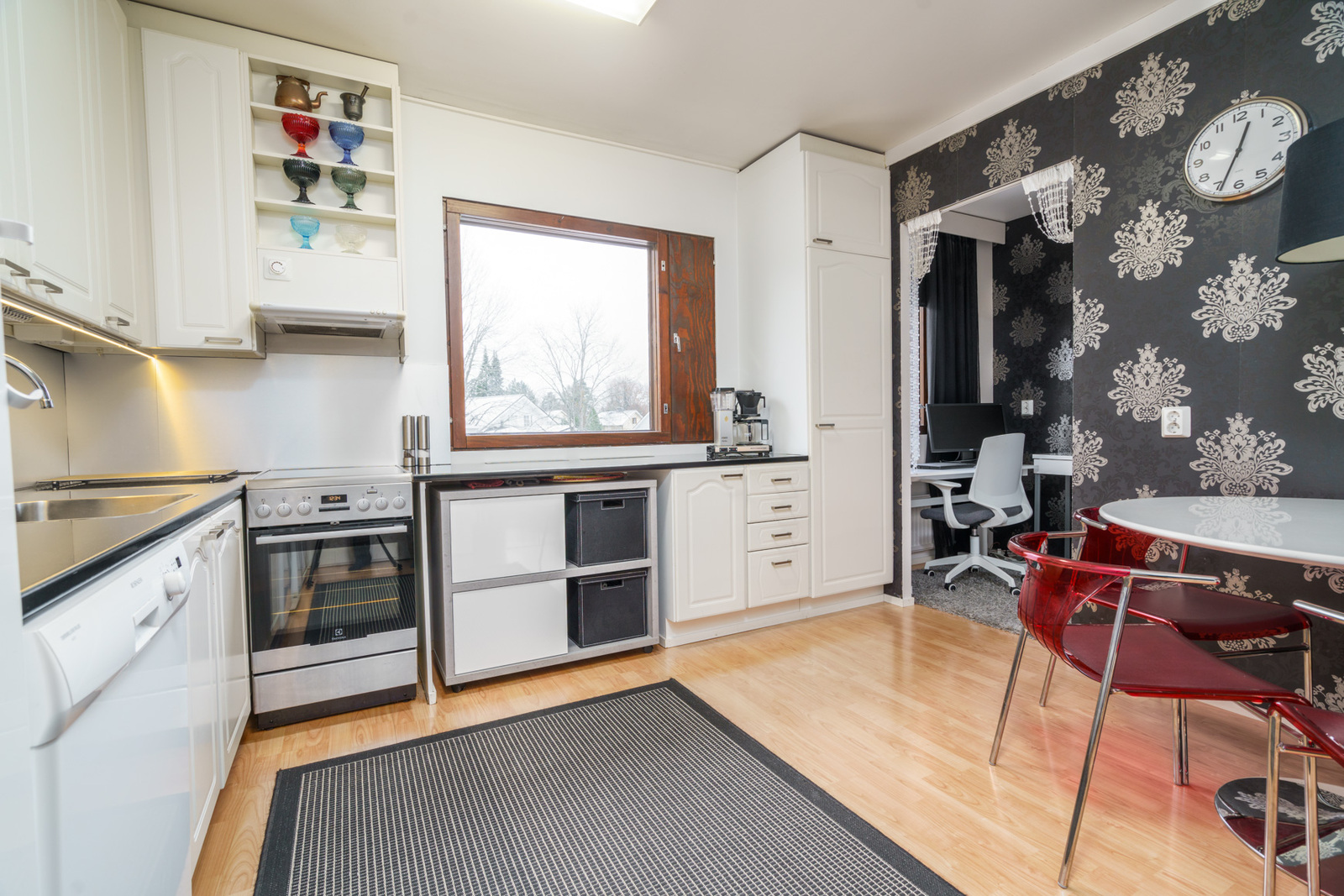 Liesi (Induktioliesi), seinät (maali), lattiat (laminaatti), jääkaappi, liesi, erillinen pakastin ja astianpesukone |